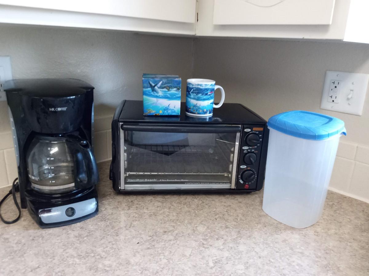 HAMILTON BEACH TOASTER OVEN, COFFEE MUG, FOOD STORAGE CONTAINER AND A MR COFFEE MAKER