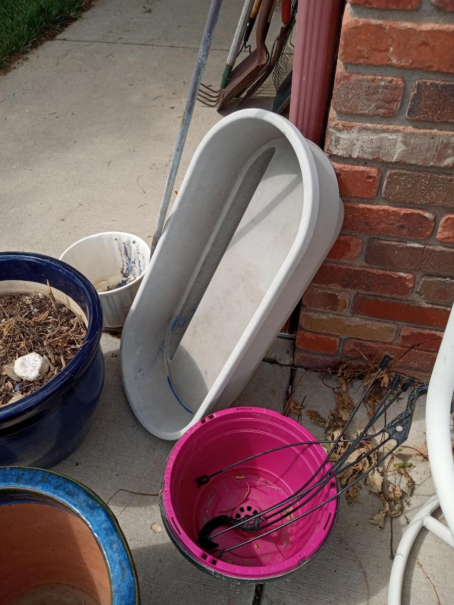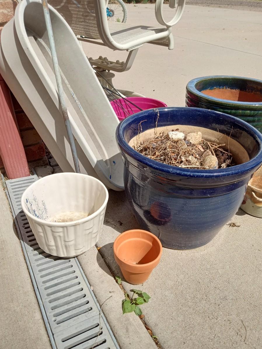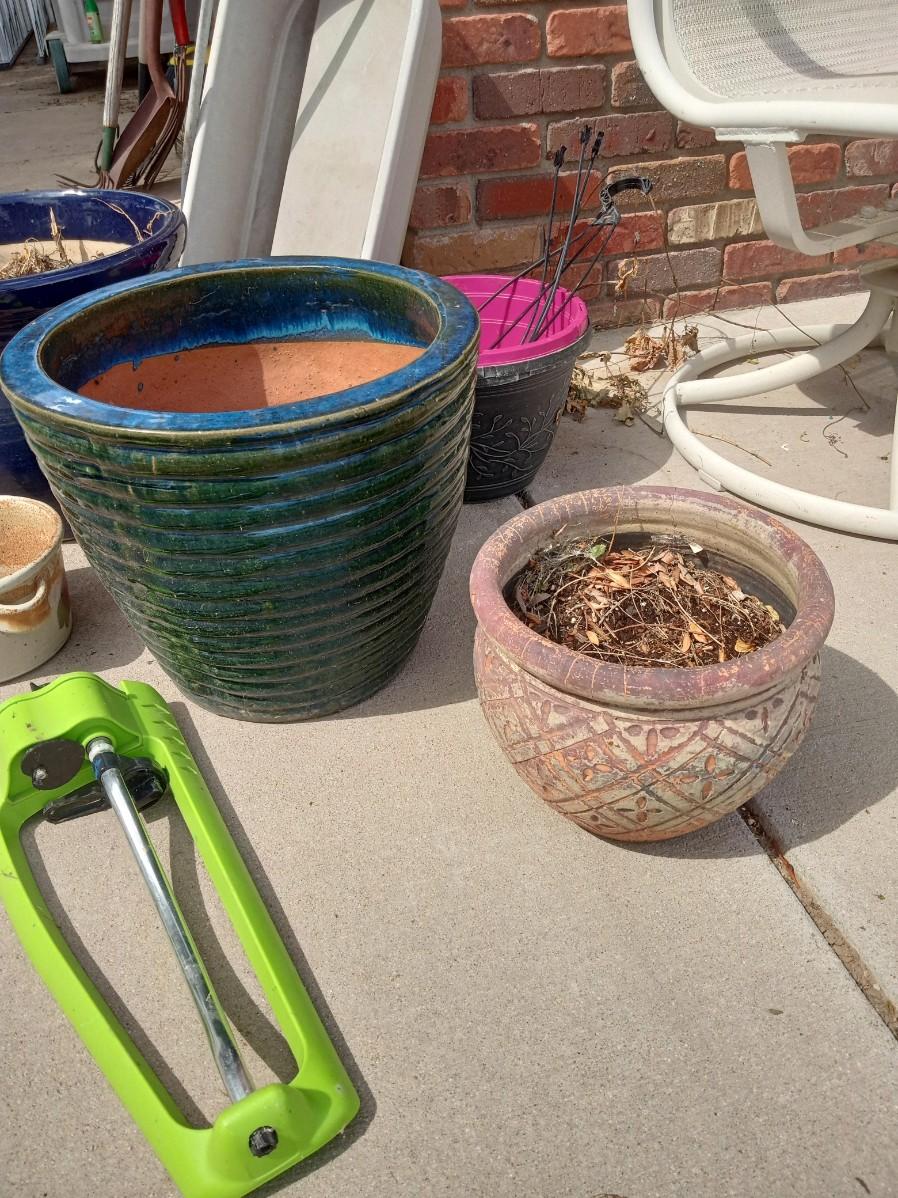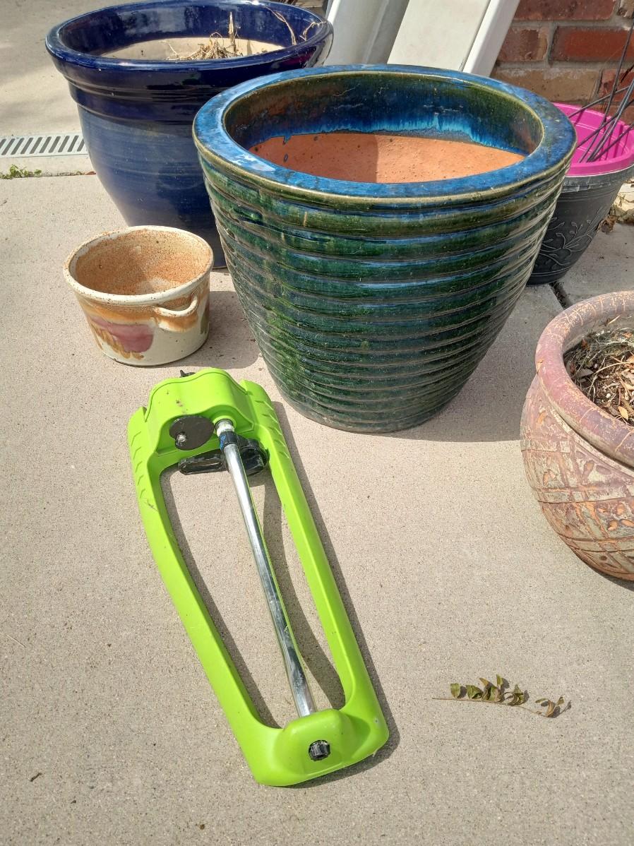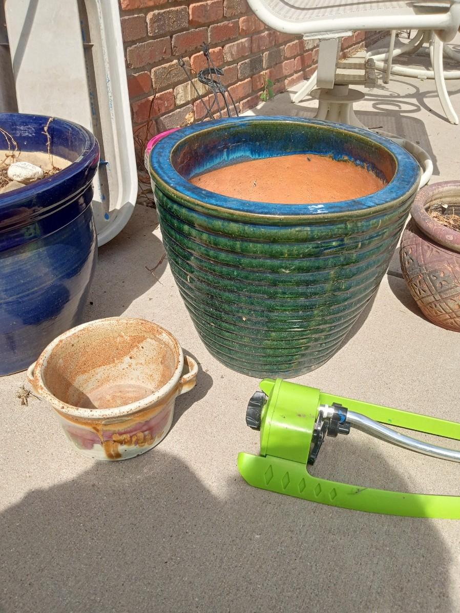 LOT 338 ASSORTMENT OF FLOWER POTS, SPRINKLER AND SHEPHERD'S HOOK (OB)