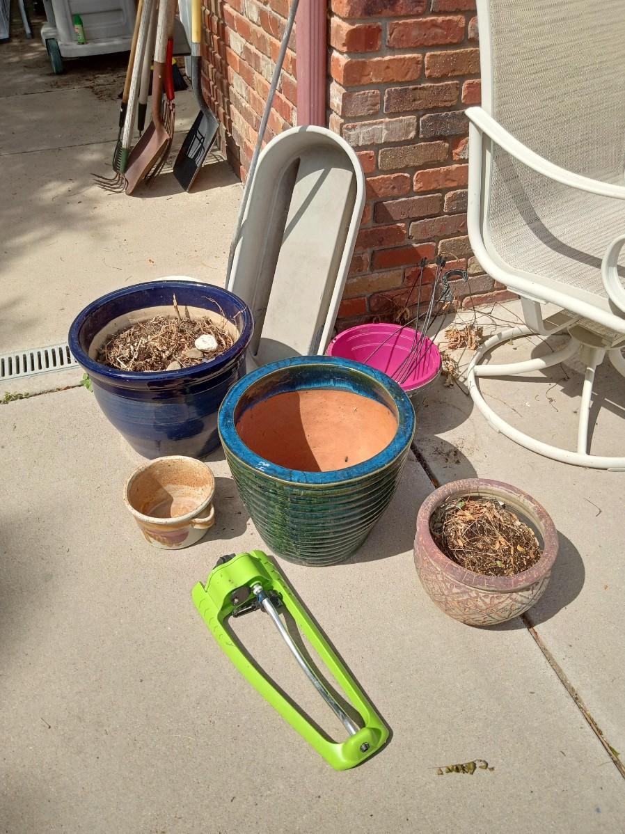 LOT 338  ASSORTMENT OF FLOWER POTS, SPRINKLER AND SHEPHERD'S HOOK (OB)