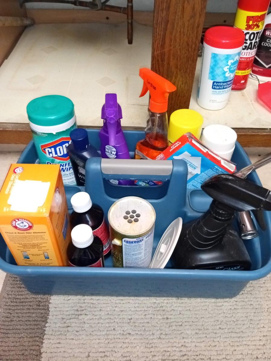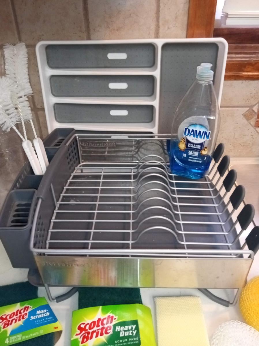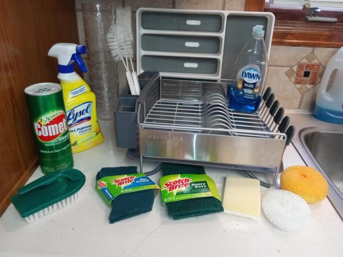 LOT 338 KITCHEN AID DISH DRYING RACK, CLEANING SUPPLIES & DRAWER ORGANIZER