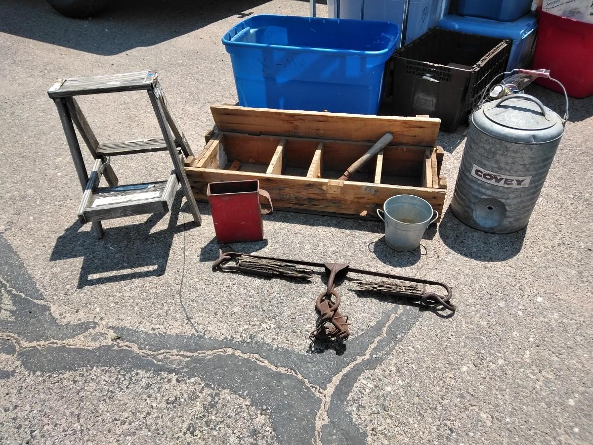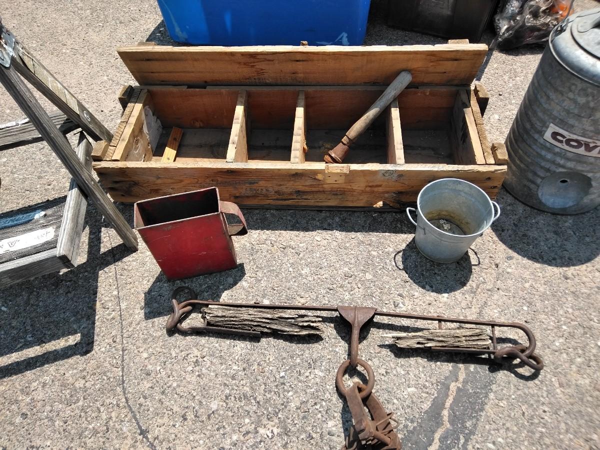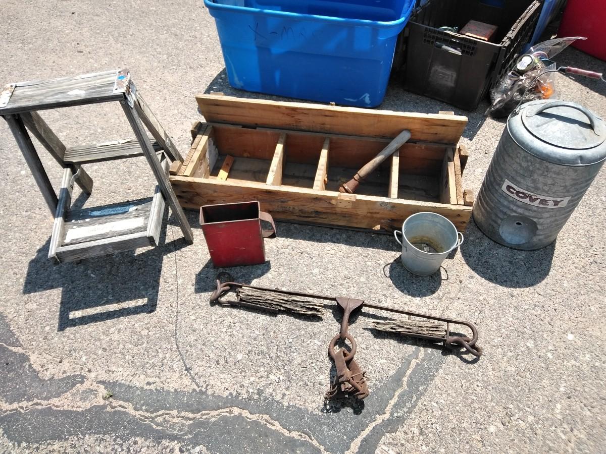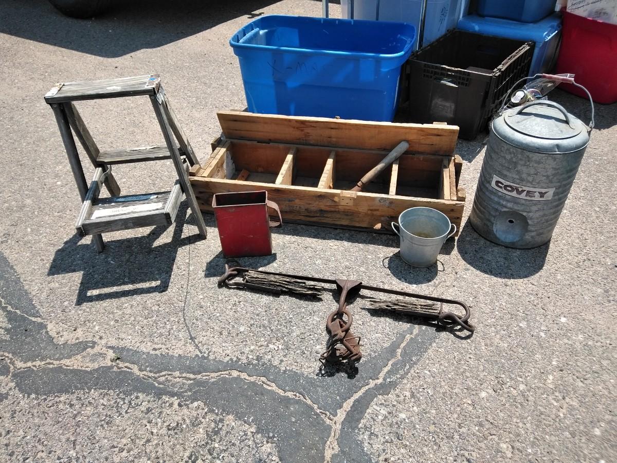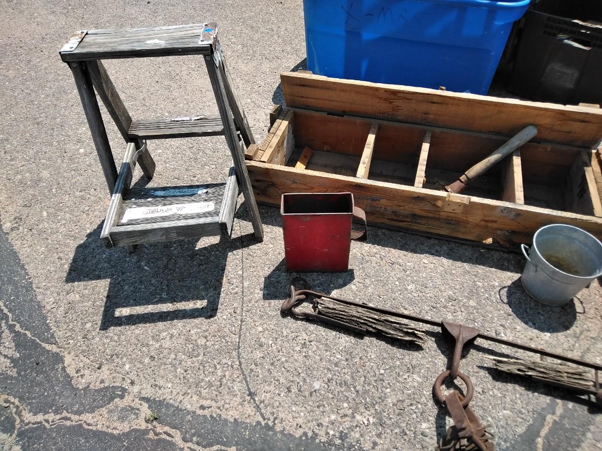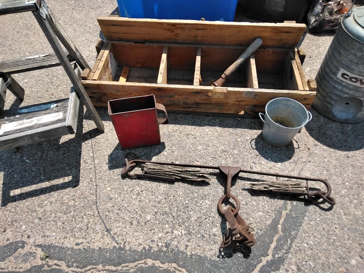 GREAT ITEMS TO REPURPOSE OR DISPLAY! VINTAGE FARM ITEMS, WOOD CRATE WITH LID, OLD LADDER (NOT FOR USE) TIN BUCKETS, AND MORE