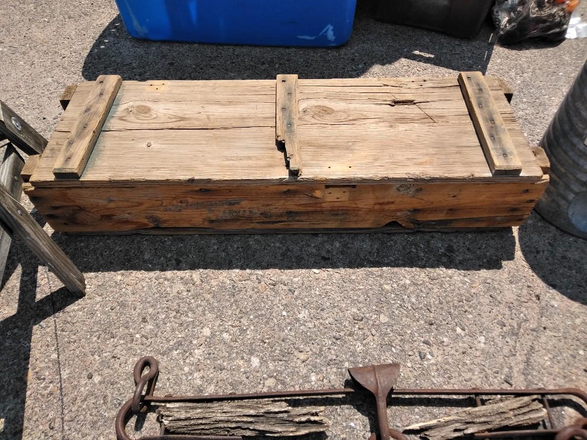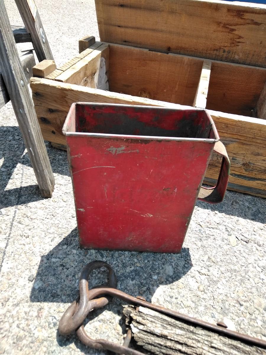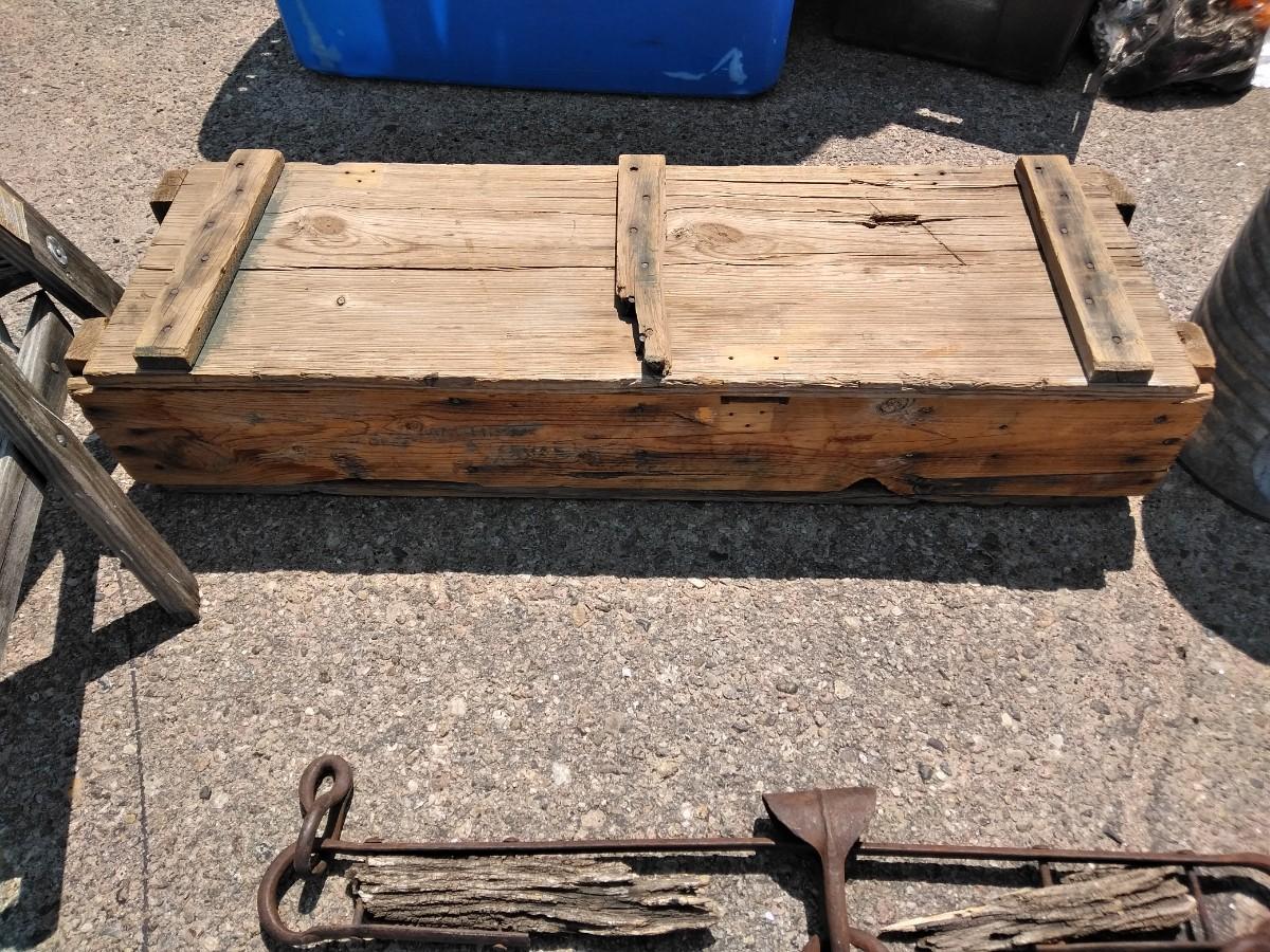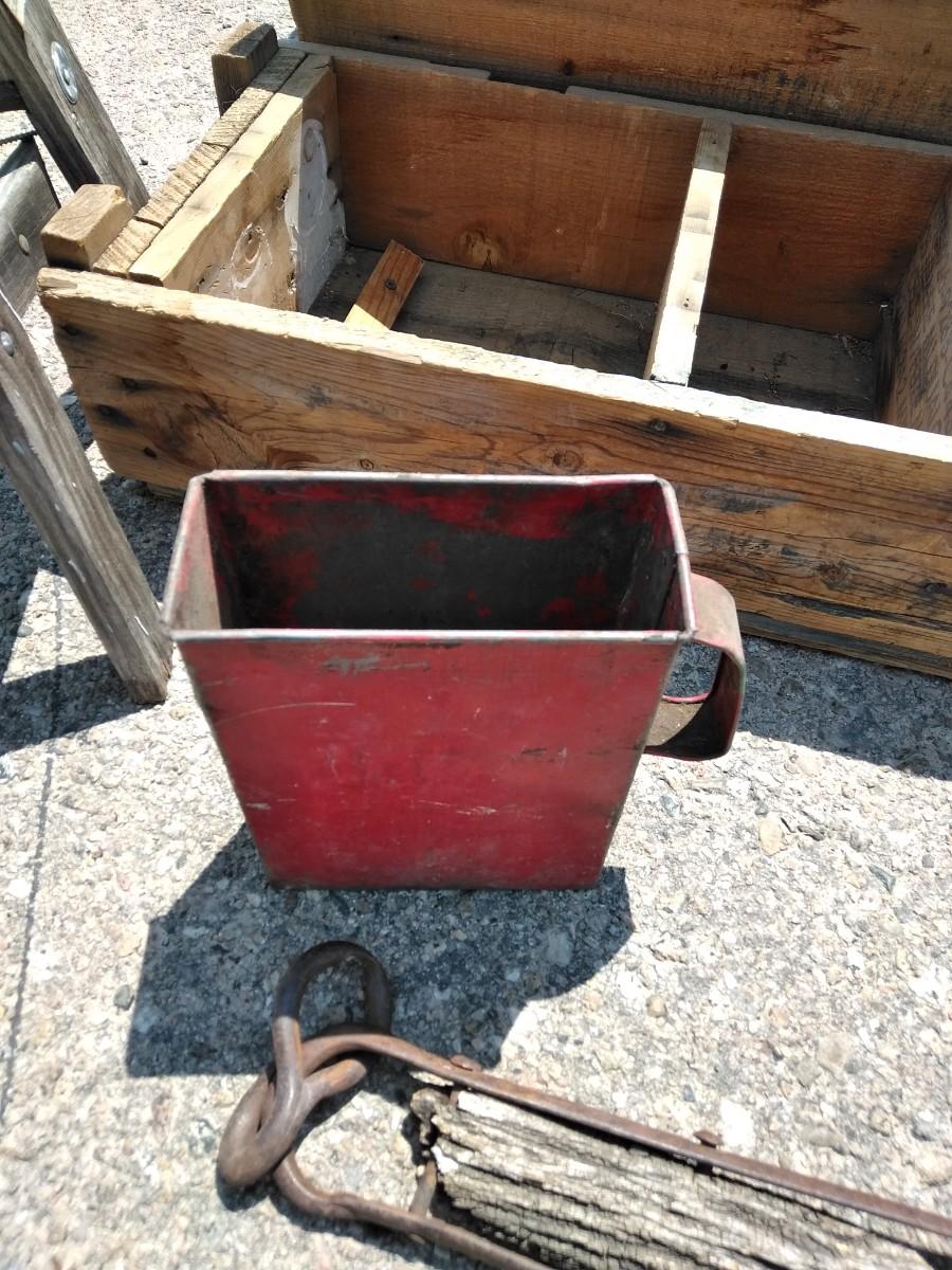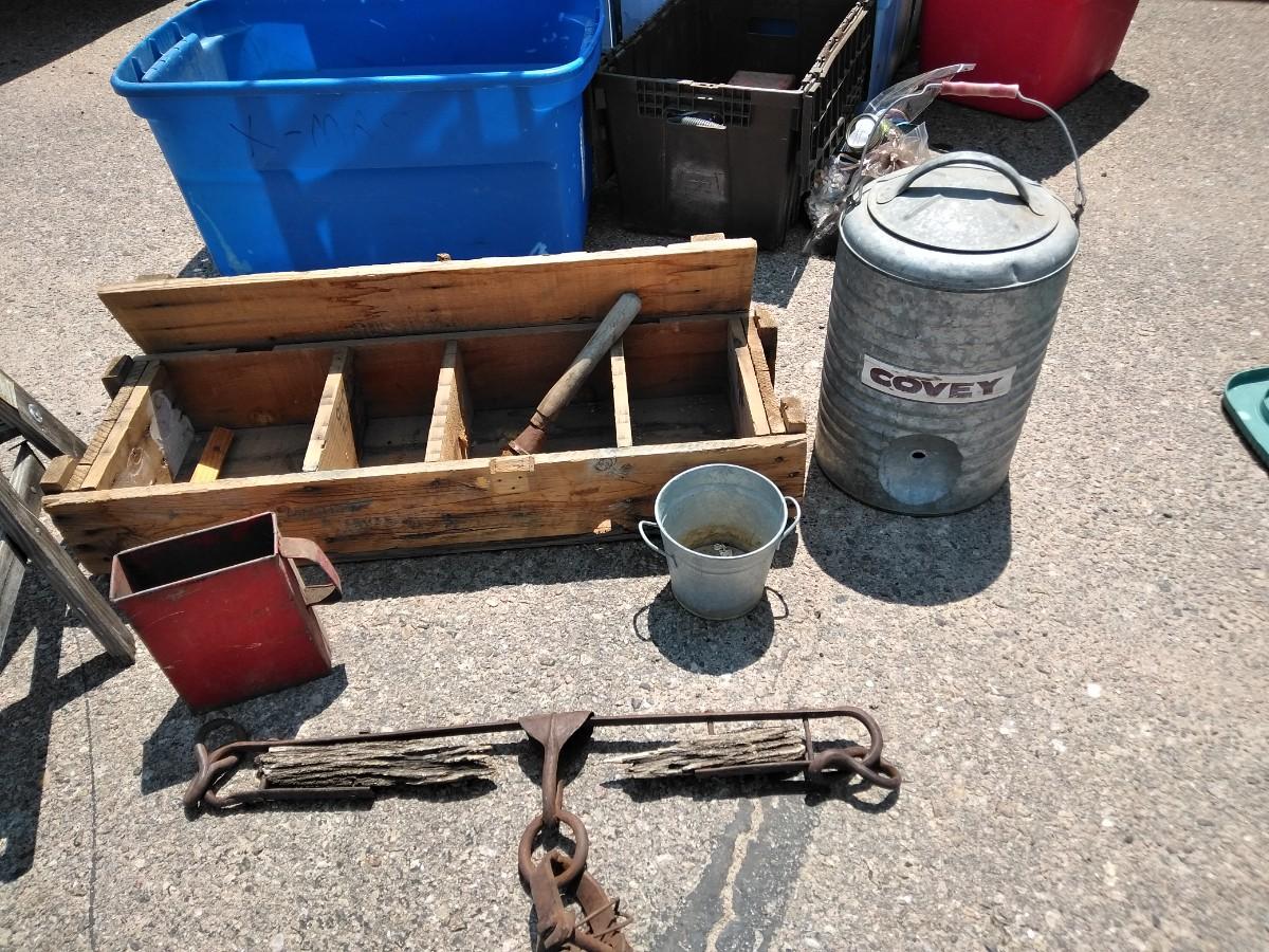 GREAT ITEMS TO REPURPOSE OR DISPLAY! VINTAGE FARM ITEMS, WOOD CRATE WITH LID, OLD LADDER (NOT FOR USE) TIN BUCKETS, AND MORE