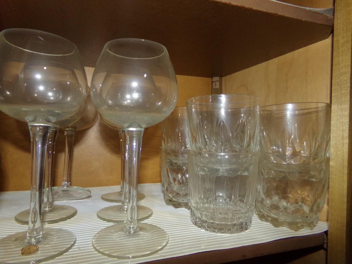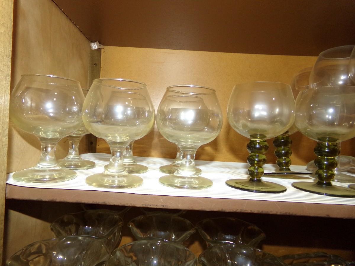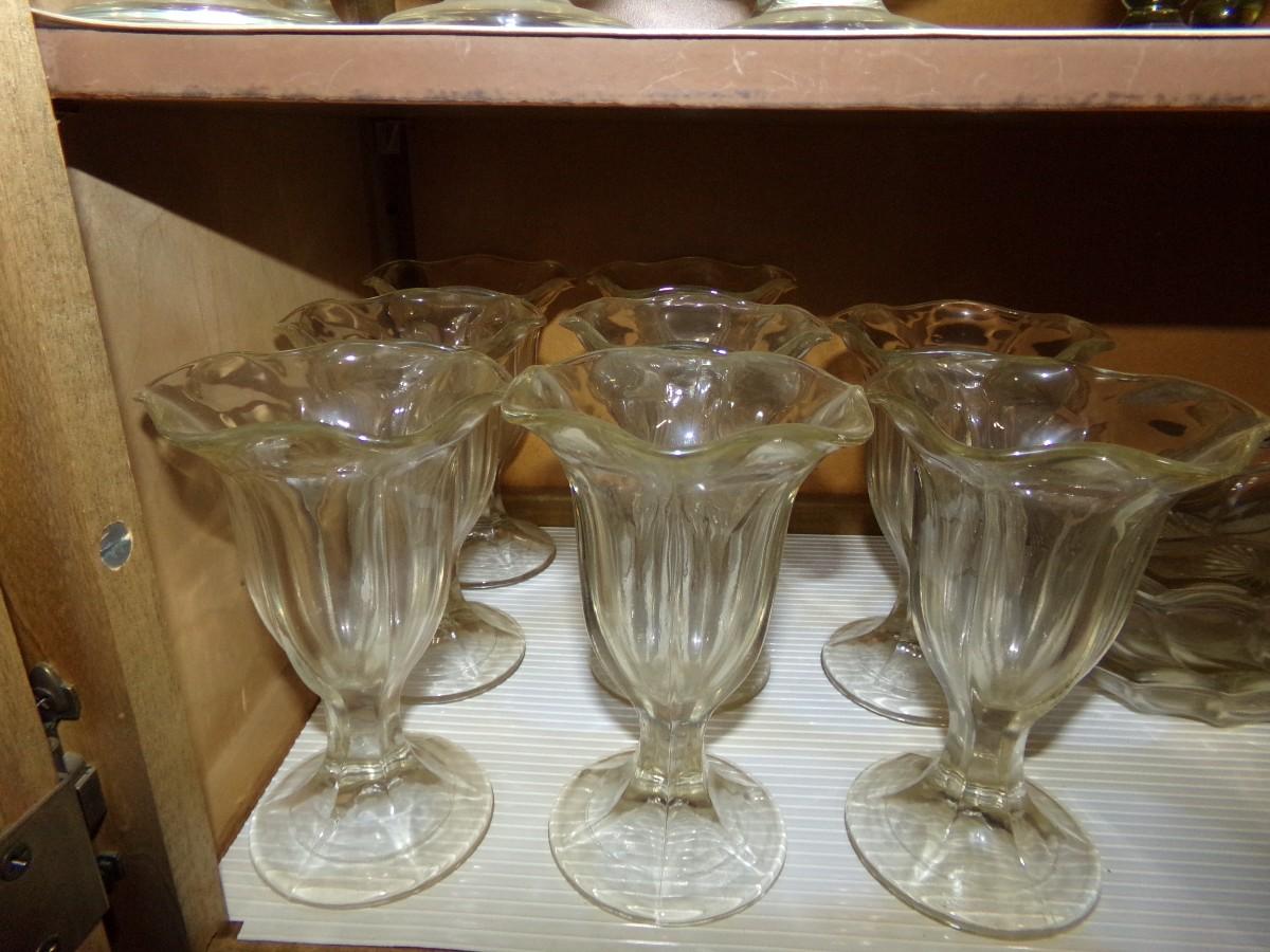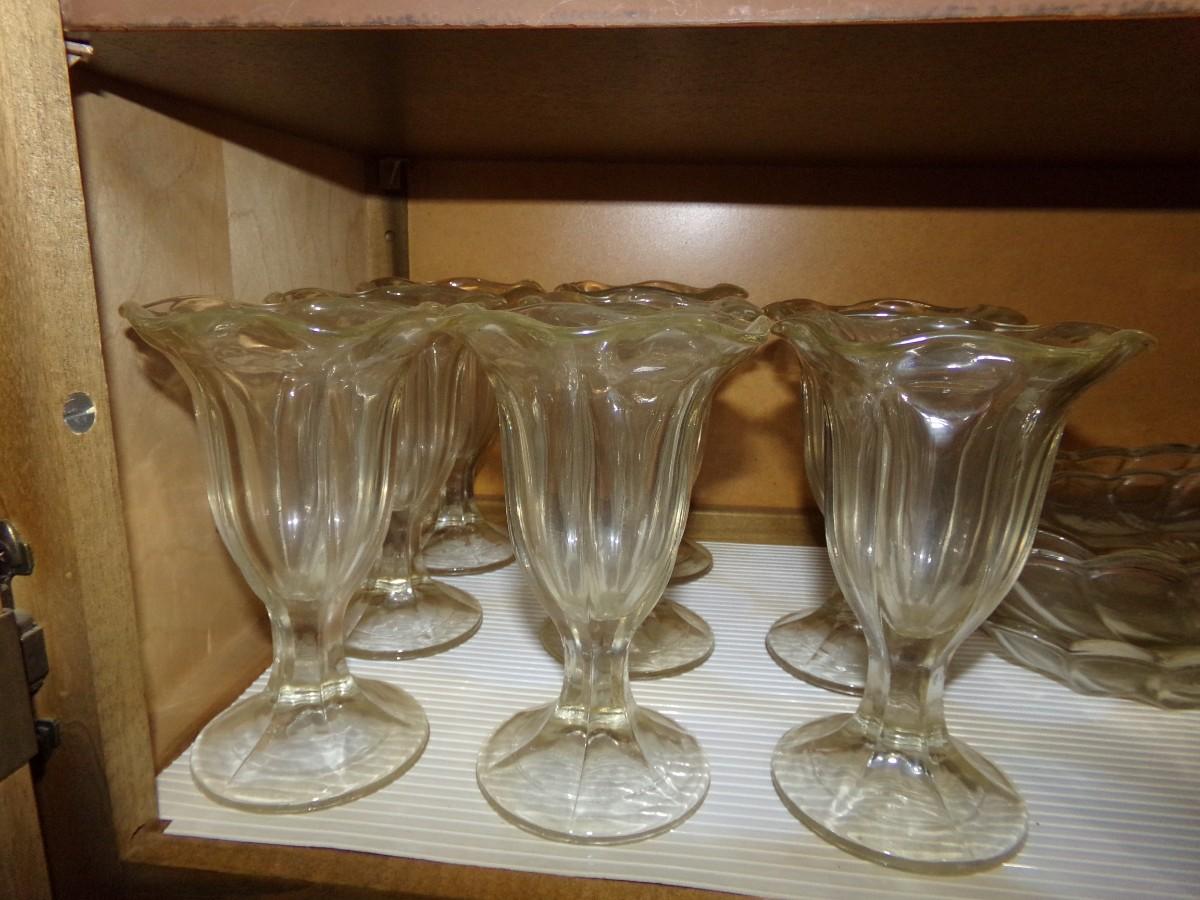 NICE ASSORTMENT OF SUNDAE GLASSES AND WINE GLASSES. ALSO SOME CORN ON THE COB GLASS DISHES