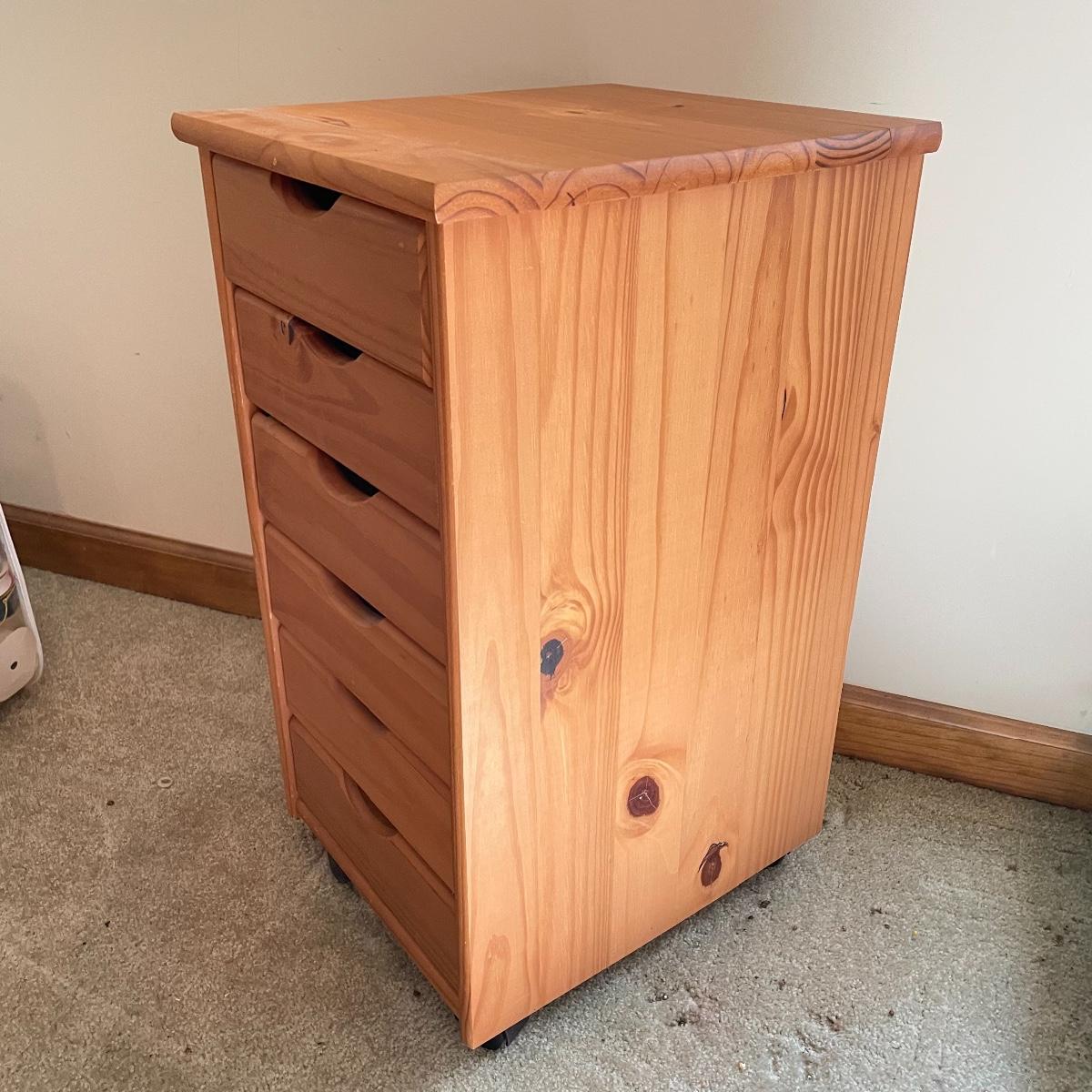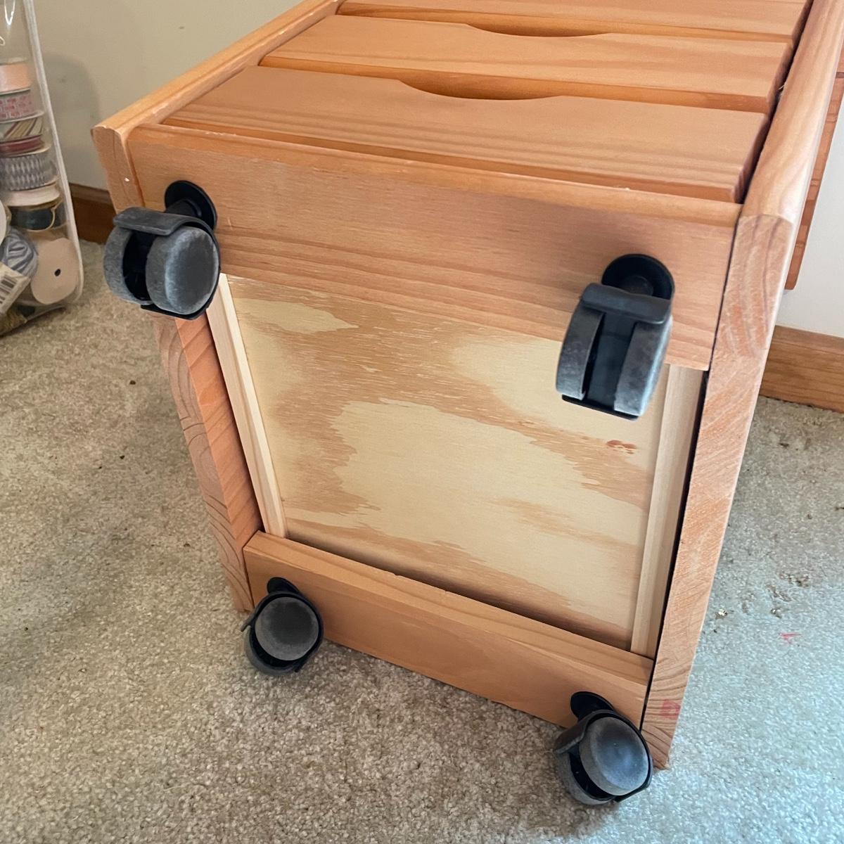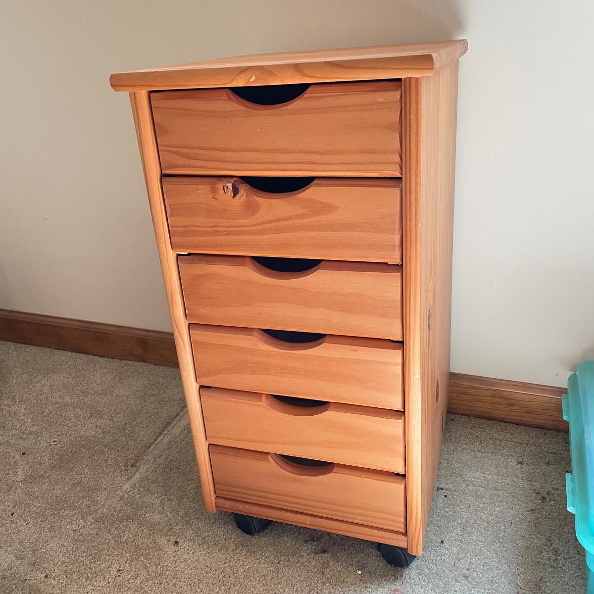 Nice, little wooden cart with six drawers perfect for organizing office supplies, crafting and more! The chest is purposely missing pulls and has nice carved out access to open the clean drawers. It’s also mobile and rolls easily on carpet. It measures 13.5” x 15.5” x 25.75”. See images. Local pick up only.