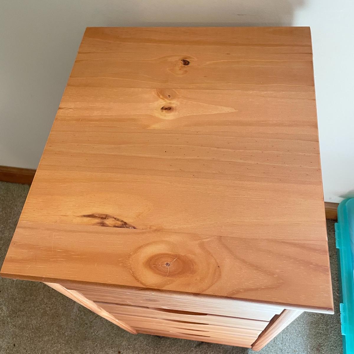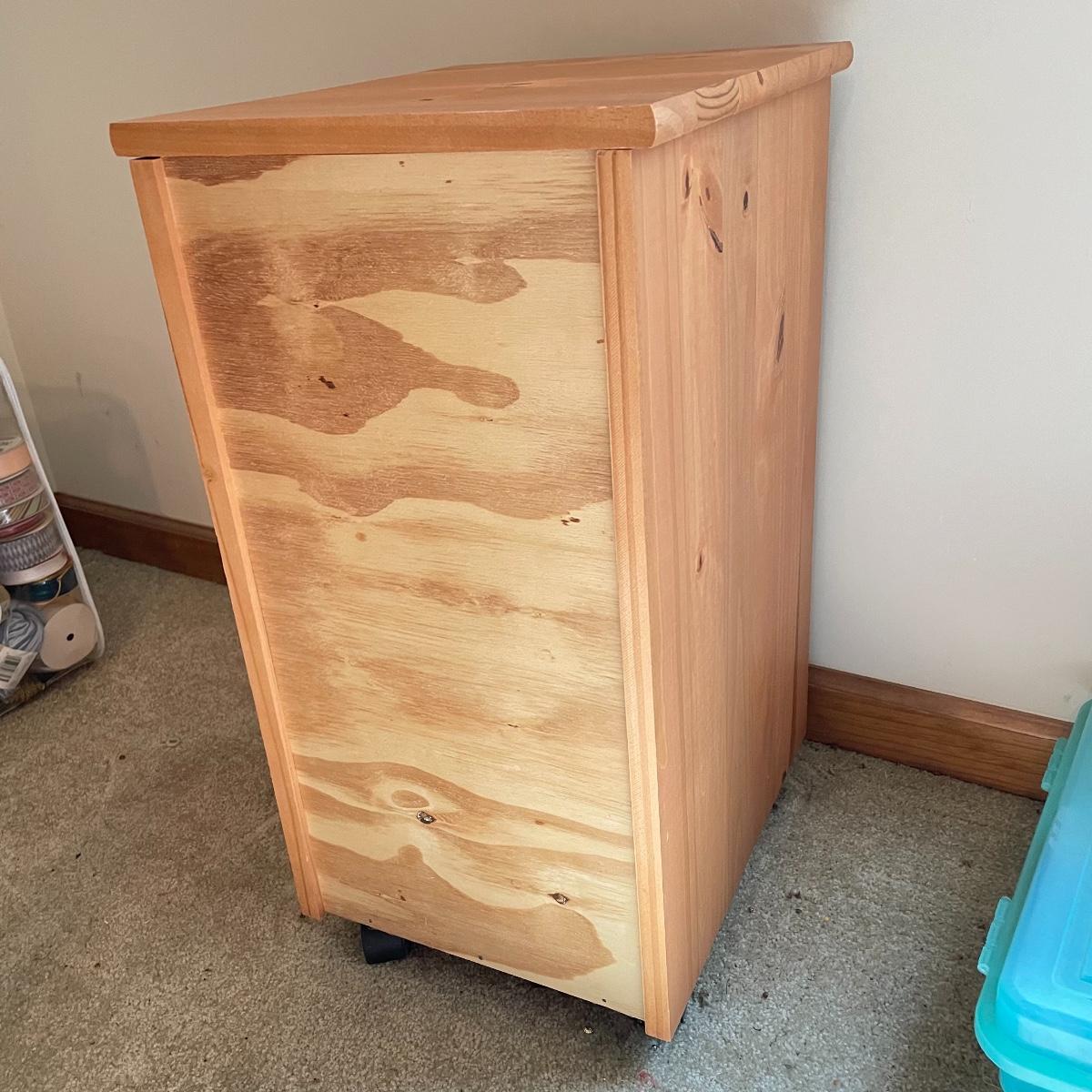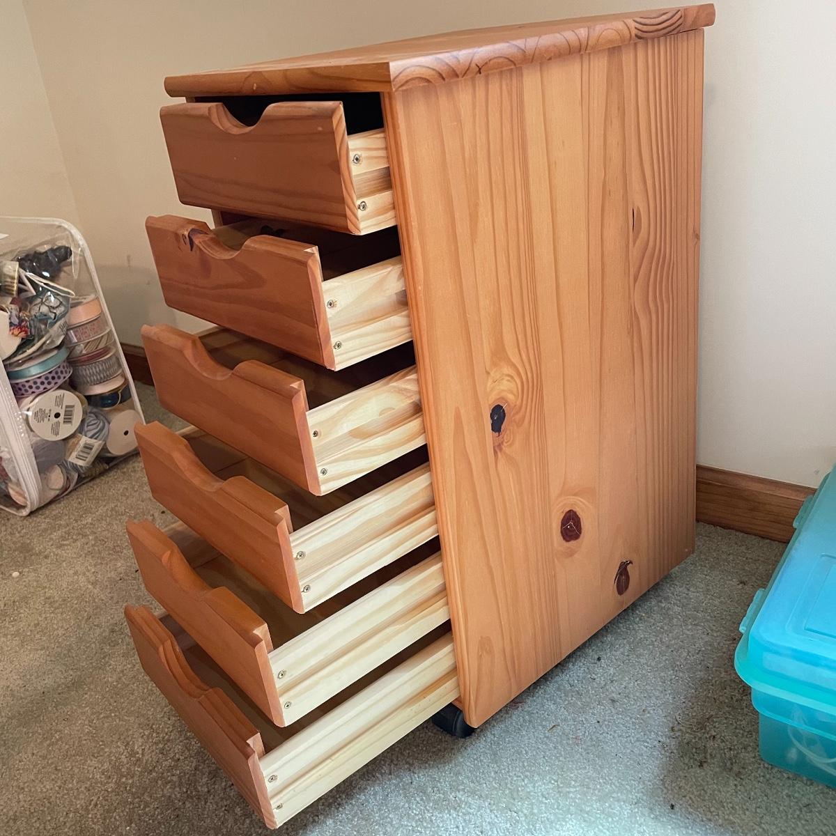 Nice, little wooden cart with six drawers perfect for organizing office supplies, crafting and more! The chest is purposely missing pulls and has nice carved out access to open the clean drawers. It’s also mobile and rolls easily on carpet. It measures 13.5” x 15.5” x 25.75”. See images. Local pick up only.