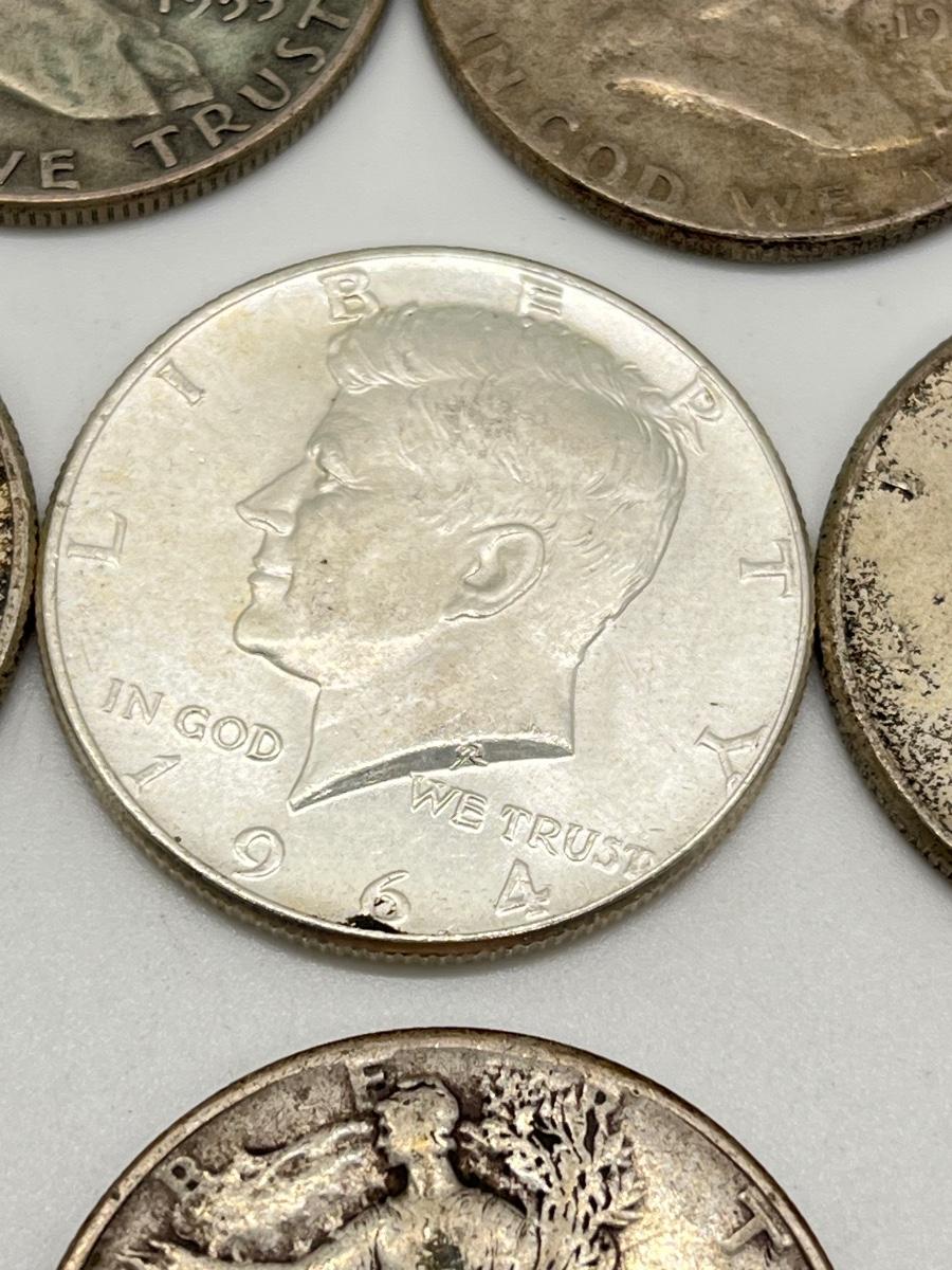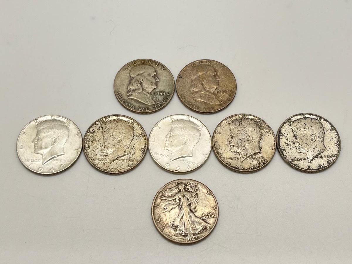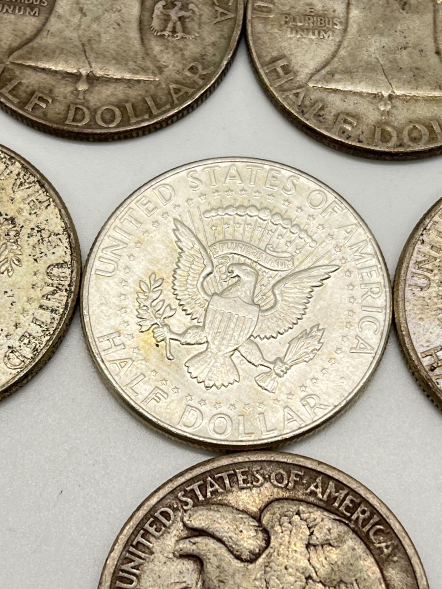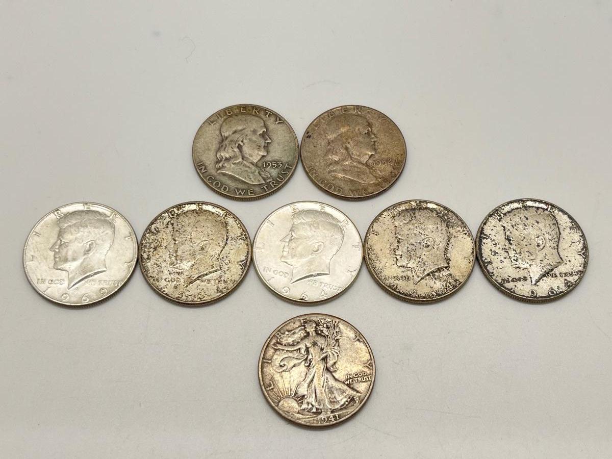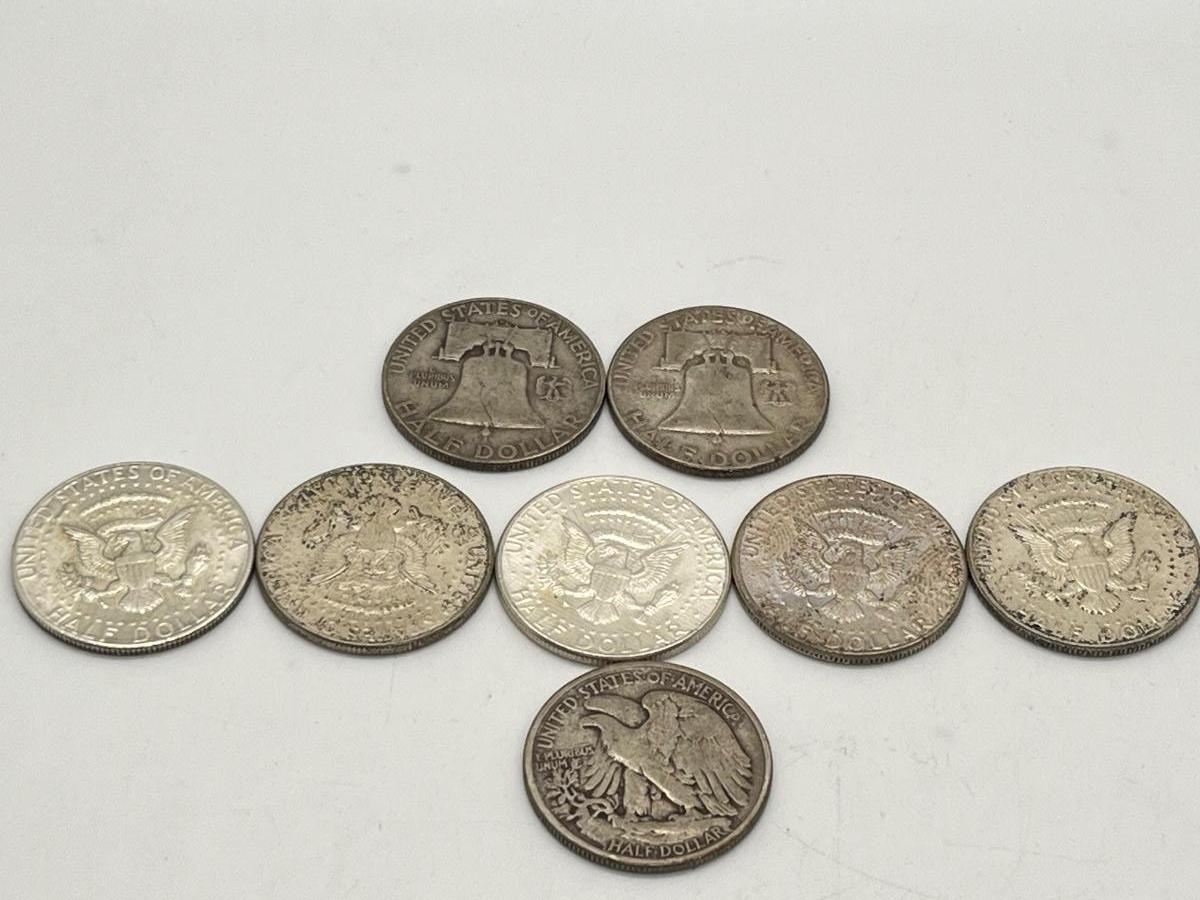 Lot 338J: Silver U.S. Half Dollars - 1 Walking Liberty, 2 Benjamin Franklin, 4 90% Silver JFK, 1 40% JFK