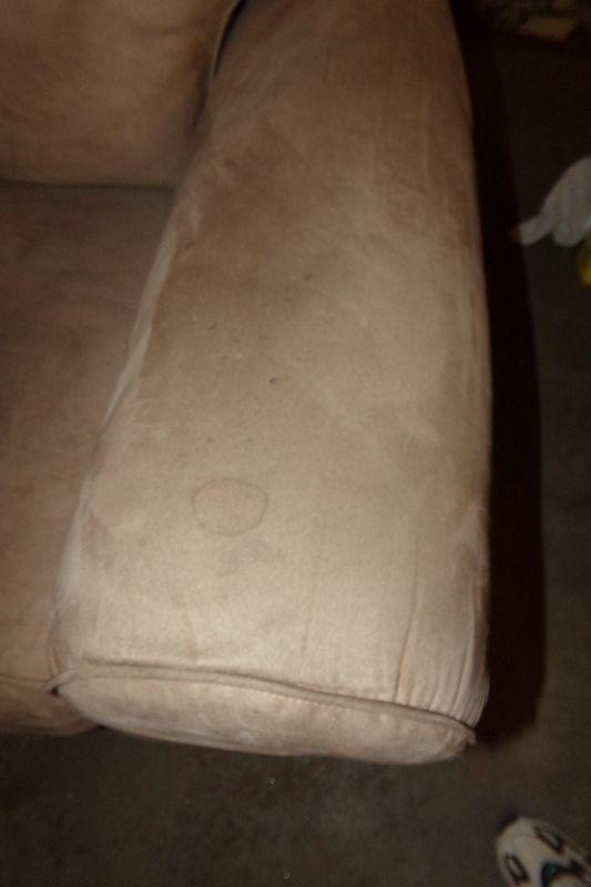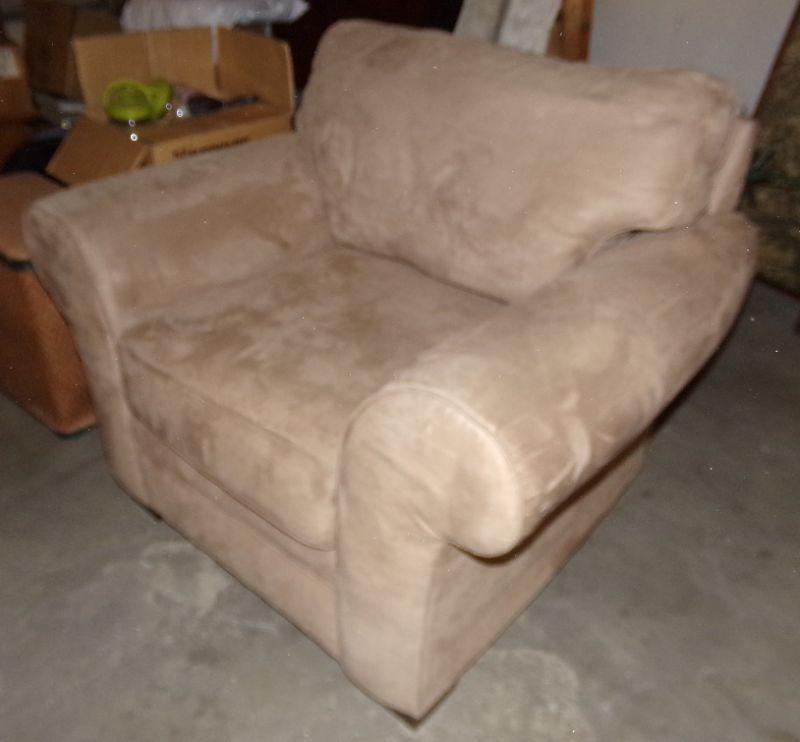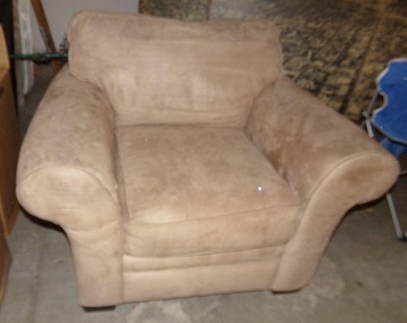 MICROFIBER OVER-SIZED LOUNGE CHAIR THAT IS VERY COMFY! THERE ARE A FEW LIGHT STAINS THAT SHOULD WIPE RIGHT OFF (THE BEAUTY OF MICROFIBER)