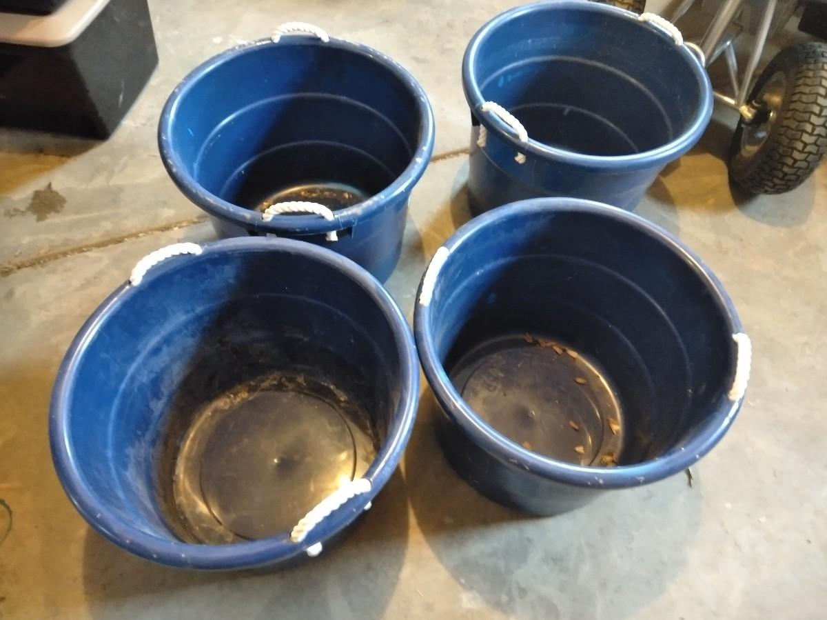 MAINSTAYS KIDS FOUR EASY TO CARRY ROPE HANDLED TUBS. THESE APPEAR TO BE USED IN THE BARN, THEY NEED A GOOD CLEANING.