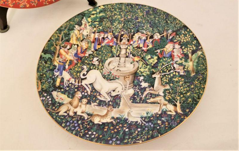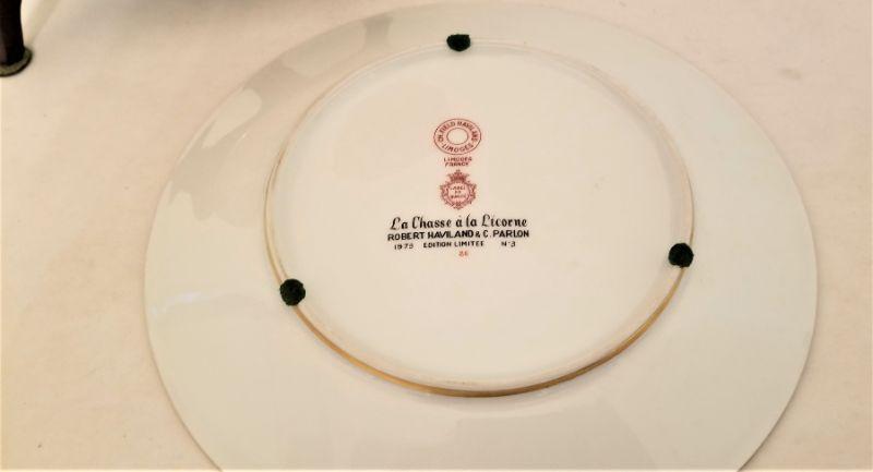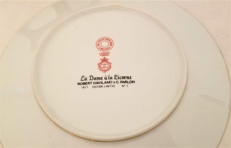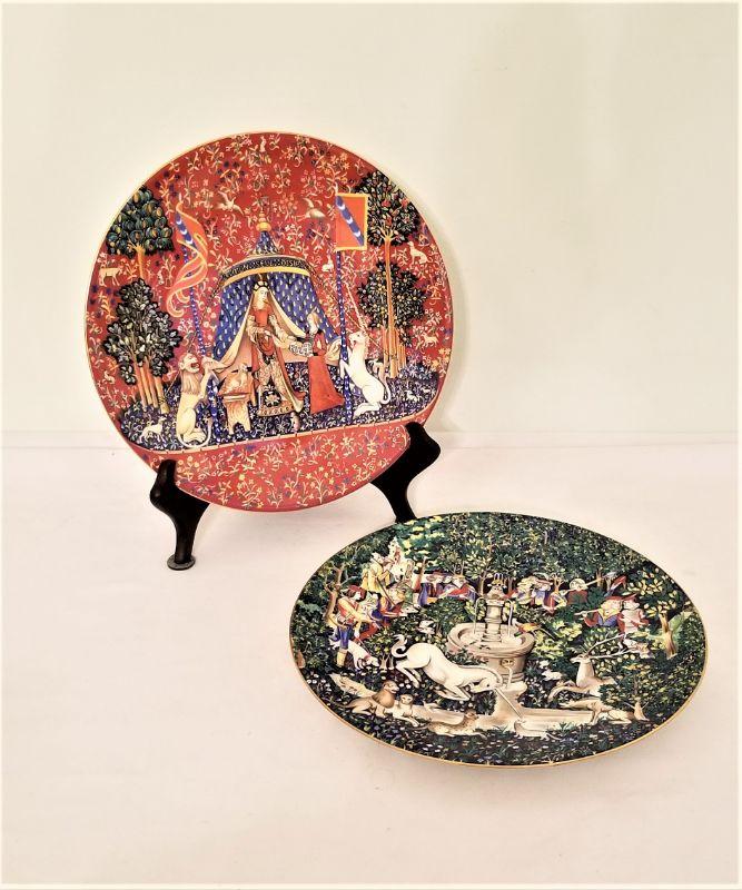 These plates are very pretty and come from a limited edition done in the 1970's. Both measure 9.75" across. One is "La Dame a la Licorne", the other is "La Chasse a la Licorne." I.E. The Lady of the Unicorn and The Hunt of the Unicorn. Excellent condition.