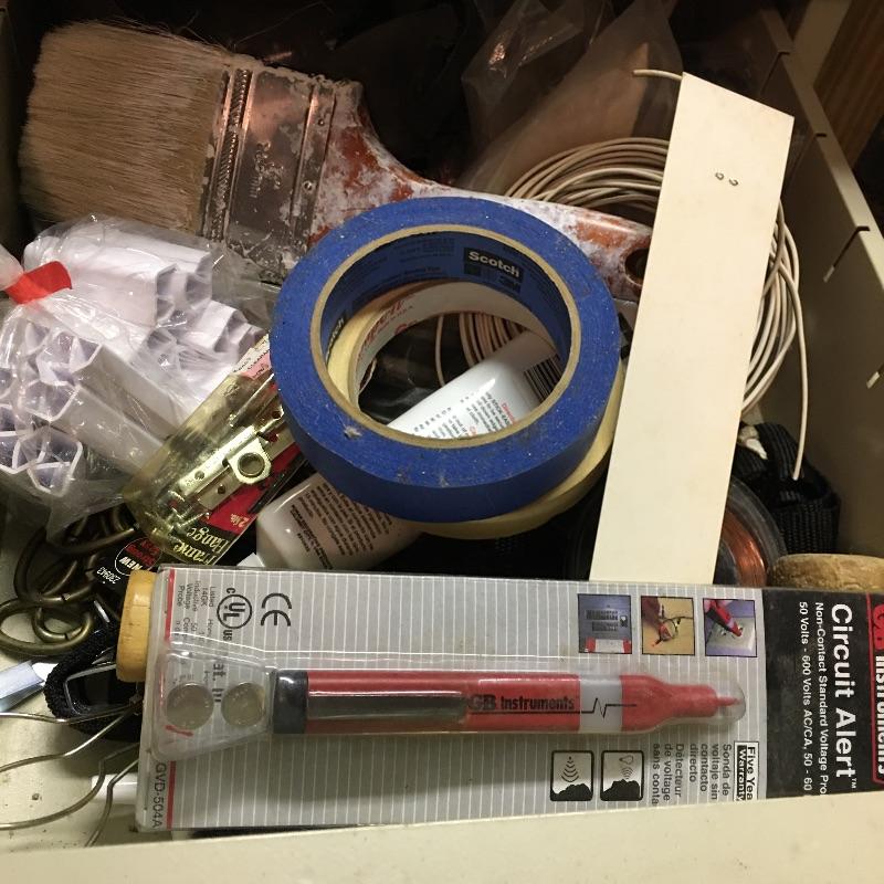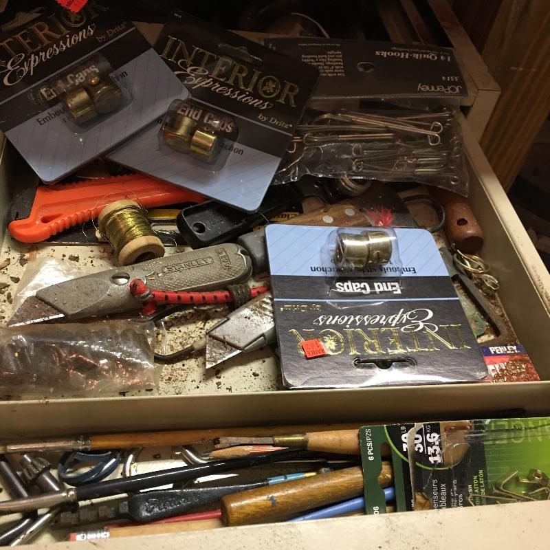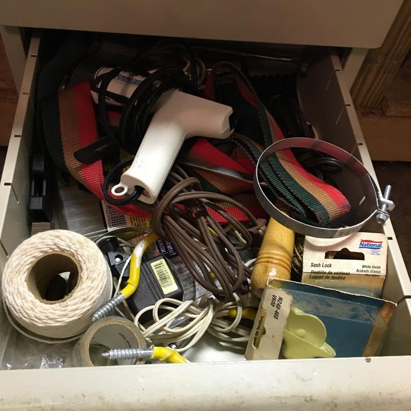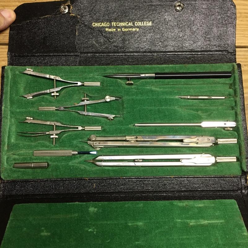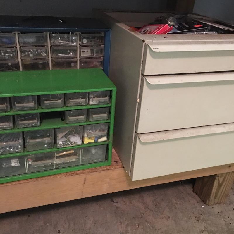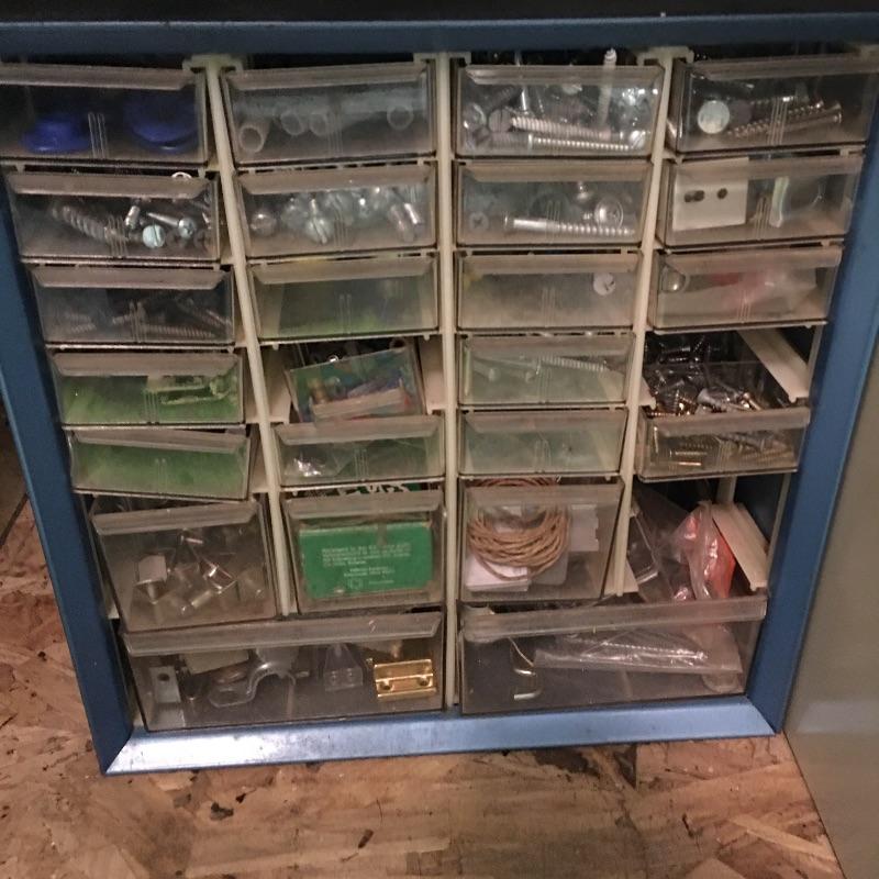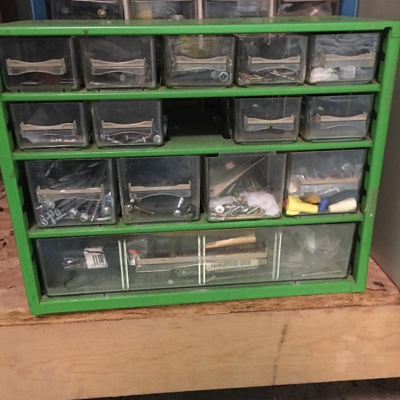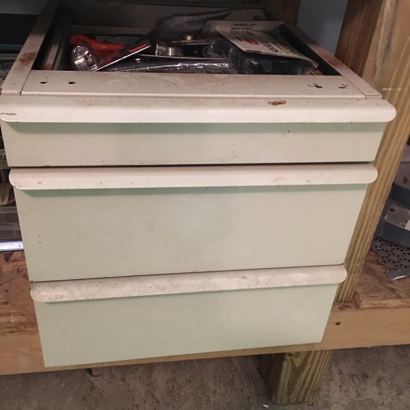 Lot includes one fifteen bin container, twenty six bin container that is missing three bins and a metal three drawer cabinet. Also includes Gramercy precision drafting tools in case and a map measurer. A great way to save money and time with this collection of hardware and bins. Metal cabinet measures 15” x 19” x 14.5”.