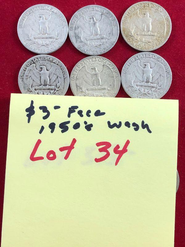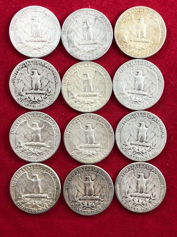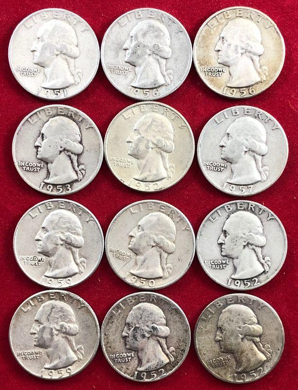 Lot #34- 12 1950's Washington Quarters $3 Face 90% Silver