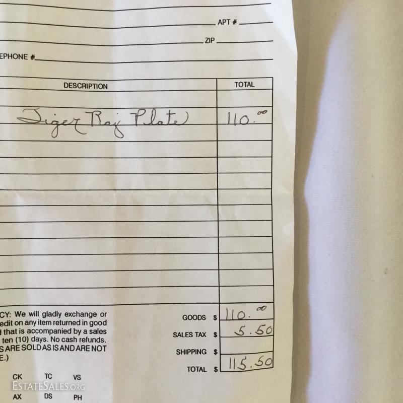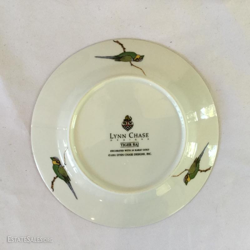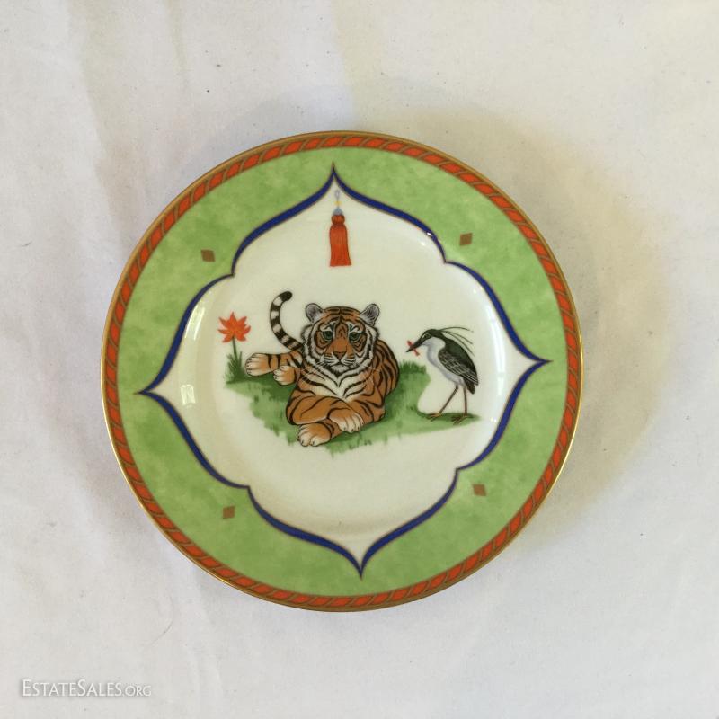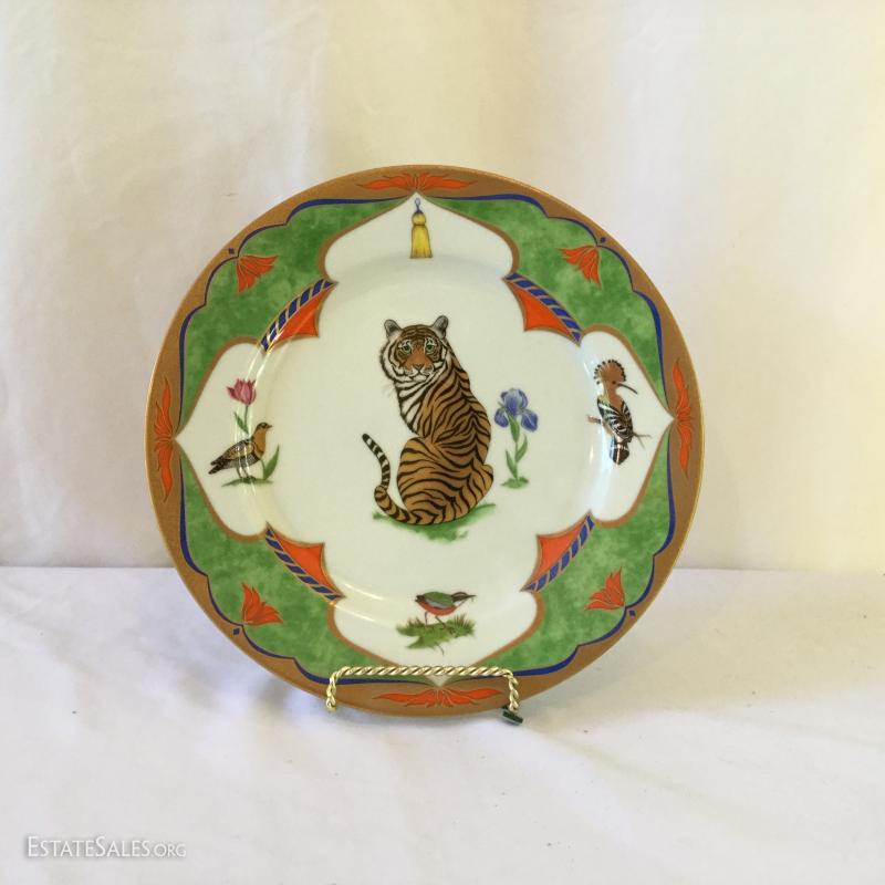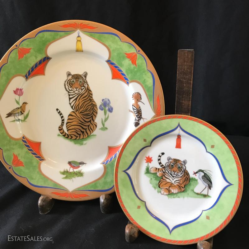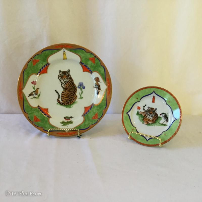 "Tiger Raj" plates are both decorated with 24 karat gold. Largest plate is 11" diameter. Smaller 6.5" diameter