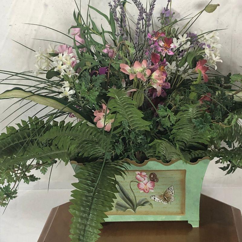 Solid wood table with sturdy construction from 1960s ~ 18" diameter, 22" hig ~ Walnut. Floral arrangement