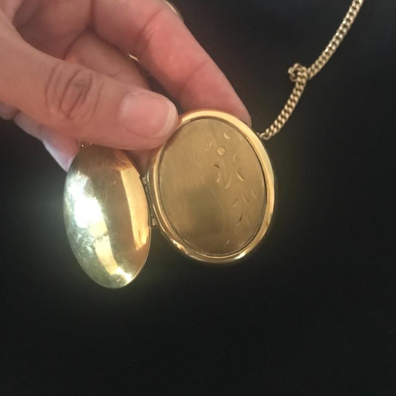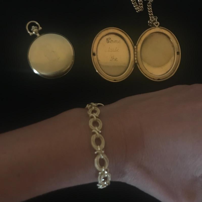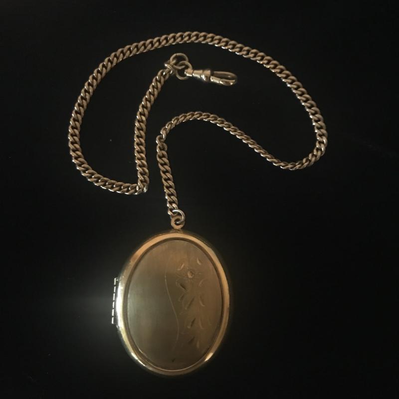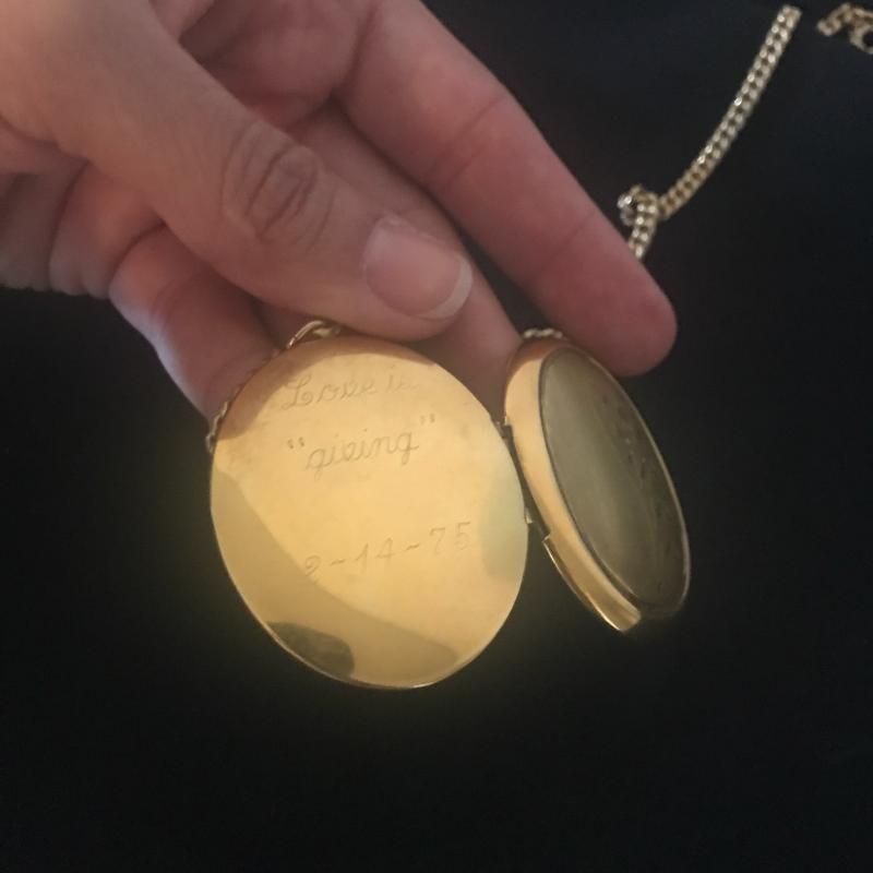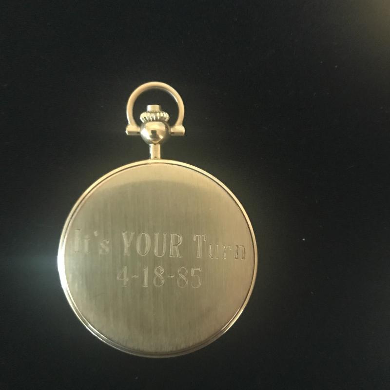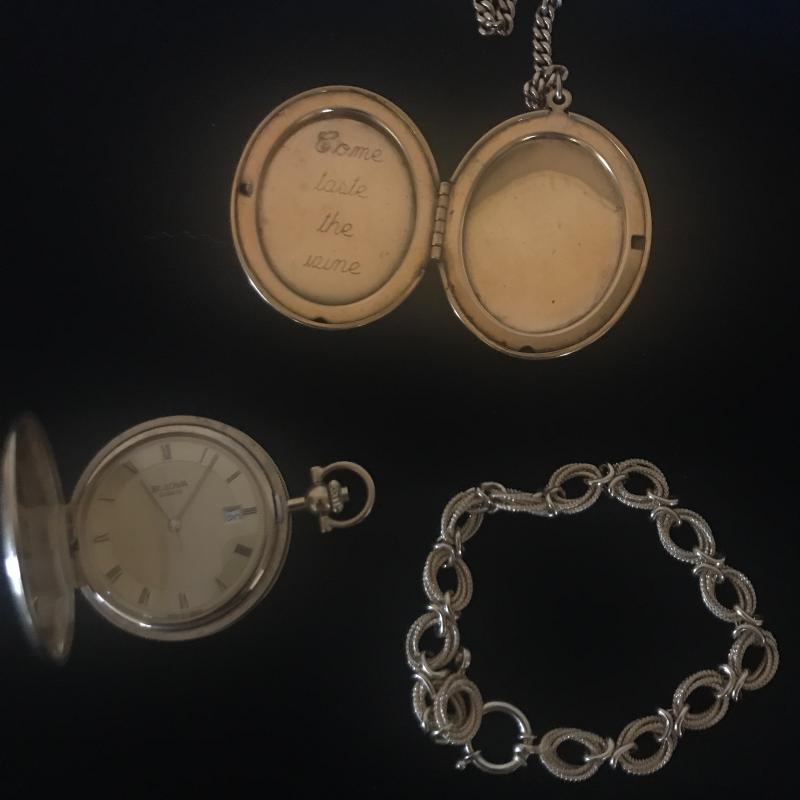 This lot has an engraved pocket watch, a locket and a gold bracelet marked 18k. The pocket watch is by Bulova, is 1.5”D and is engraved with a “B” on cover and “It’s YOUR Turn 4-18-85” on the back. Watch has minimal wear and may just need a battery. The bracelet is marked 18k (with other illegible marks). The locket on a chain and is engraved with flowers on cover and says “Come Taste The Wine” on the inside and “Love is Giving 2-14-75” in the back cover. Shipping available, starting price is based on melt value of bracelet.
