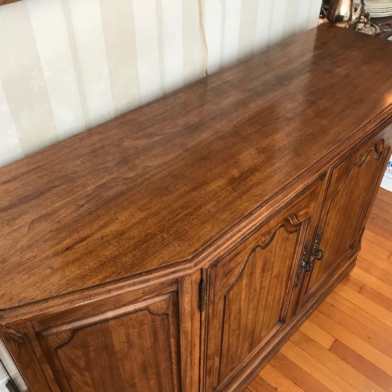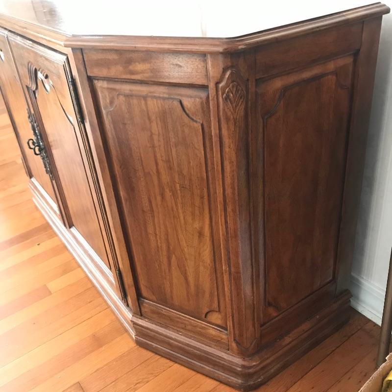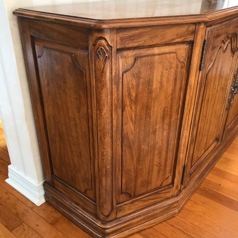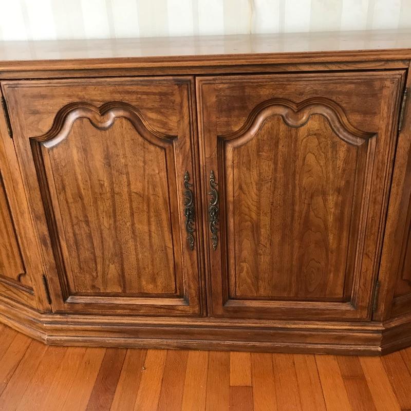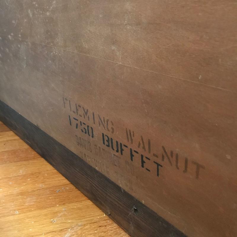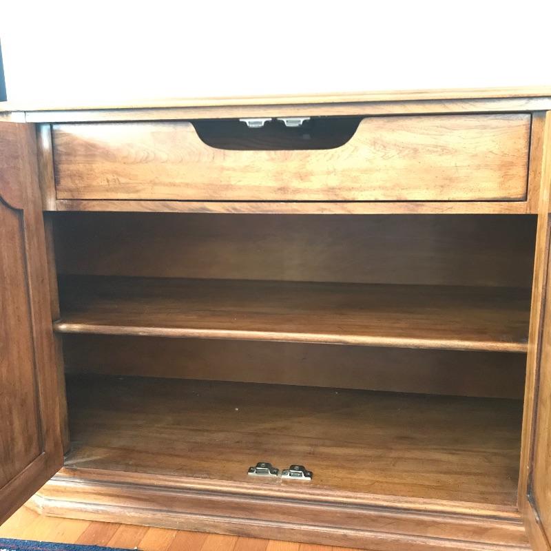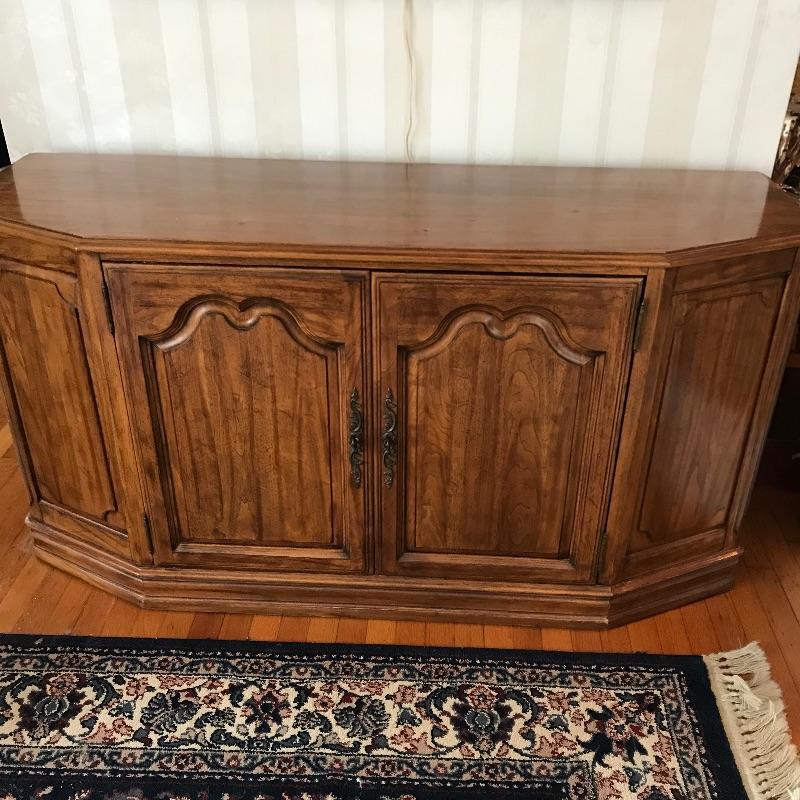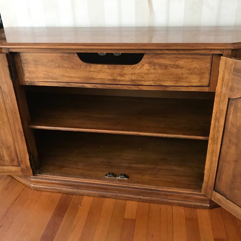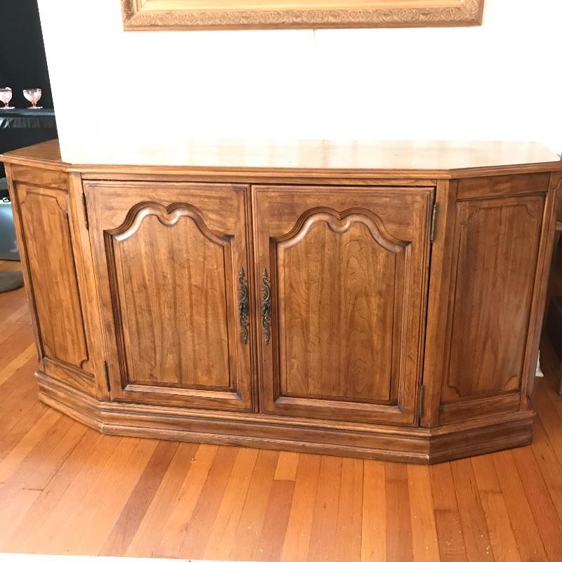 Two door walnut buffet by Davis Cabinet Company. Piece is beautiful with two door opening up to two shelves and one dovetail drawer. Finish is in wonderful condition and wood grain shines through nicely. Piece measures 59” x 19” x 31”. No shipping. Please bring help to load.