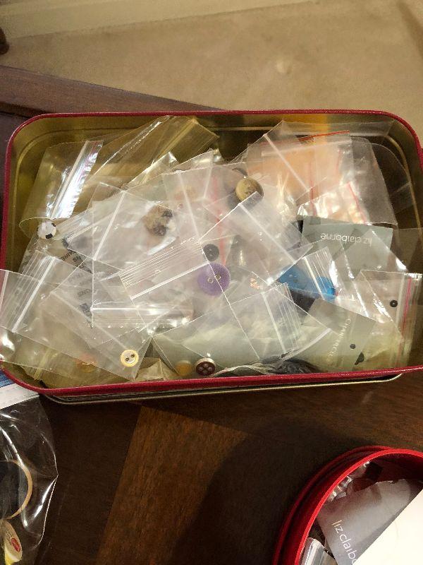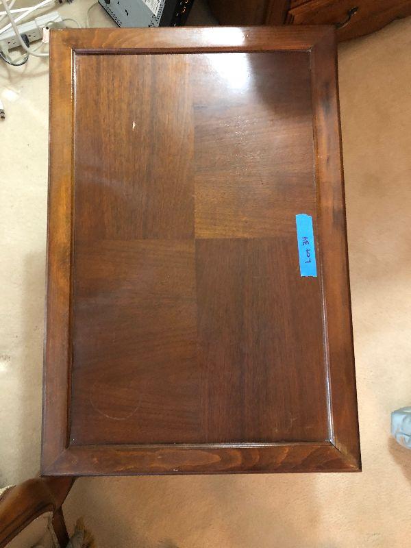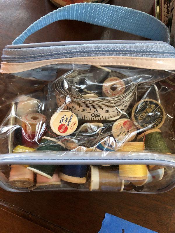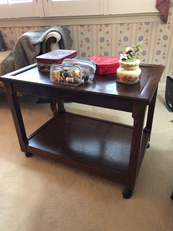 Rolling 2 Tier Wood TV Stand (27" x 18" x 20"), Sewing Supplies and Decorative Items.