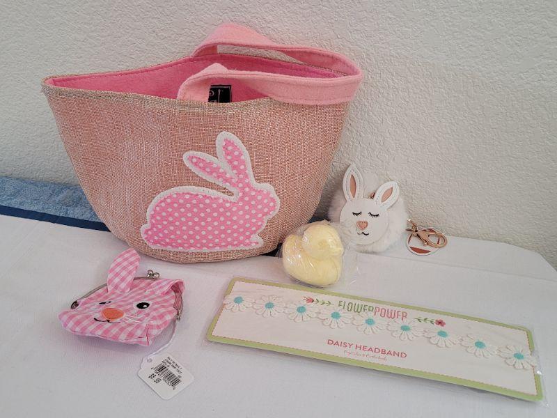 Lot 34: New Easter Purse Basket, Bunny Coin Purse, Headband, Bath Fizzie and Key Chain