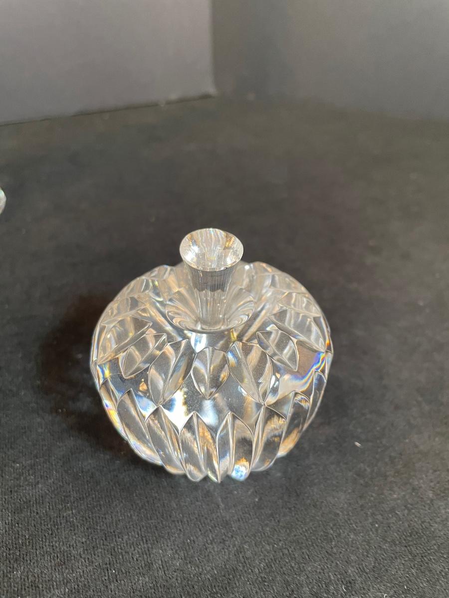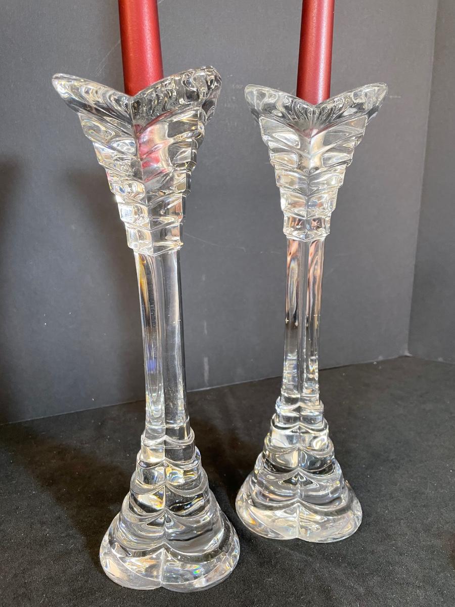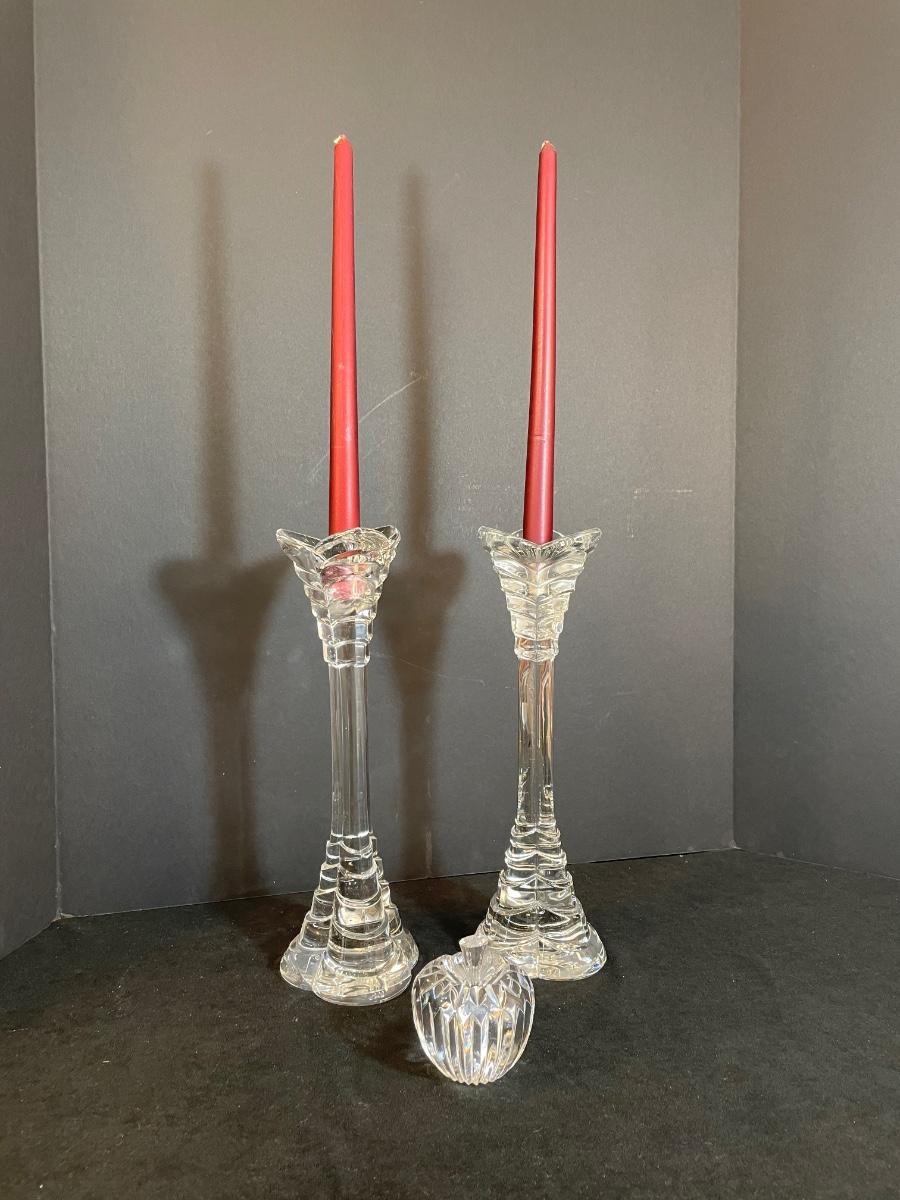 Set of 2 12" crystal taper candleholders with red taper candles and a crystal apple.