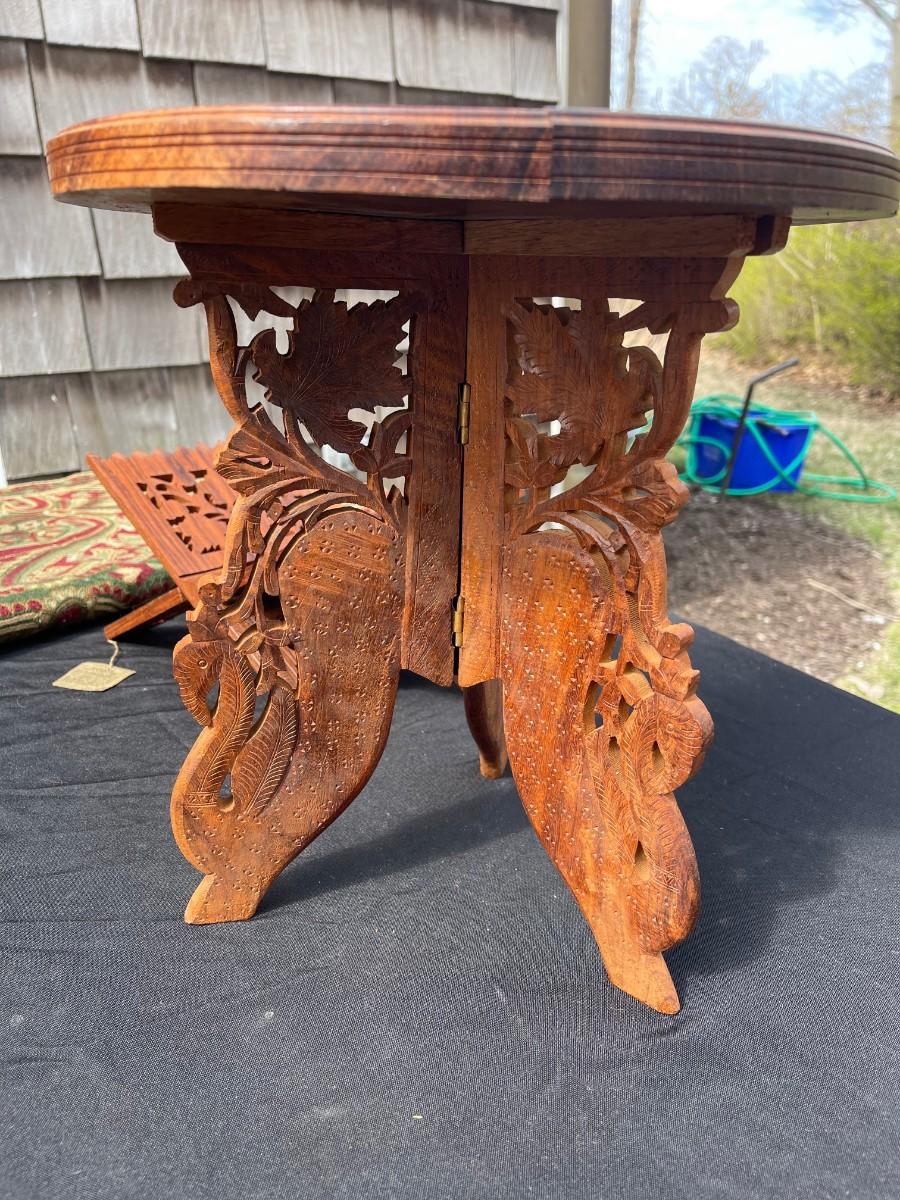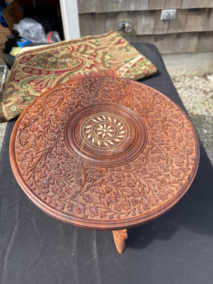 - Round wood carved with bone inlay little table, tripod base is removable and foldable,