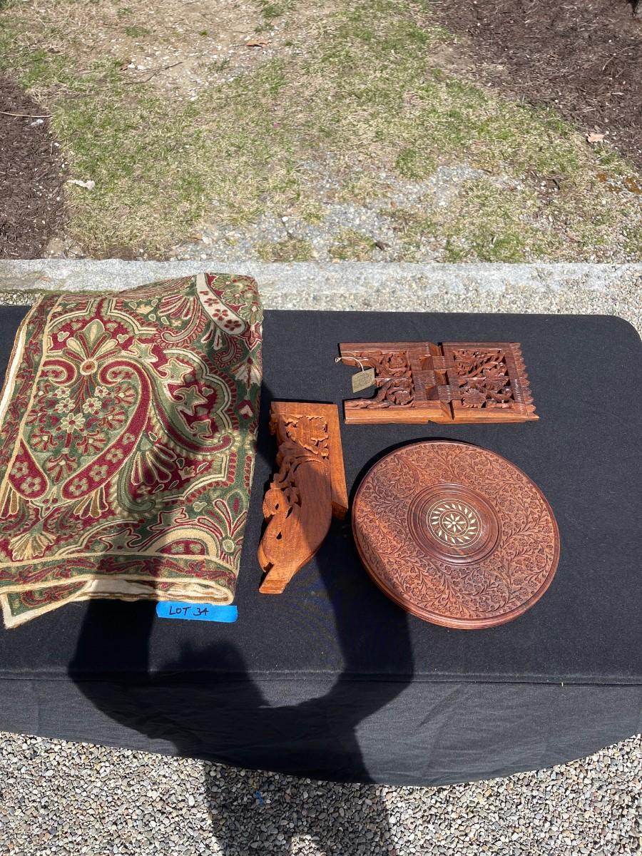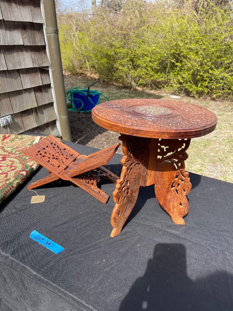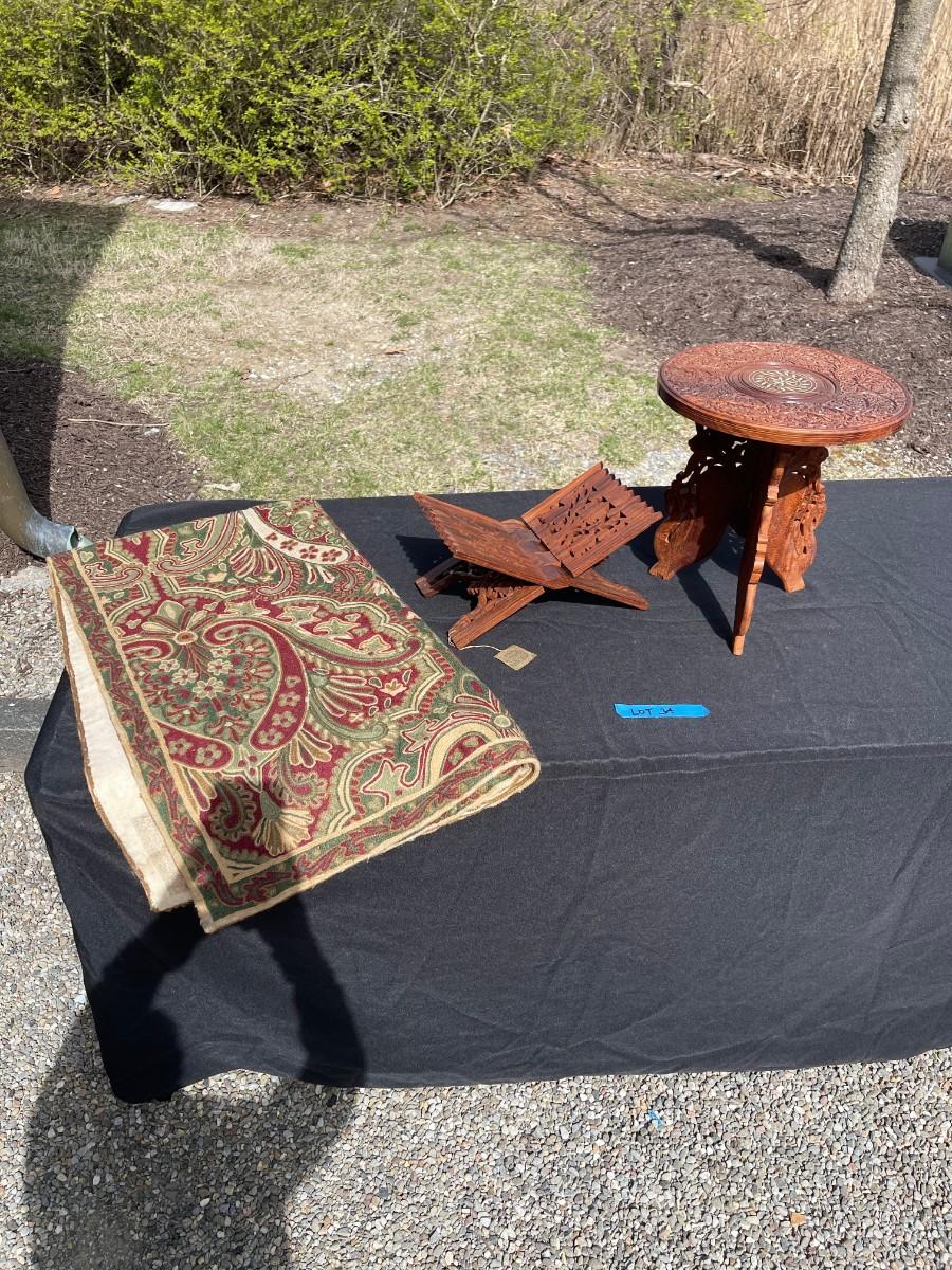 Lot 34- Moroccan tripod table, Koran holder, tapestry