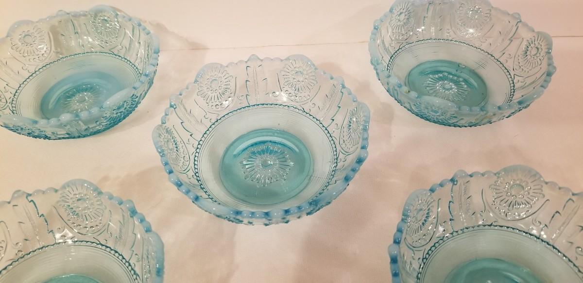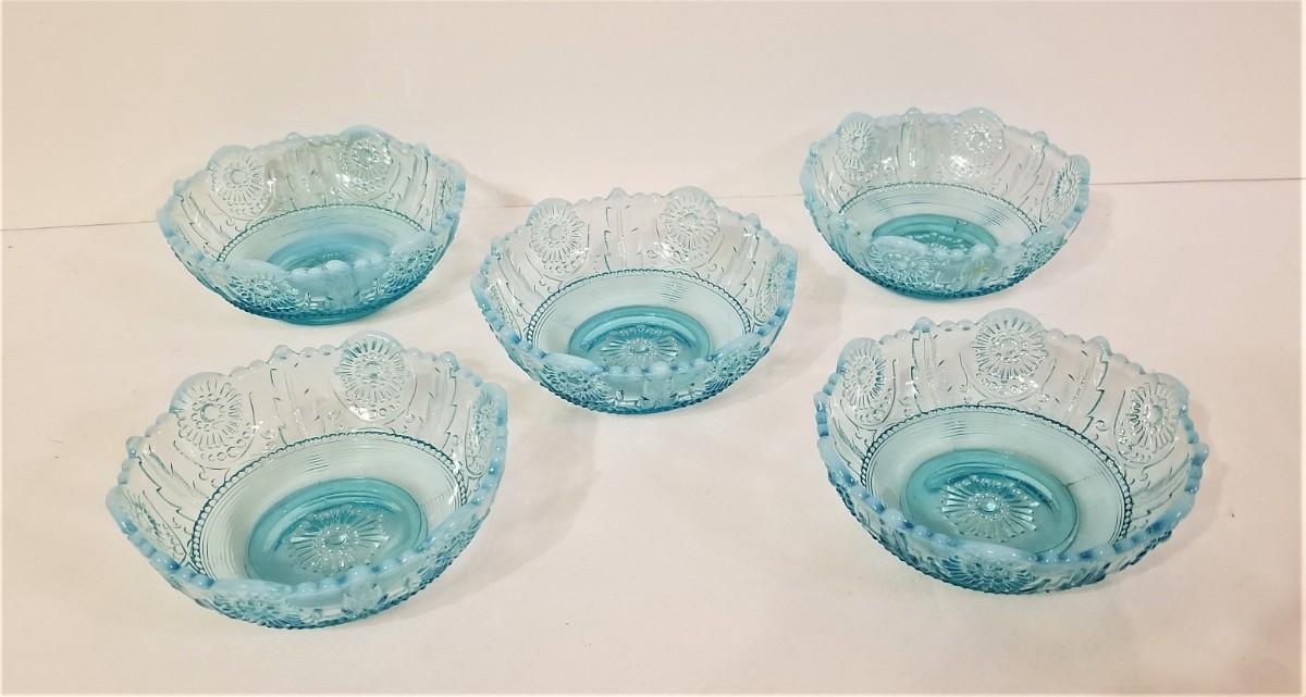 Set of 5 antique berry bowls in nice condition - lovely blue color. Each is 4" across and 2" tall.