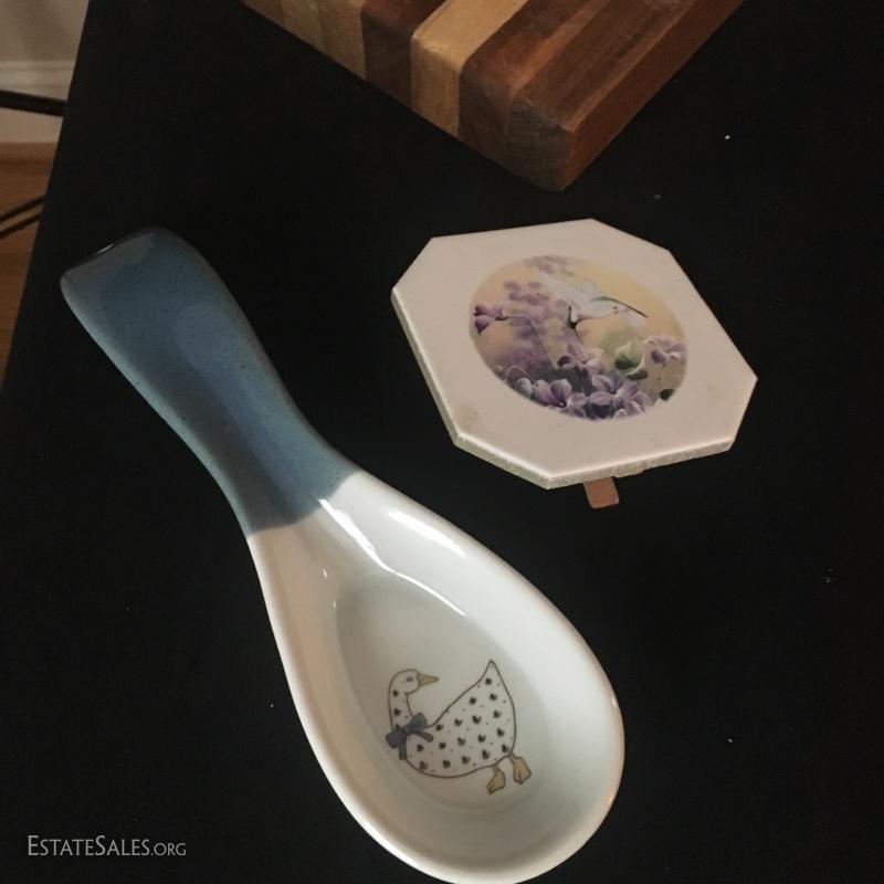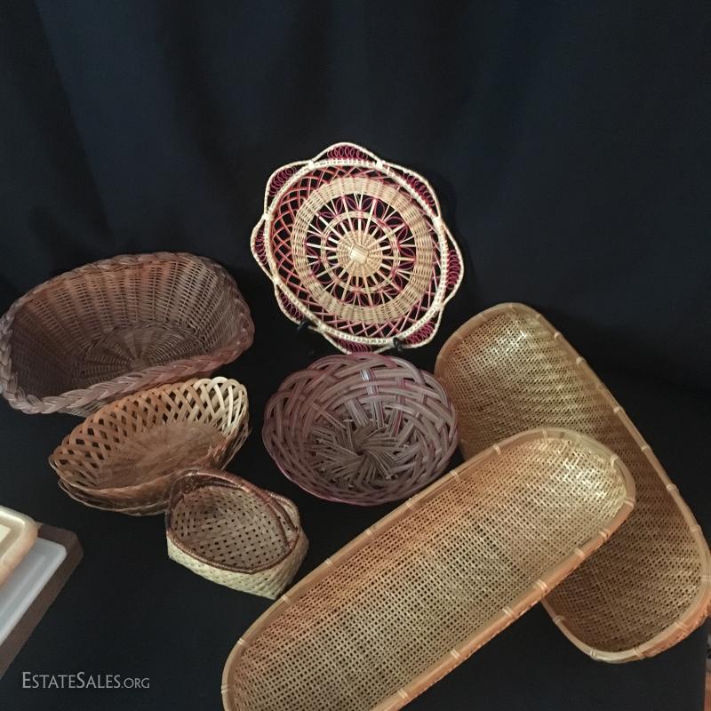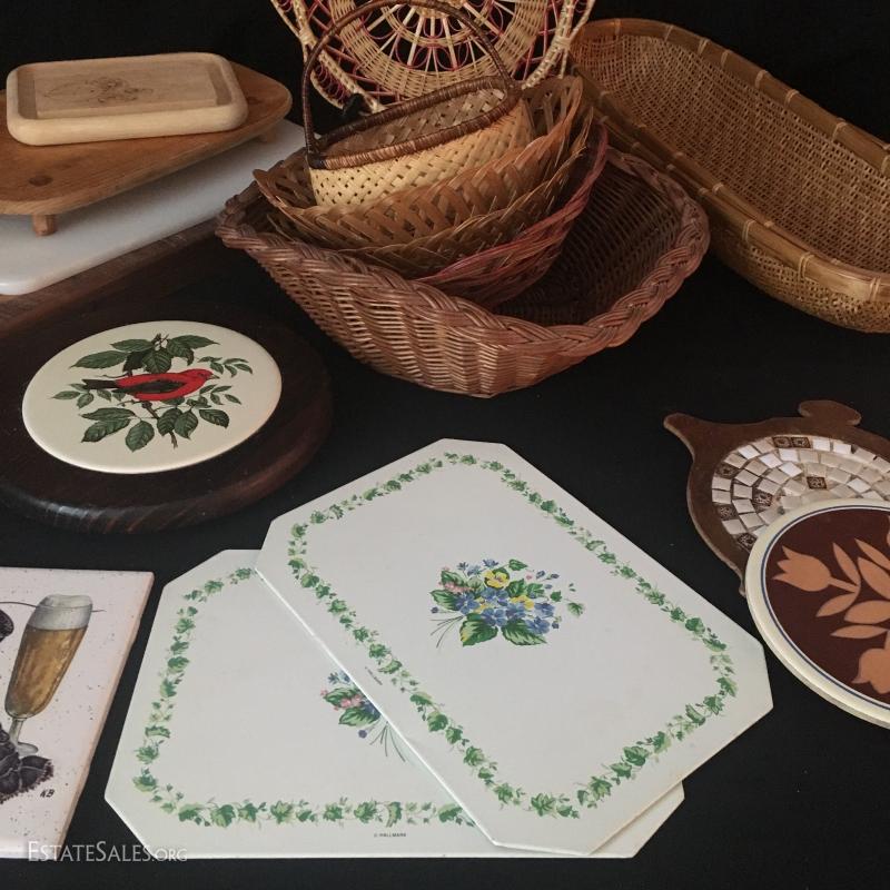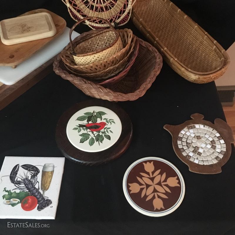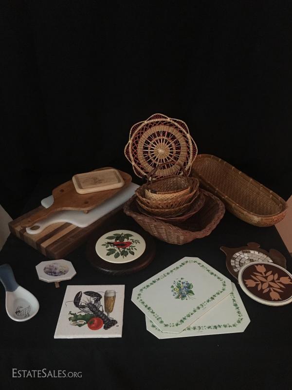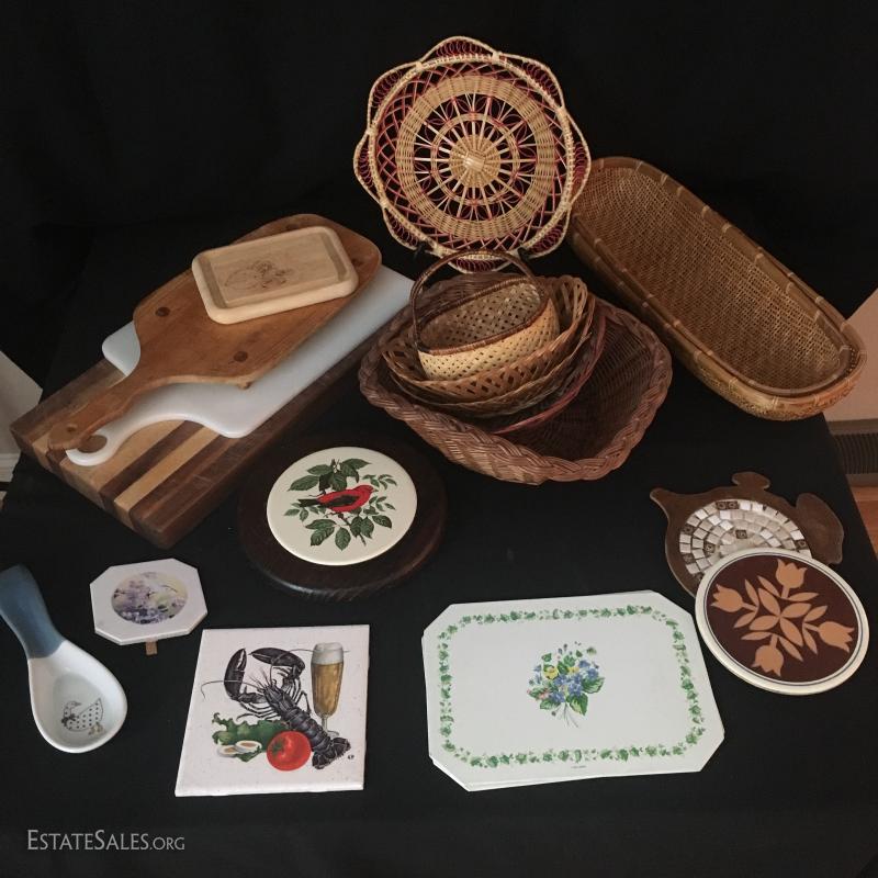 Assorted baskets and cutting boards. Hot pads or trivets made from ceramic, wood and insulated materials. This lot is avaiable for local pick up in Asheville, NC only.