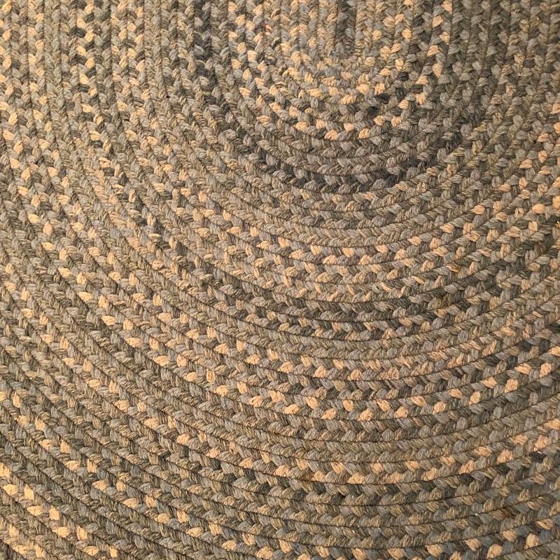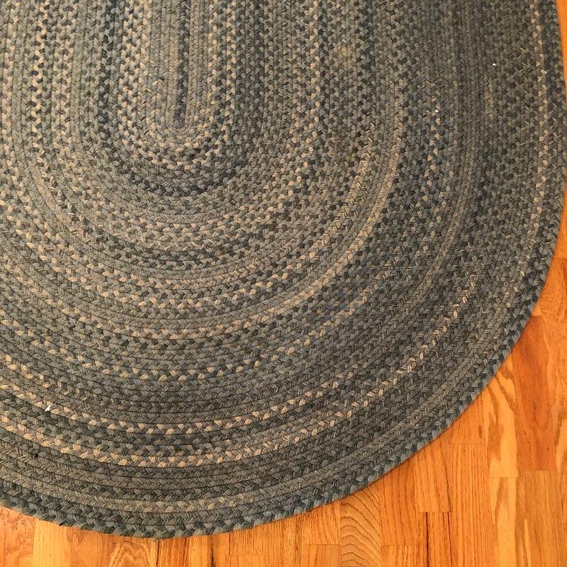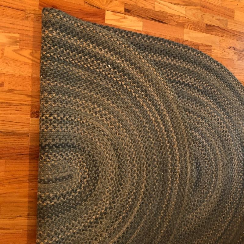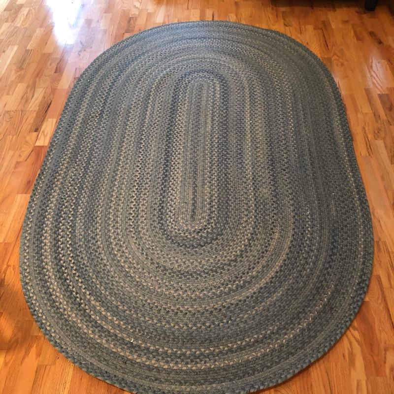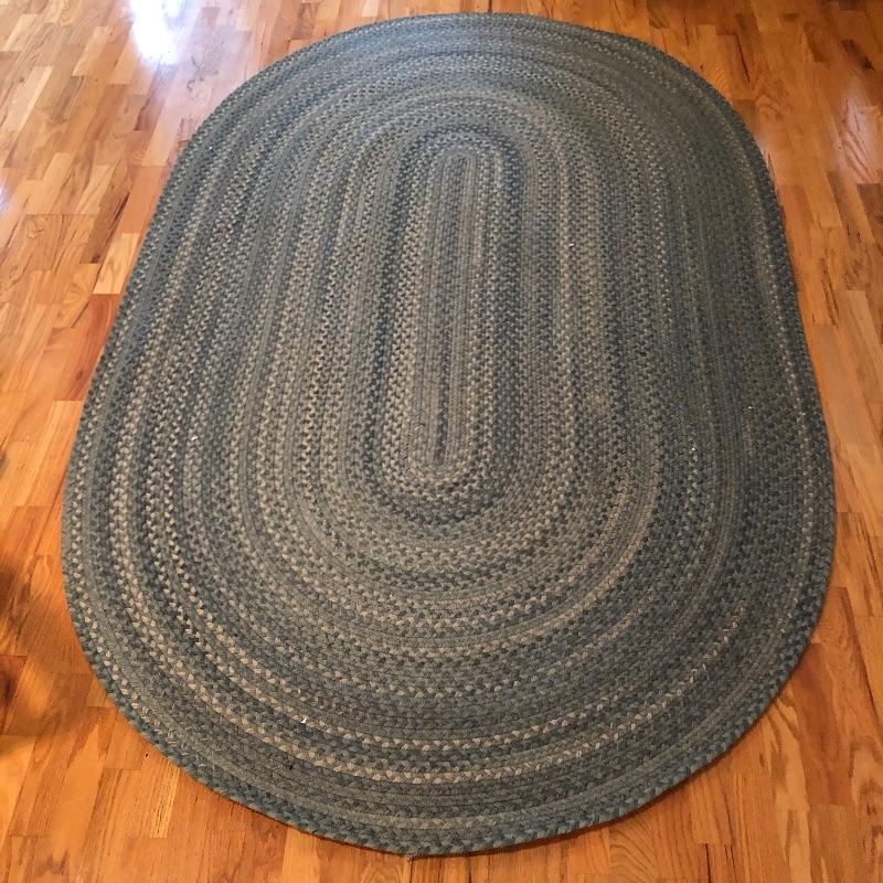 This great looking braided rug is a cornflower blue color with lighter blue accent threads. It’s in good condition and measures 5’ x 8’.