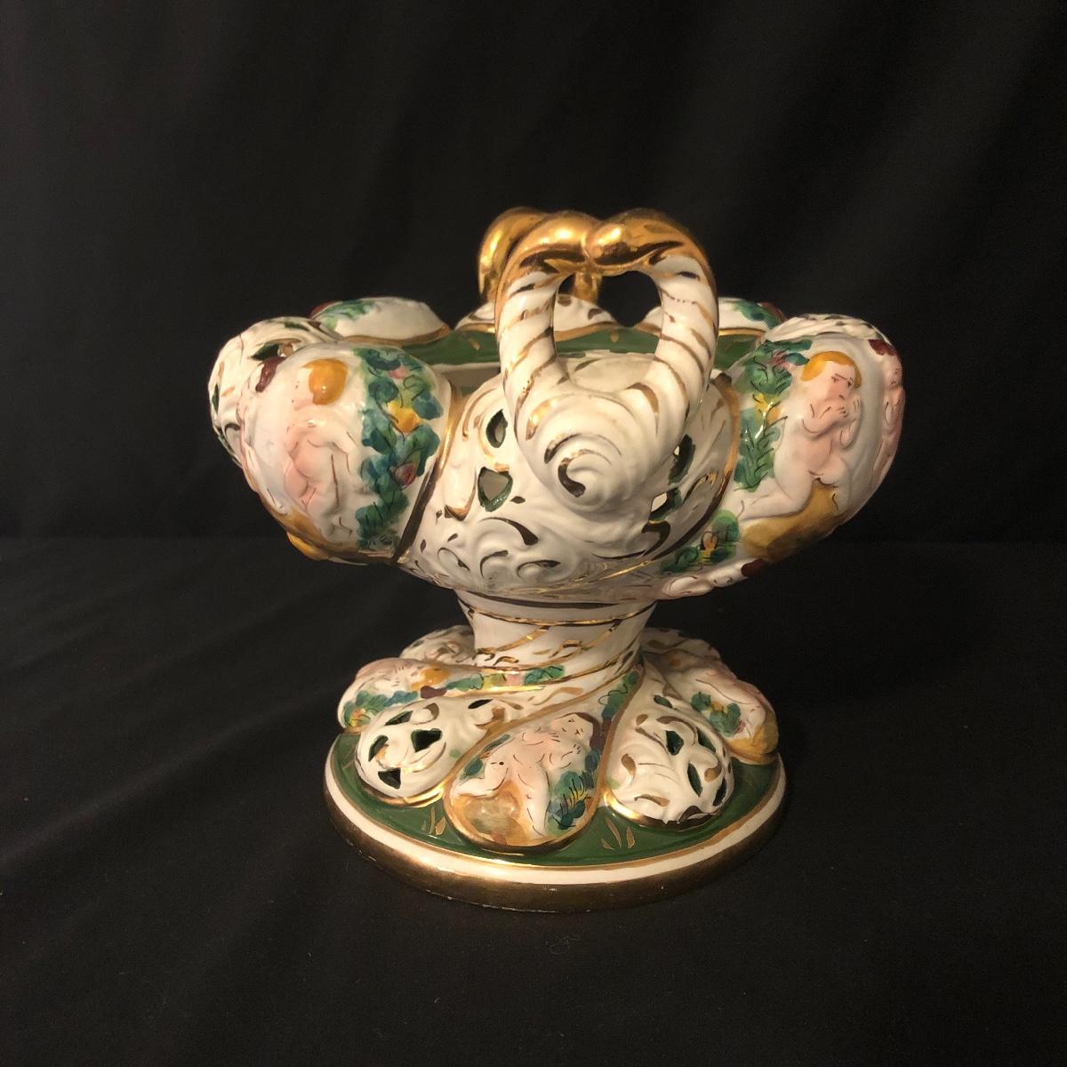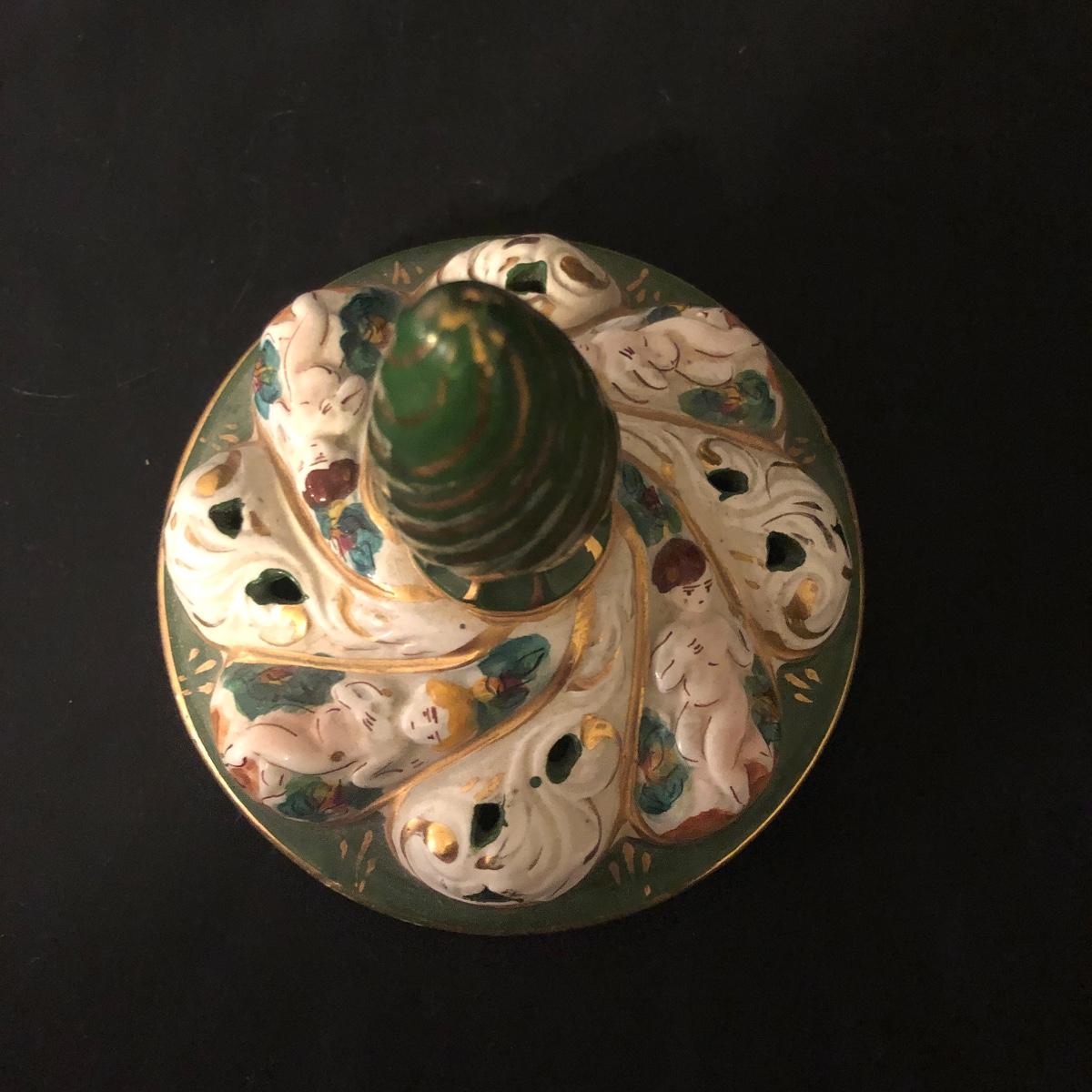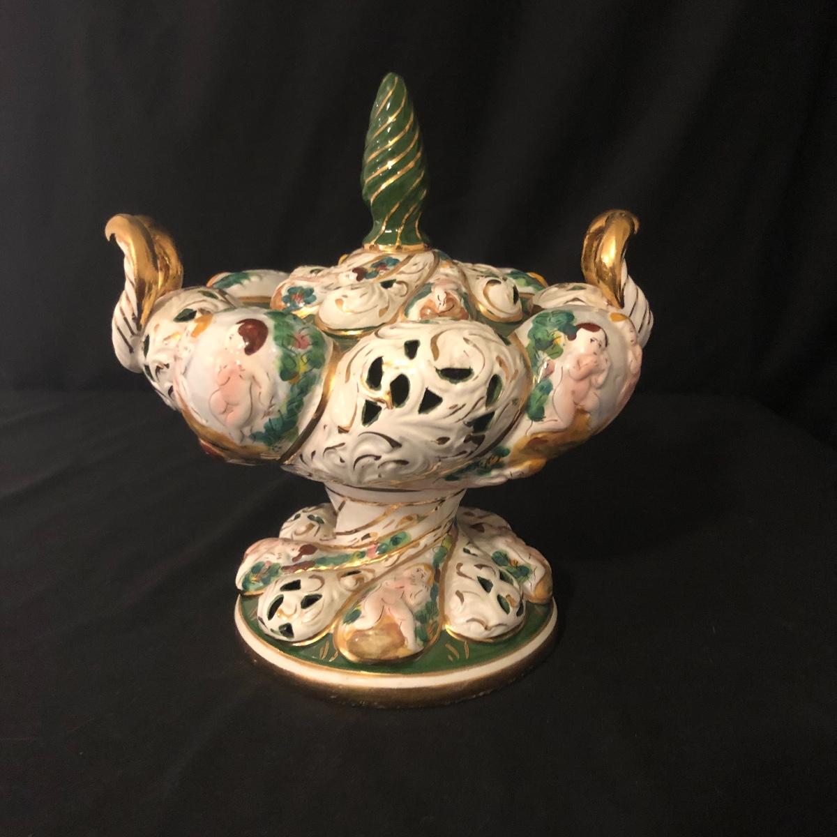 This Capodimonte lidded pedestal dish is signed on the bottom. It is a spectacular conversation piece that has a with a cherub design and is a great piece for your home and to stash your candy. Piece measures 9”D x 9.5” tall.