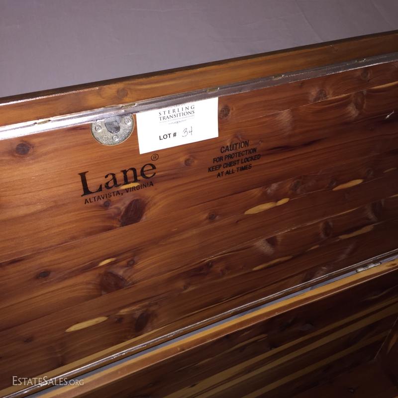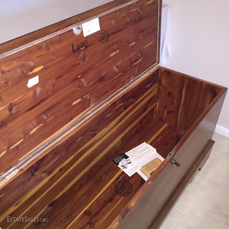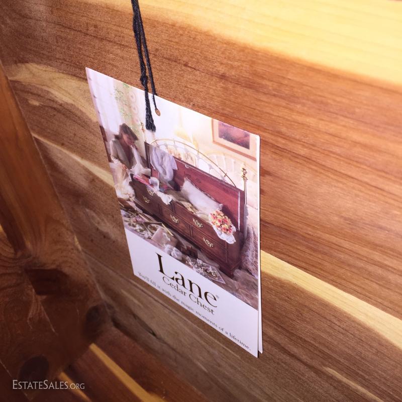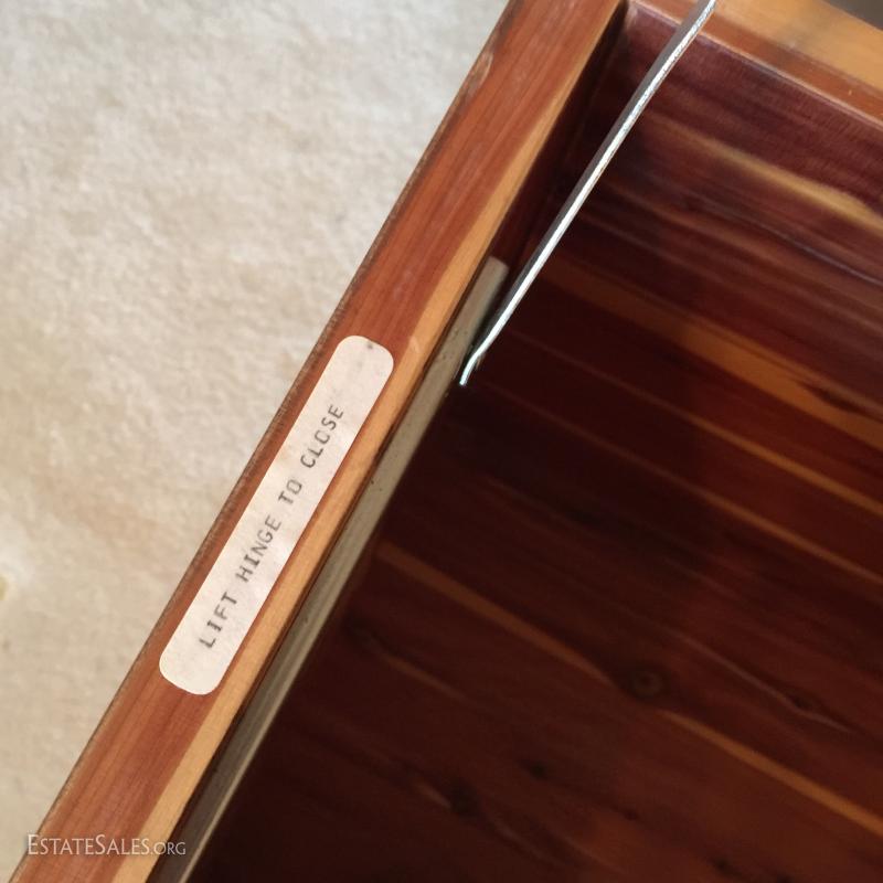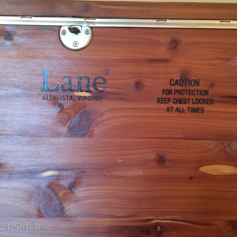 Lane Chest 47" L x 17" W x 22" H (38" H with lid open). Please note there is some damage to the right front base.