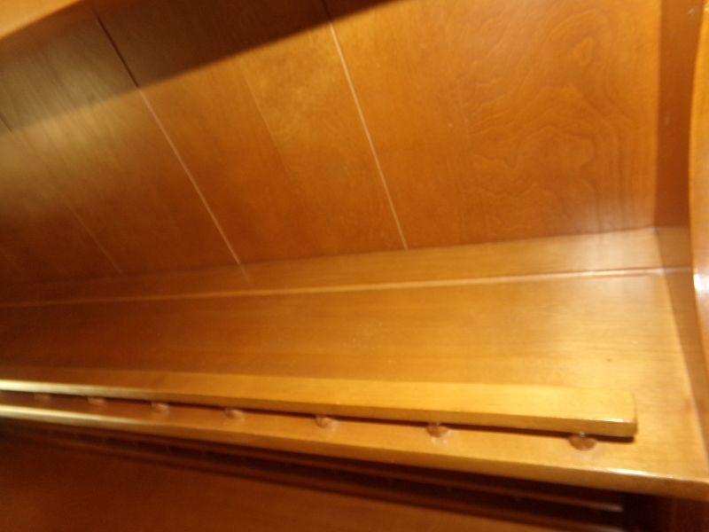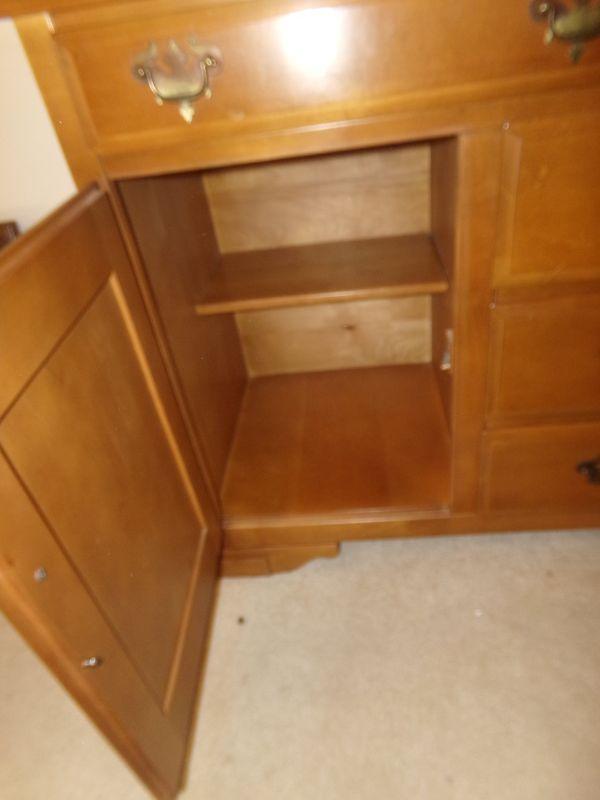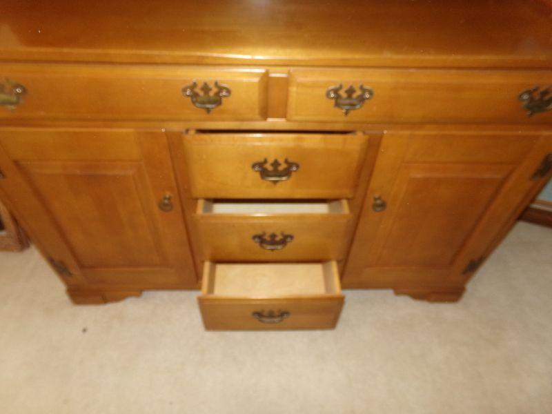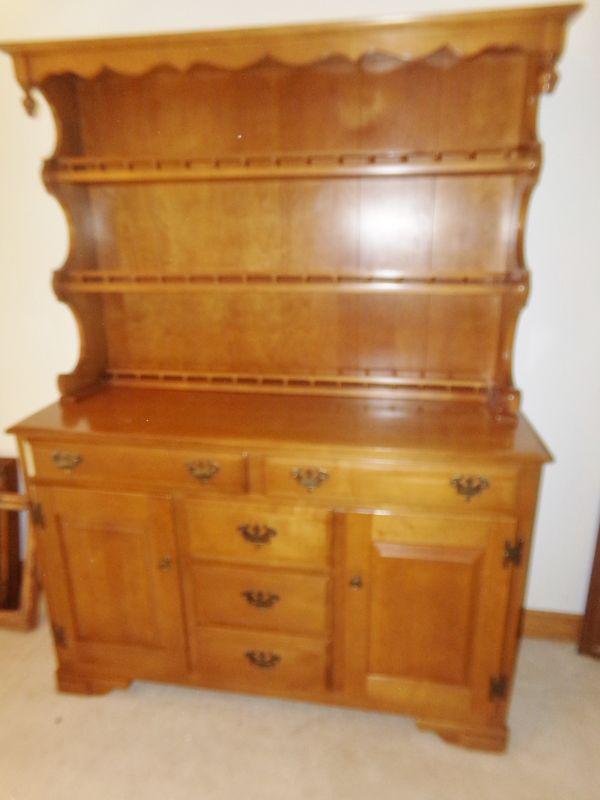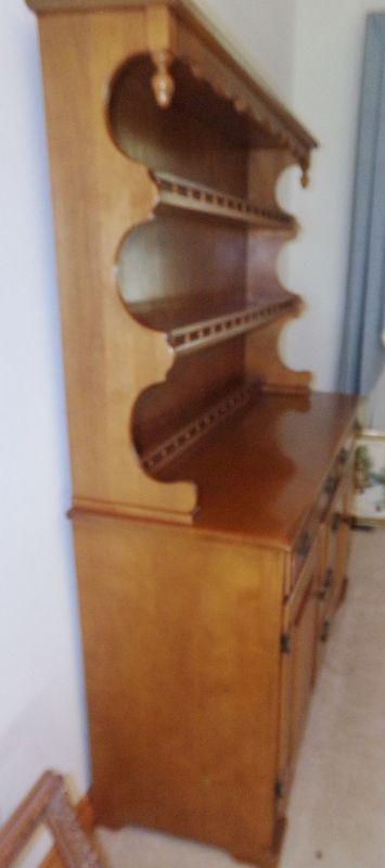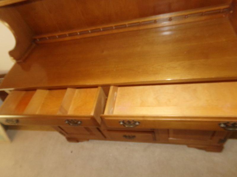 THE SHELVES ARE ROUTERED TO DISPLAY PLATES, ONE OF THE TOP DRAWERS IS DIVIDED FOR FLATWARE. THE TWO CUPBOARDS HAVE A SHELF AND THERE’S A TOTAL OF 5 DRAWERS