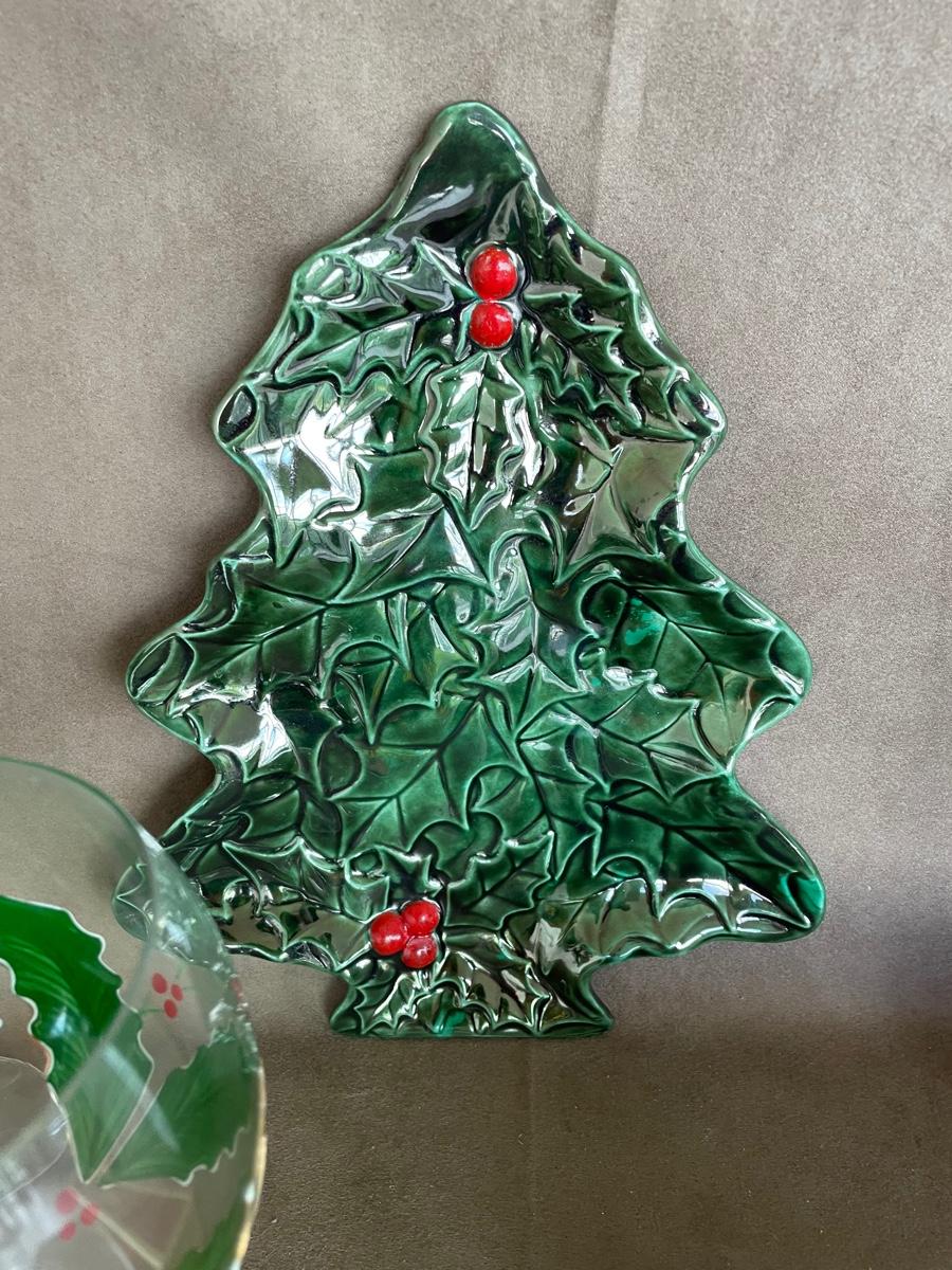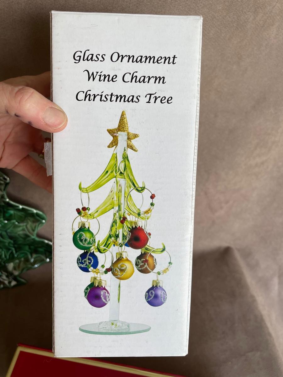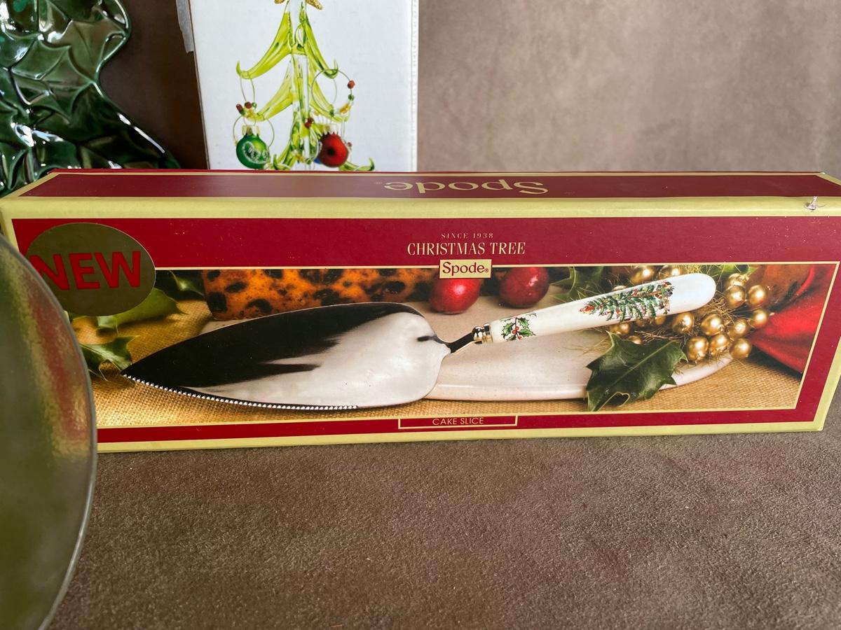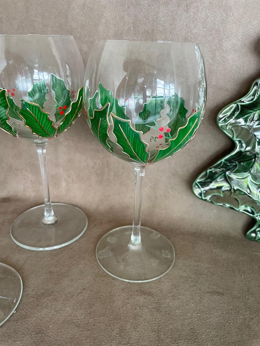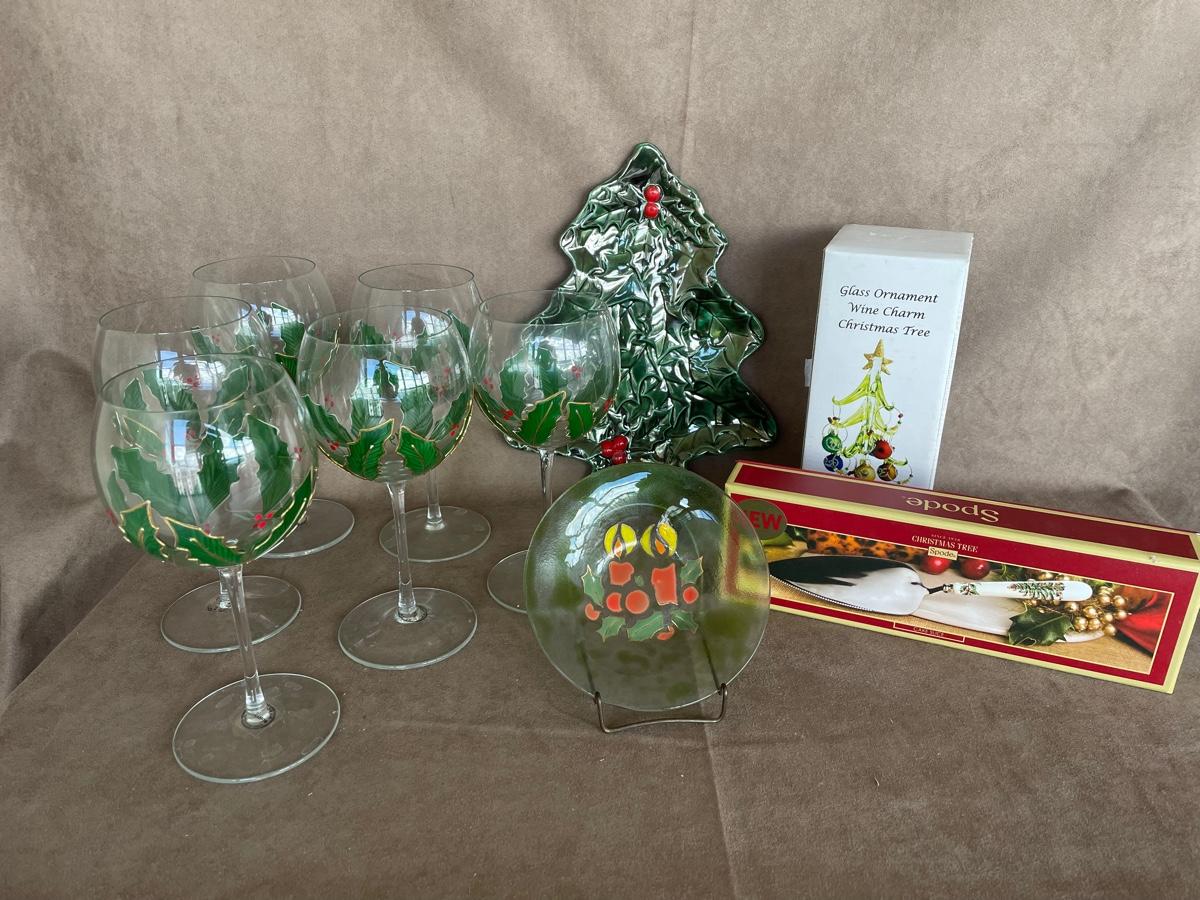 Spode cake server, two Christmas plates, 6 hand painted wine goblets and a wine charm Christmas tree