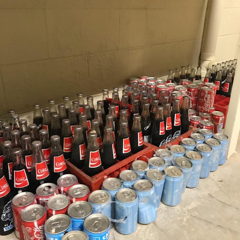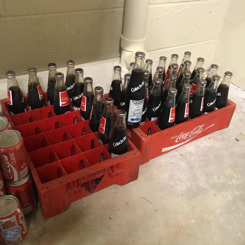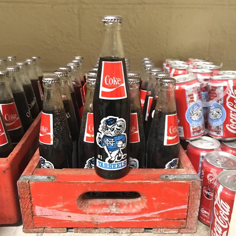 More than four full crates of full glass 10 oz “˜81-“˜82 NCAA Champions collector Coke bottles. More than three six packs of “Blue Soda” cans from 1982 and 1993 NCAA championship seasons. Collection also includes classic red cans with Tar Heels champions from 1993. Lot also includes three plastic Coca-Cola crates and one vintage wooden crate. See photos- There are a couple open cans and collection needs some cleaning, but overall a wonderful collectors lot! There are also a few closed cans where evaporation is noticeable. No shipping.