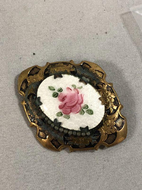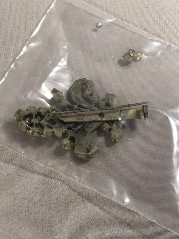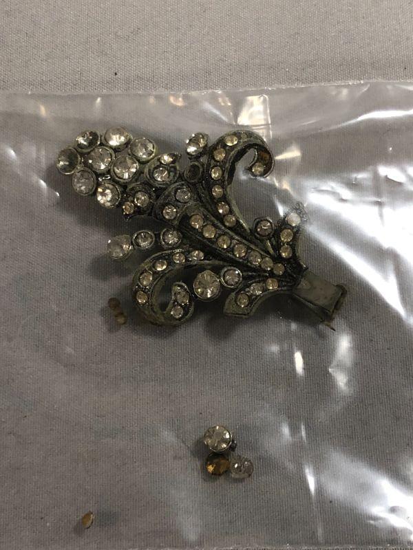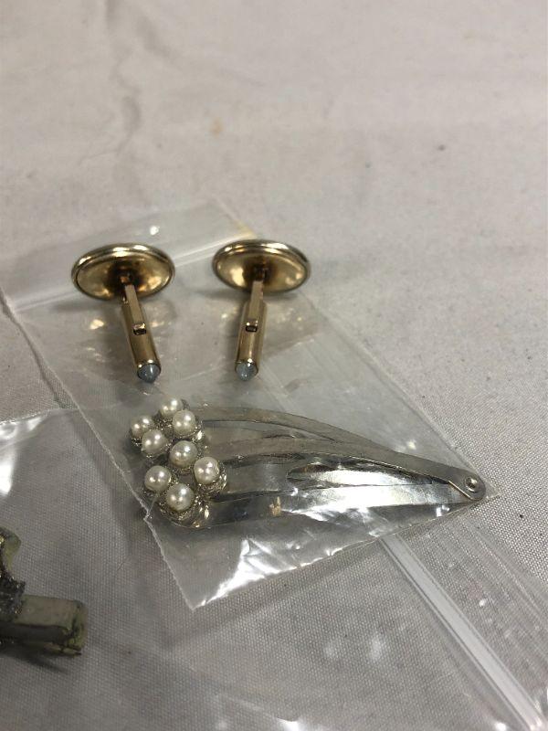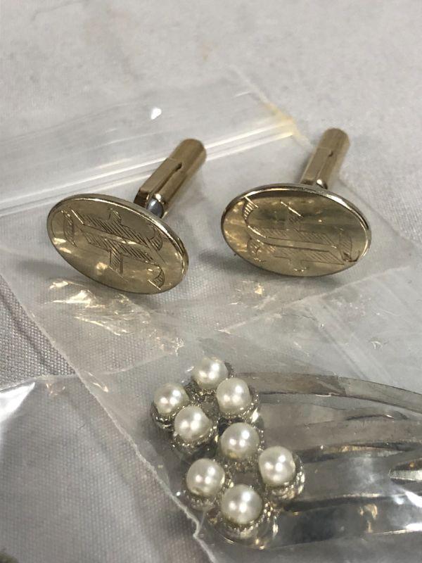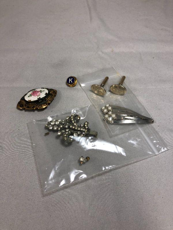 There is a pair of faux pearl accented hair clips, a pair of "F" engraved cufflinks, a vintage Kiwanis Key Club lapel pins, a rose brooch that is for repurpose purposes because the pin on the back is missing. There is also a silver colored metal fleur de lis brooch that has a few rhinestones that have fallen out. Most are still in the bag and just needs to be replaced.