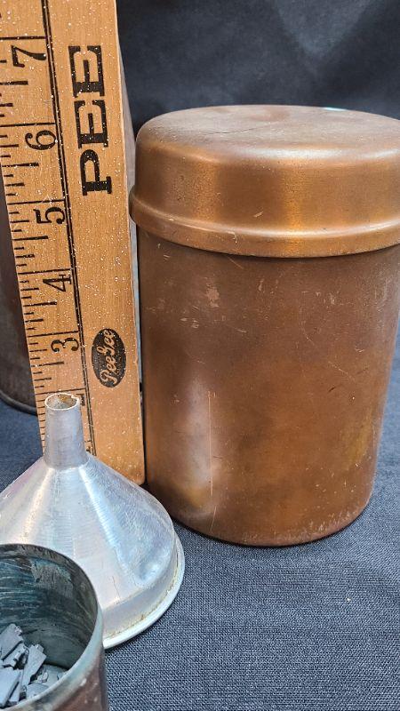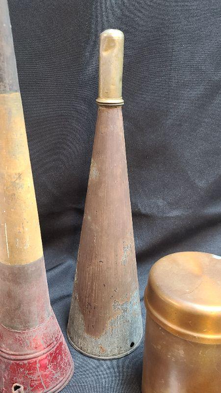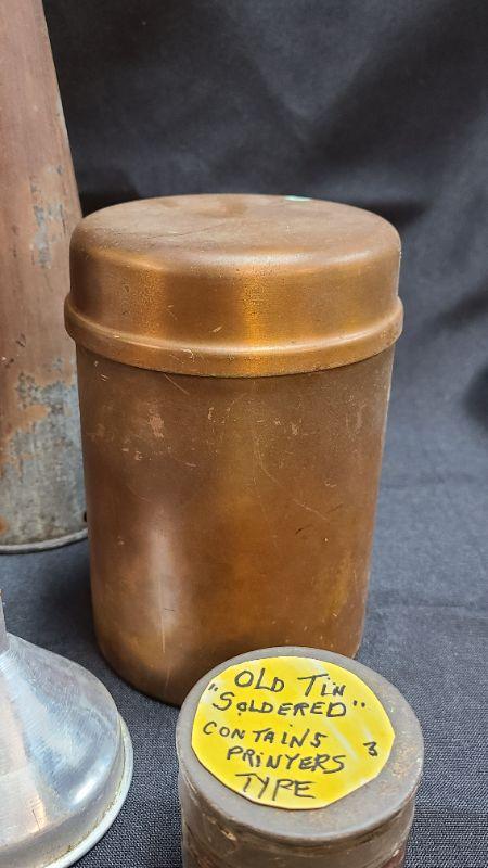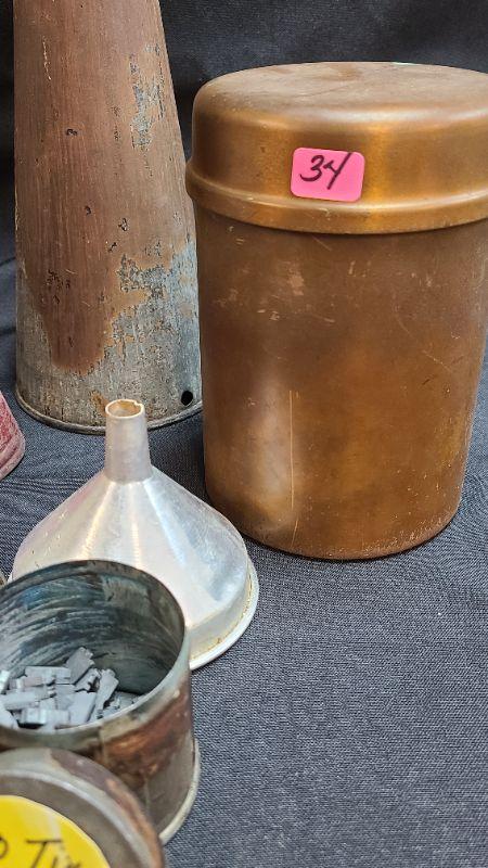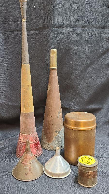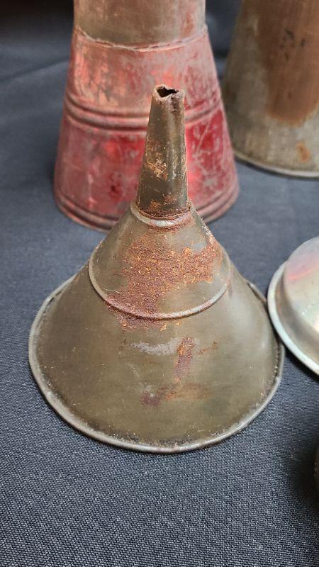 Antique lot of metal decor and funnels. Please see all pictures for condition of the items listed and what is included in the lot. Pictures will also show any measurements if taken and is the best representation of the items. Thank you for looking and have fun bidding! We appreciate Treasure Hunters!