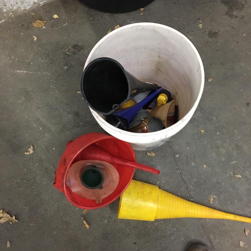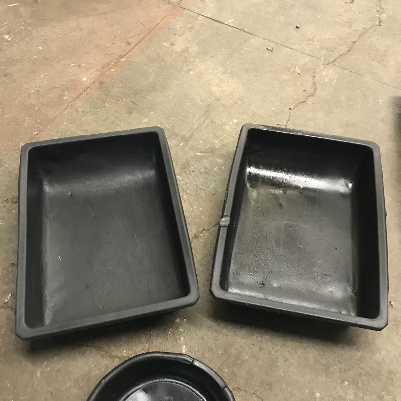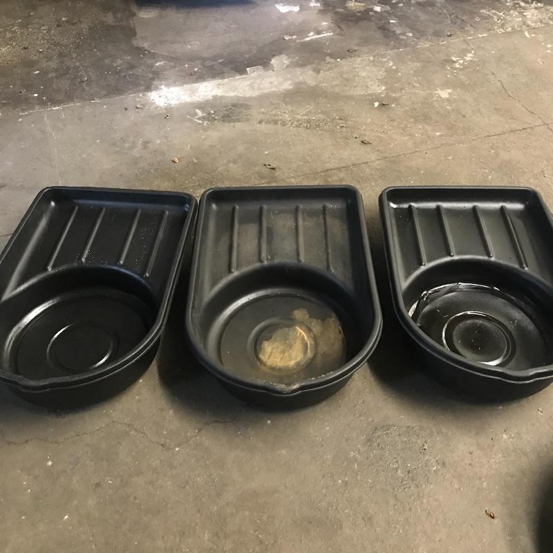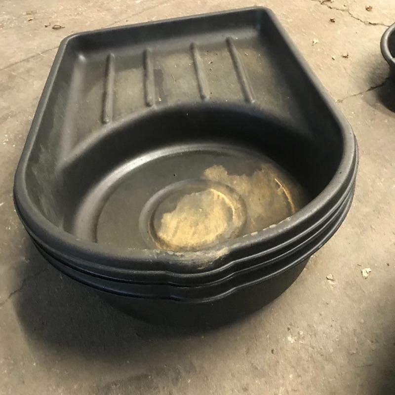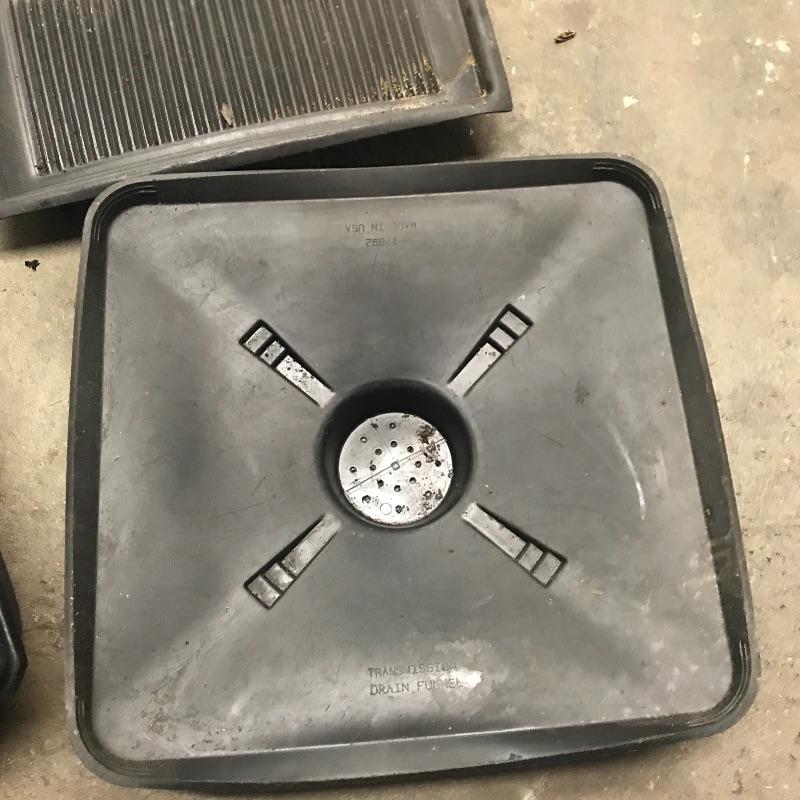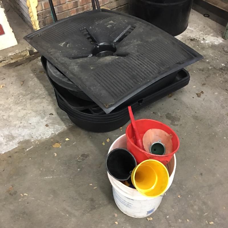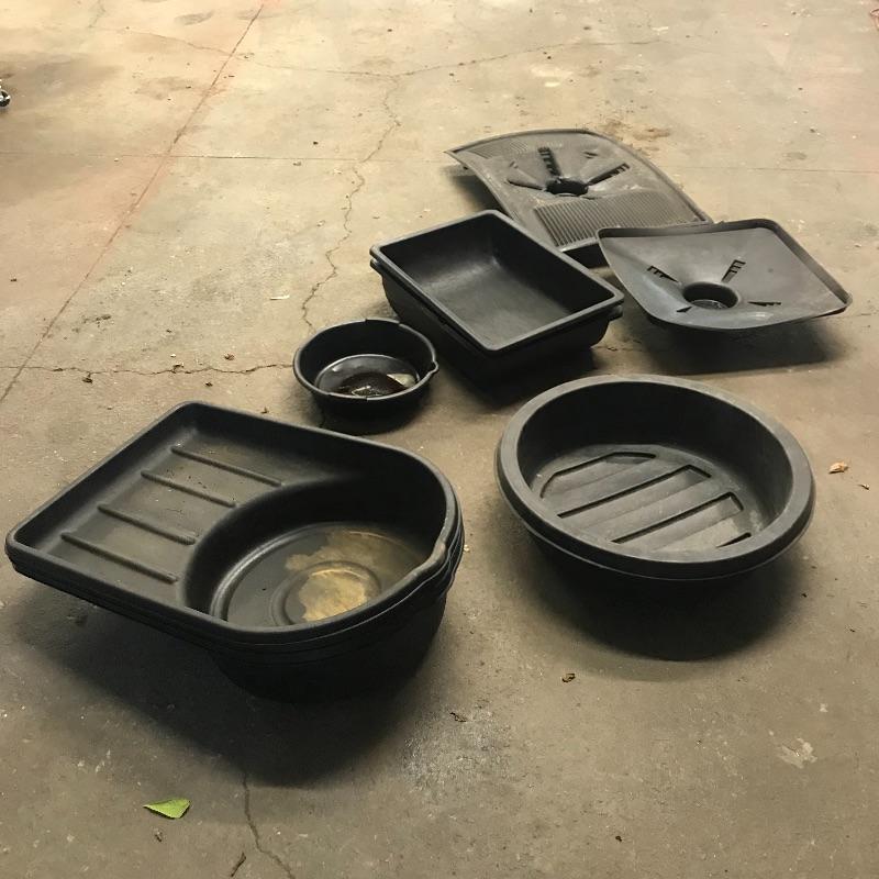 Selection of drain pans, strainers and funnels used mostly with transmission fluid. All are used but in good shape. Largest three pans measure 33.5x22.5”. Largest strainer 38”x25”.