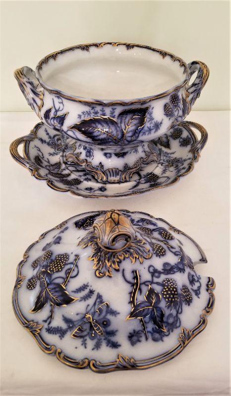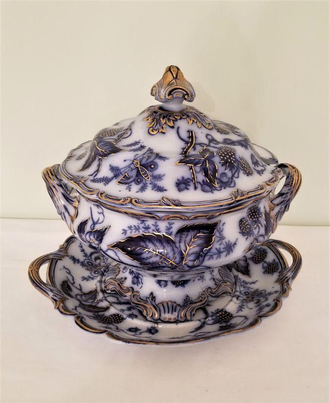 Lot #34  GORGEOUS Antique Flow Blue Tureen with Underplate - excellent condition