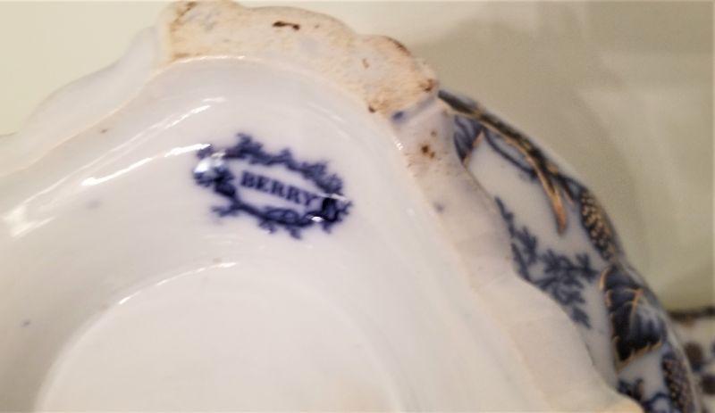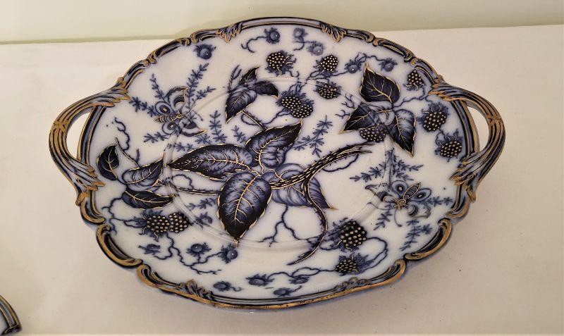 This is one of my favorite items in the sale. EXCELLENT condition - gorgeous color, etc. Tureen with lid and underplate, measures 14.75" handle to handle, 1 Foot tall. Features dewberries, foliage and butterflies. English Flow Blue China - ca. 1880. Not surprisingly, the pattern is called "BERRY."