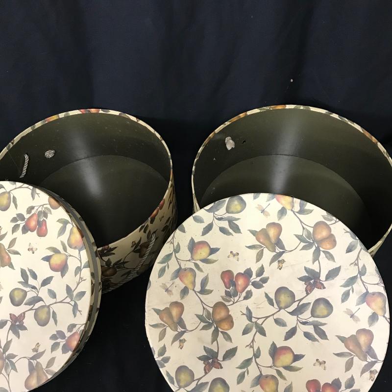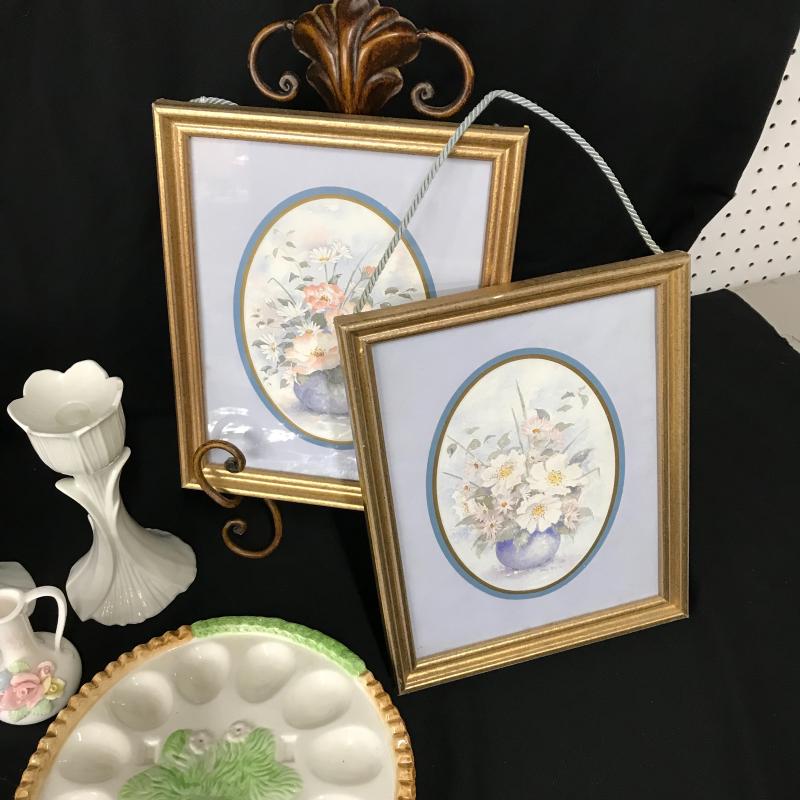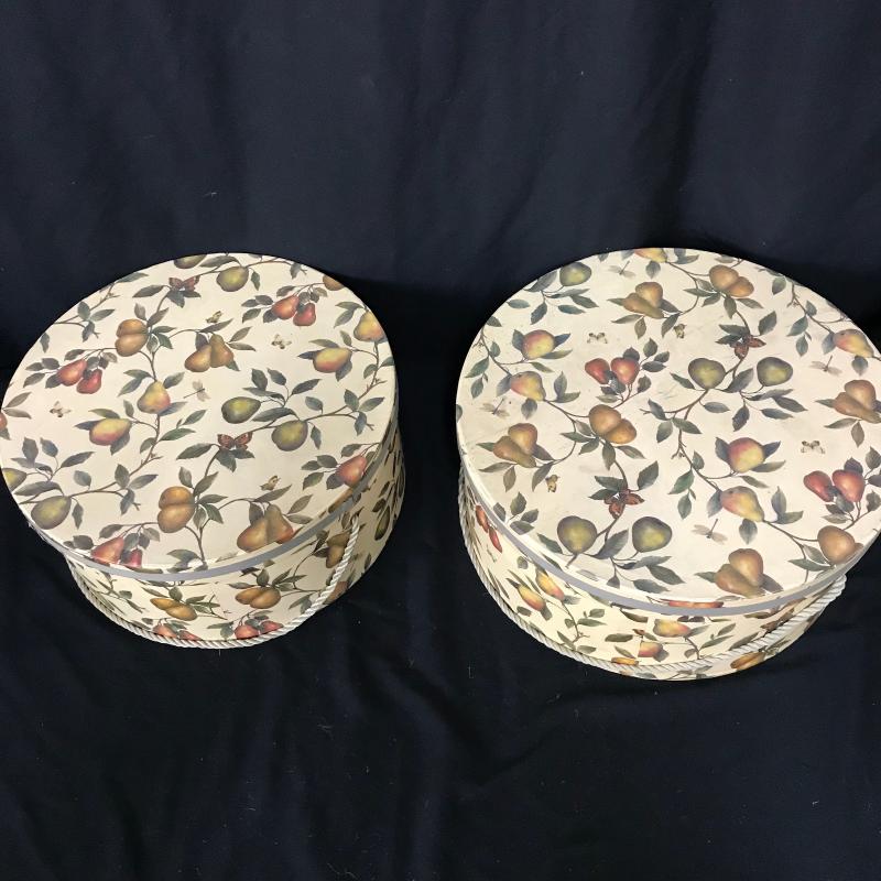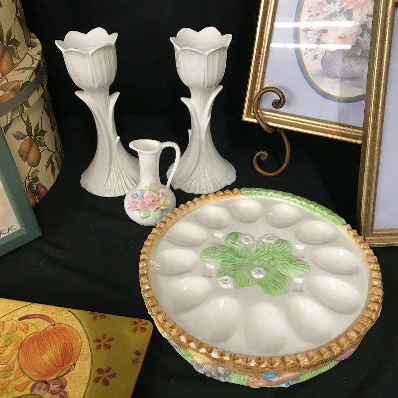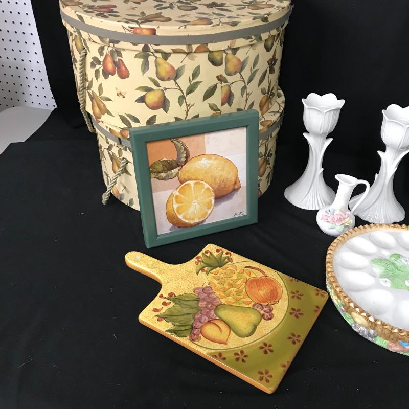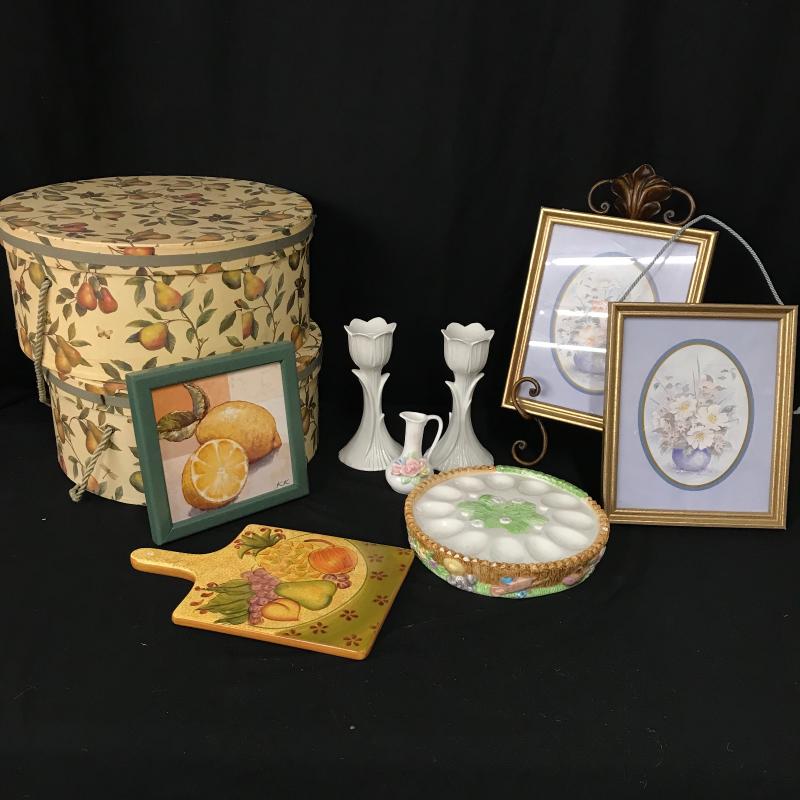 Two nesting hat boxes with pear decor on outside, Pair of cream colored ceramic candle holders made in Portugal, small bud vase pitcher, two framed prints that measure 11” x 9”, ceramic cutting board, egg plate and more. Large hat box measures 16” dia. and stands 7.5” tall. Lot is available for local pick up in Maggie Valley, NC only.
