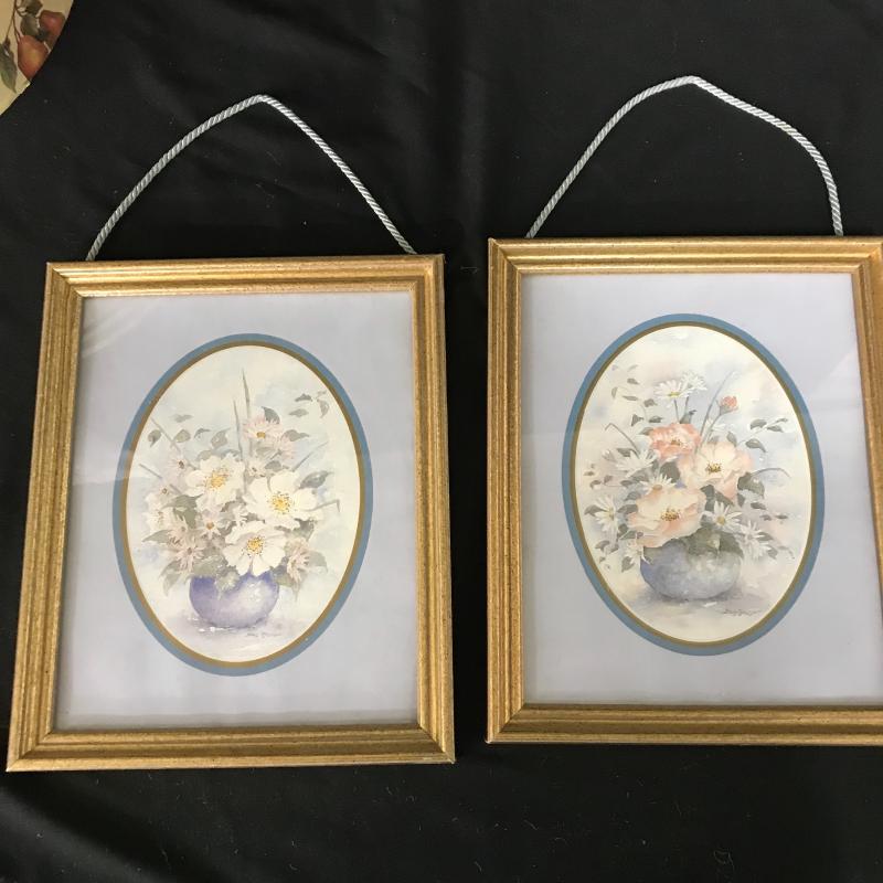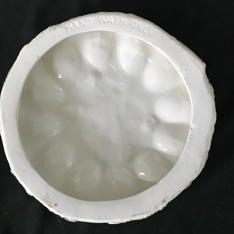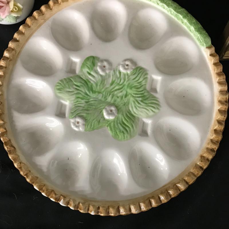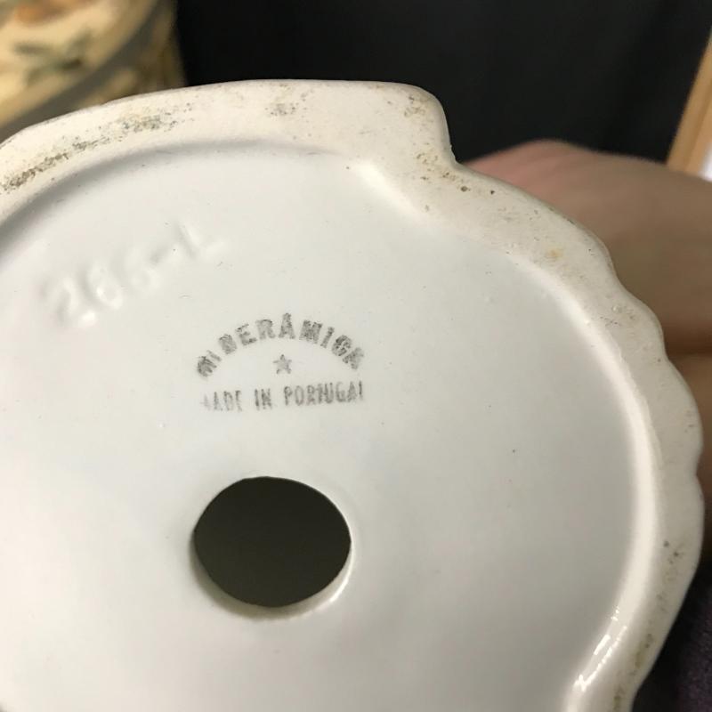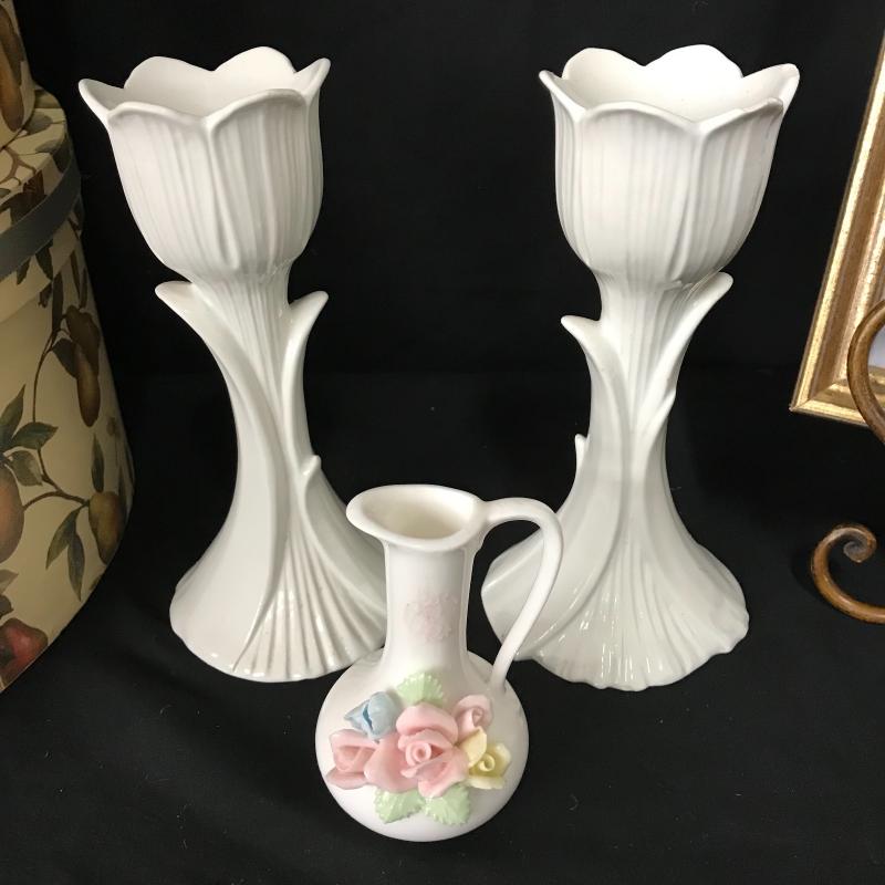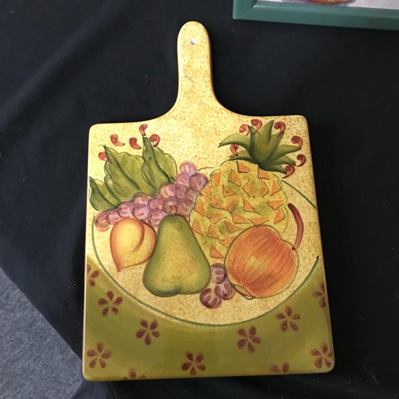 Two nesting hat boxes with pear decor on outside, Pair of cream colored ceramic candle holders made in Portugal, small bud vase pitcher, two framed prints that measure 11” x 9”, ceramic cutting board, egg plate and more. Large hat box measures 16” dia. and stands 7.5” tall. Lot is available for local pick up in Maggie Valley, NC only.