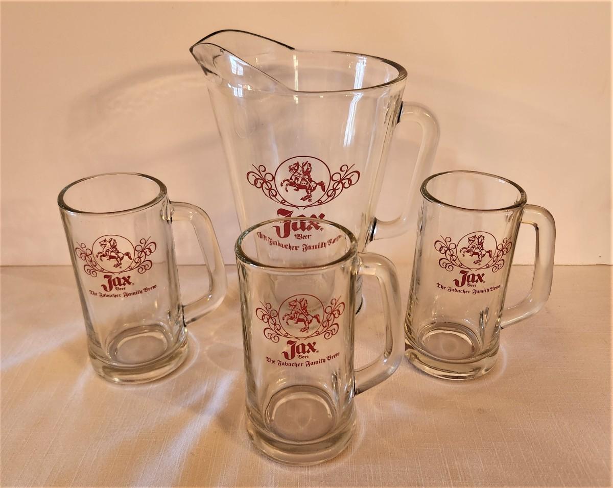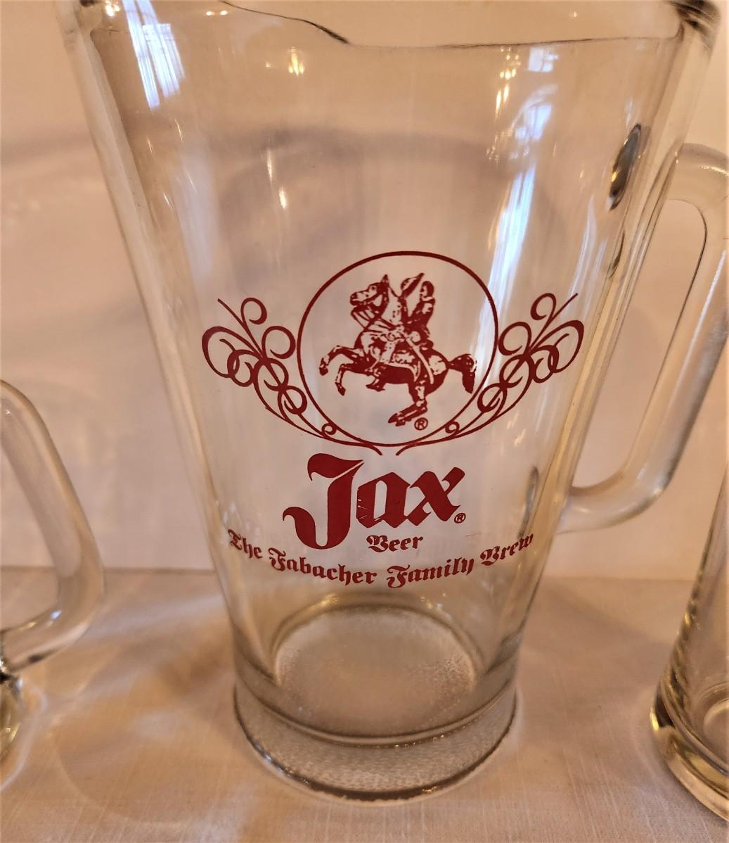 Vintage JAX Beer Pitcher and 3 vintage mugs - mugs 5.5" tall, pitcher 9" tall at lip. You can feel a tiny flea bite inside spout with your finger - not visible (you have to feel it) - otherwise good.