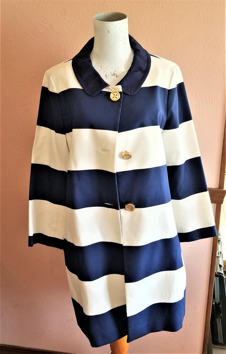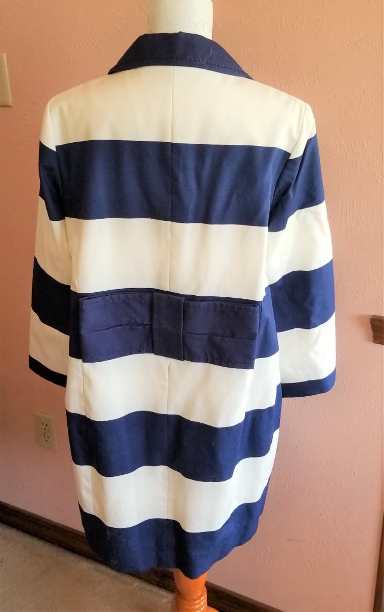 Stylish KATE SPADE polished cotton blue/white coat - 16" across at shoulders, sleeves are 21.25" long, Coat is 34" long - Size Medium. Bow accent on back. A couple of TINY spols (as shown) - we have not tried to clean. Gently worn condition.