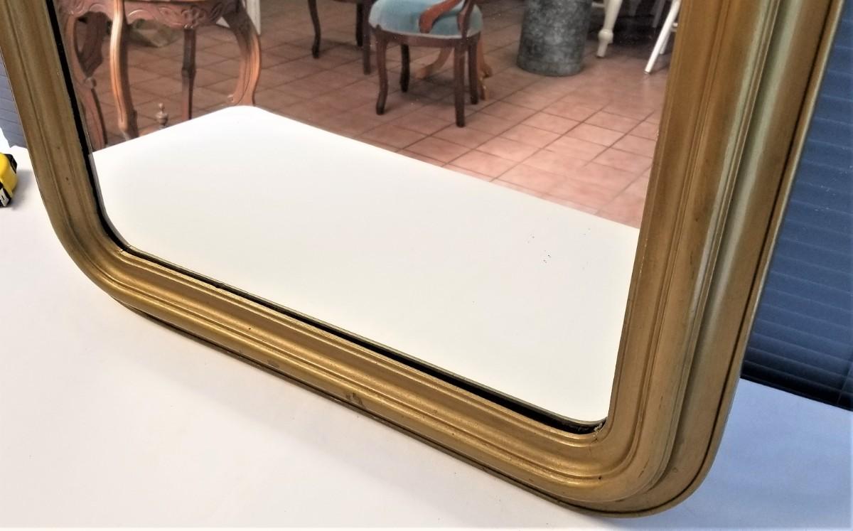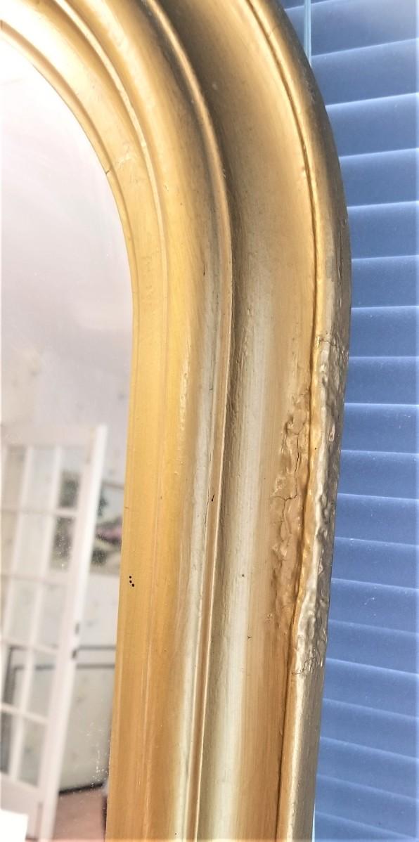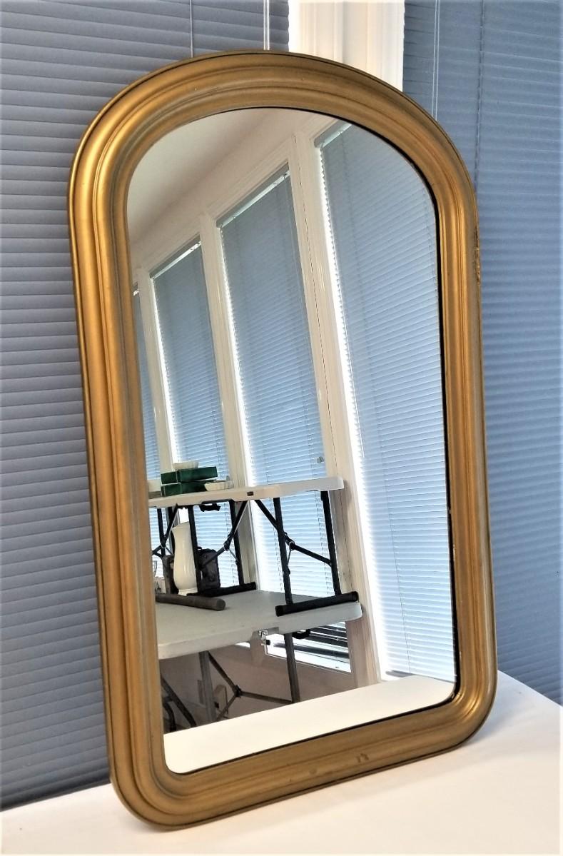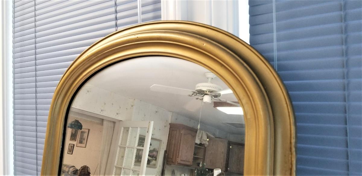 Large oval wall mirror, classic design, heavy. Frame/back is wood. Has some age to it. 25" wide, 41" tall. Note photo of old repair to the frame. Not especially noticeable. but I wanted to point it out.