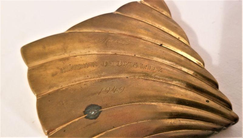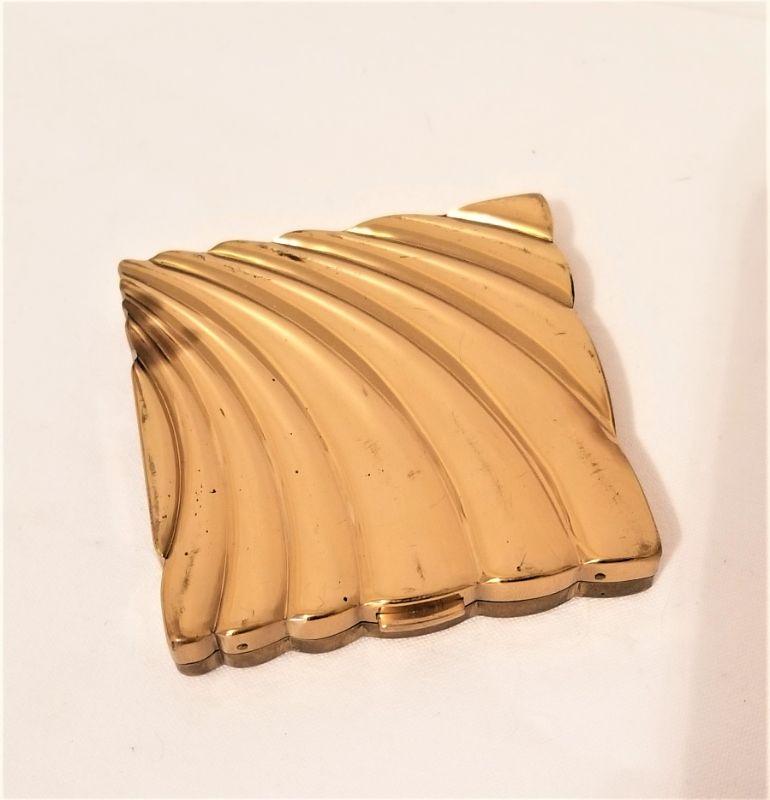 Neat little favor given in 1949 to a Maid in the Krewe of Omardz - brass cigarette box (we got rid of the cigarettes) - box is engraved on the reverse "Maid - Krewe of Omardz - 1949) Measures 3" x 3". Some discoloration on the back - inside looks good.