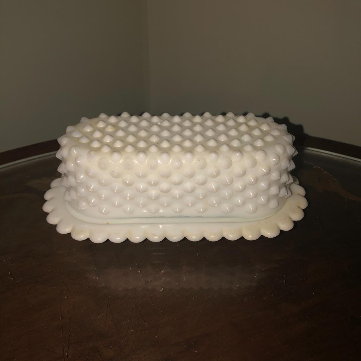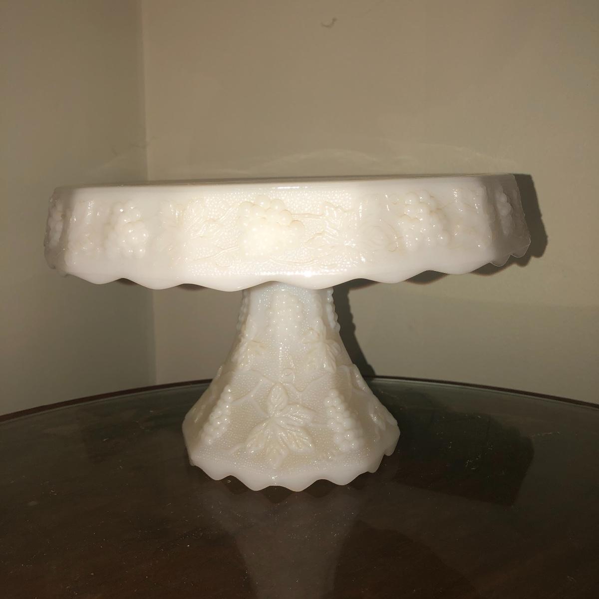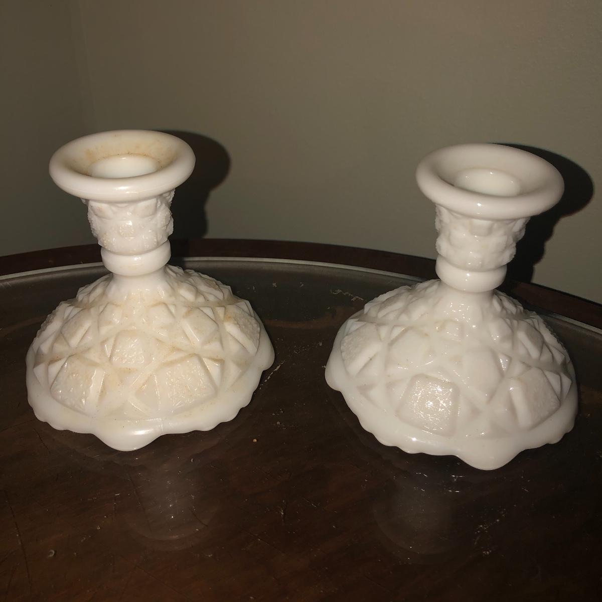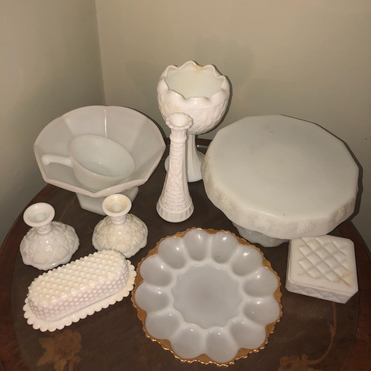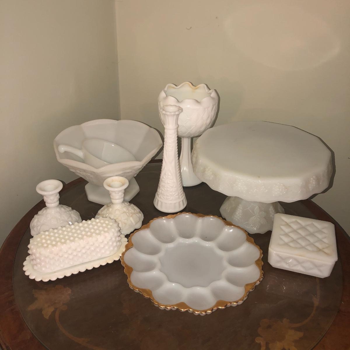 Lot of various milk glass ware. Includes a cake stand measuring approximately 11.25” x 6.5”, a deviled egg tray, candle stick holders, a butter dish, vase, a small square dish with lid, and footed bowl.