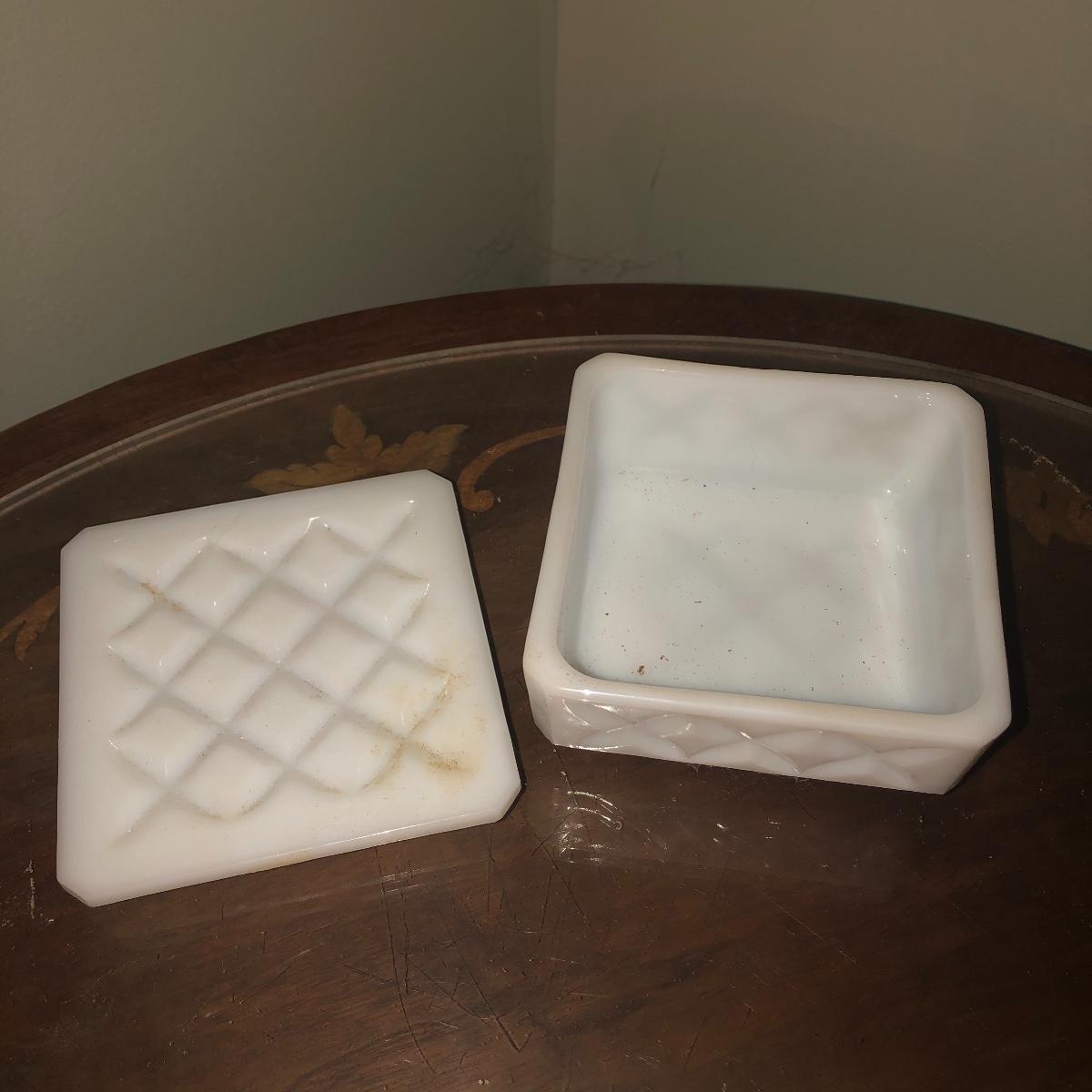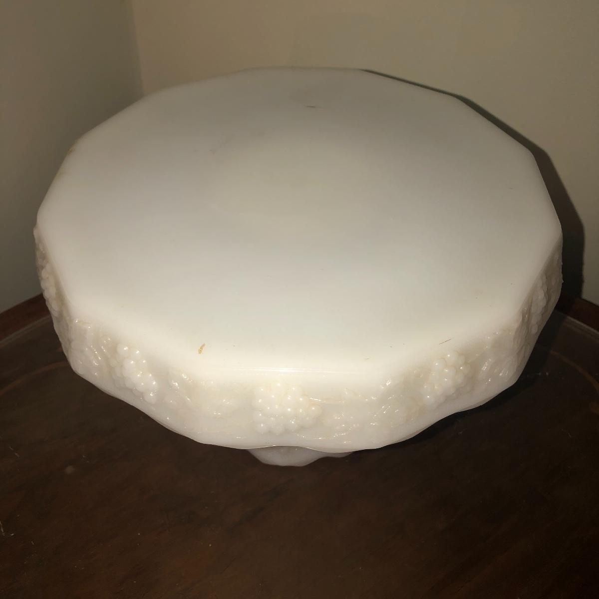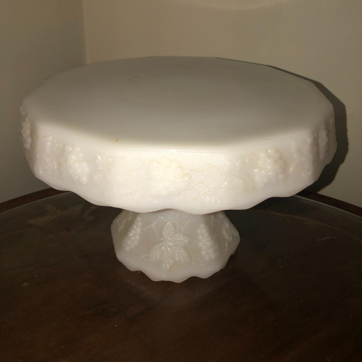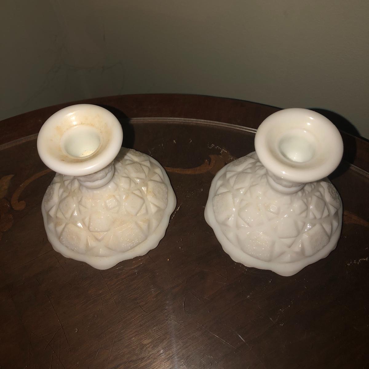 Lot of various milk glass ware. Includes a cake stand measuring approximately 11.25” x 6.5”, a deviled egg tray, candle stick holders, a butter dish, vase, a small square dish with lid, and footed bowl.