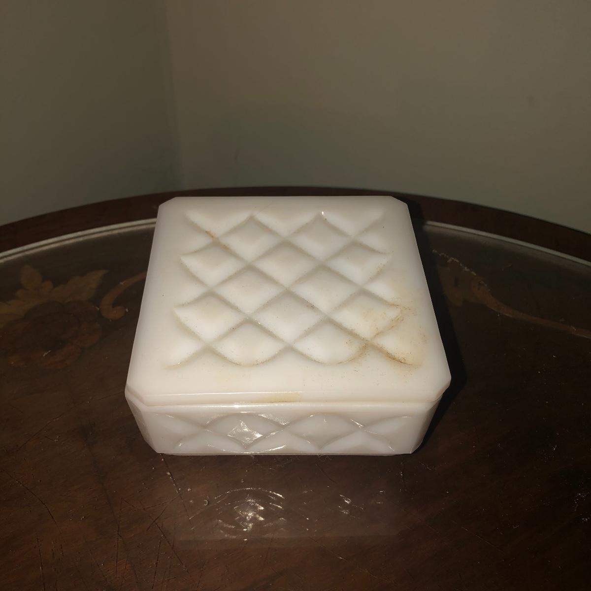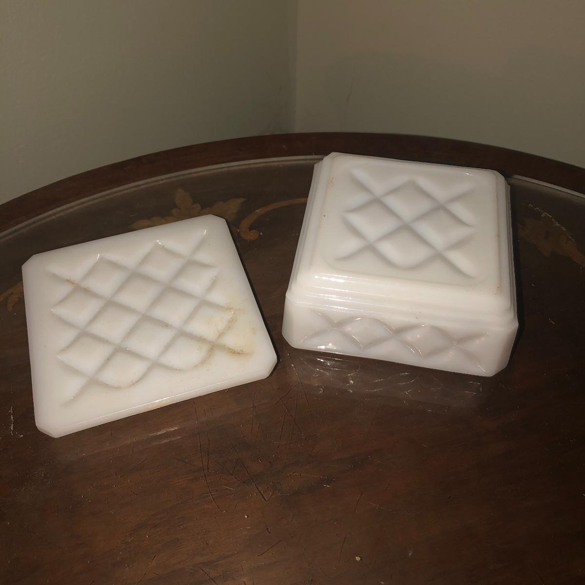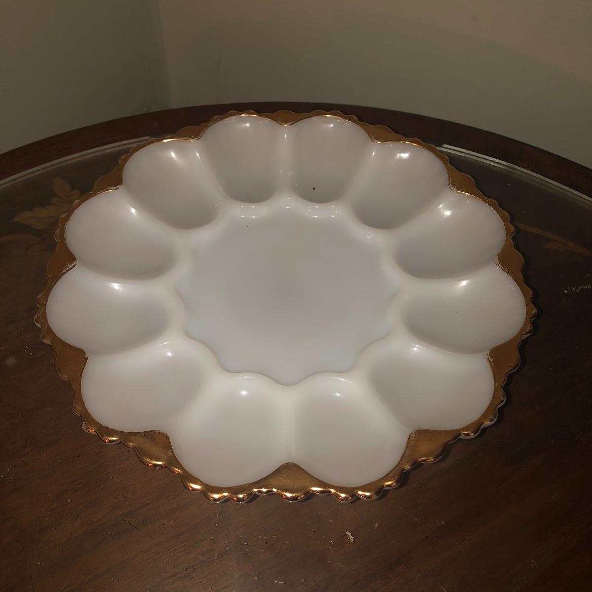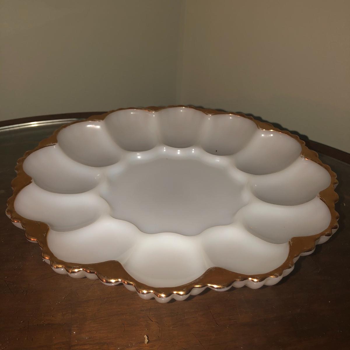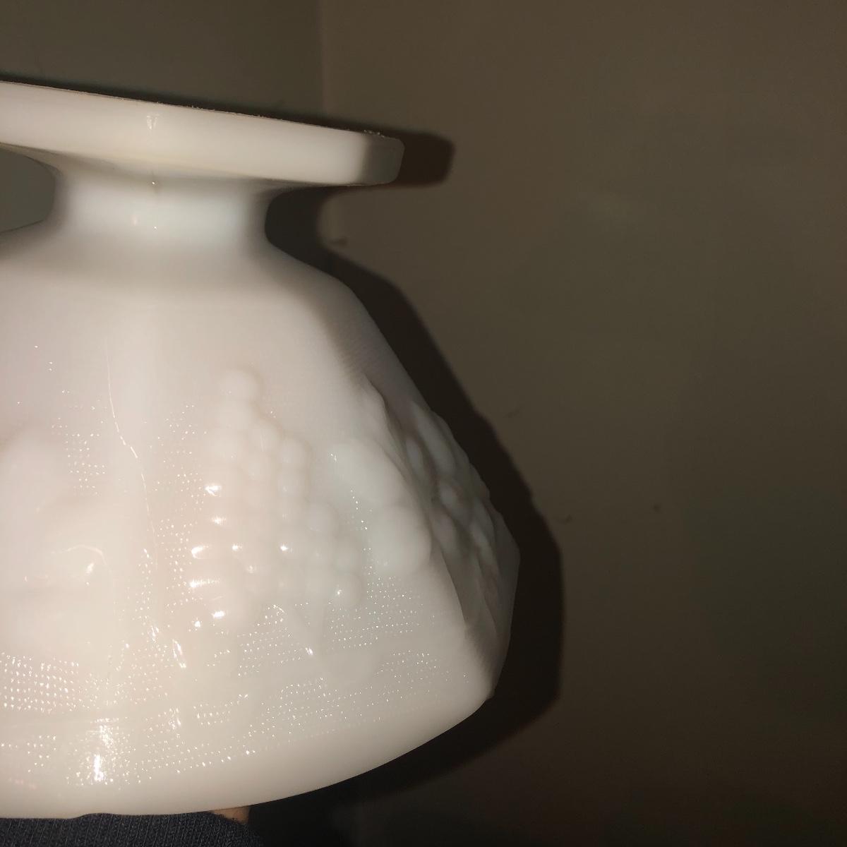 Lot of various milk glass ware. Includes a cake stand measuring approximately 11.25” x 6.5”, a deviled egg tray, candle stick holders, a butter dish, vase, a small square dish with lid, and footed bowl.