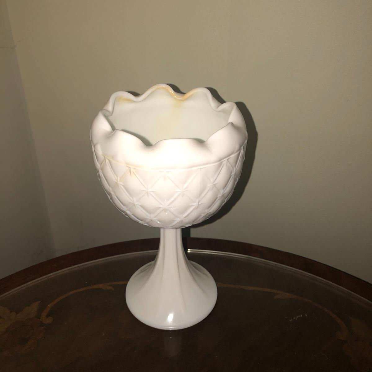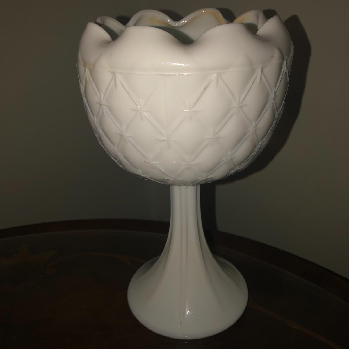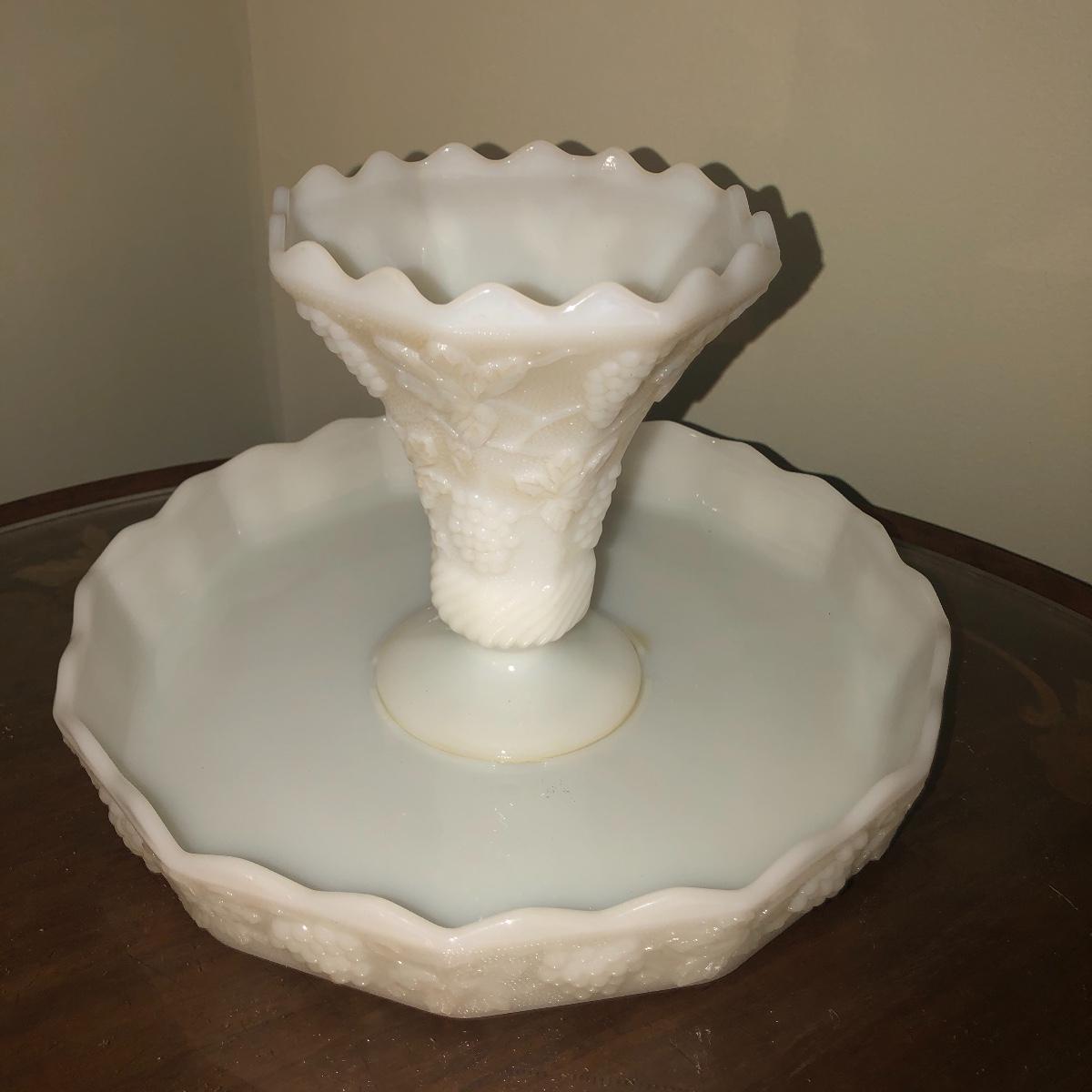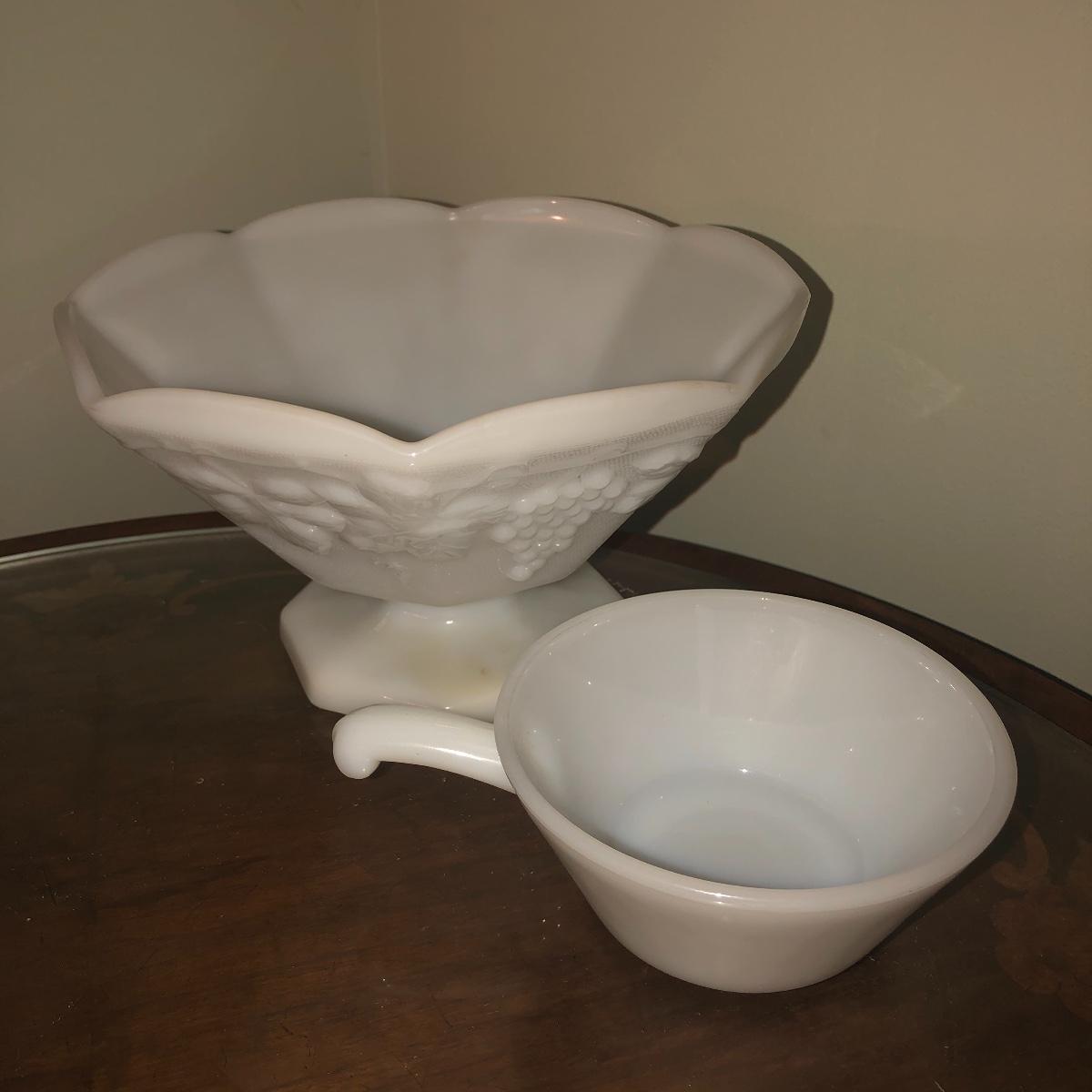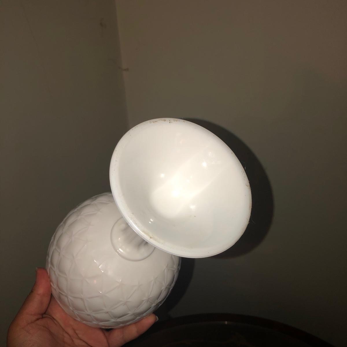 Lot of various milk glass ware. Includes a cake stand measuring approximately 11.25” x 6.5”, a deviled egg tray, candle stick holders, a butter dish, vase, a small square dish with lid, and footed bowl.