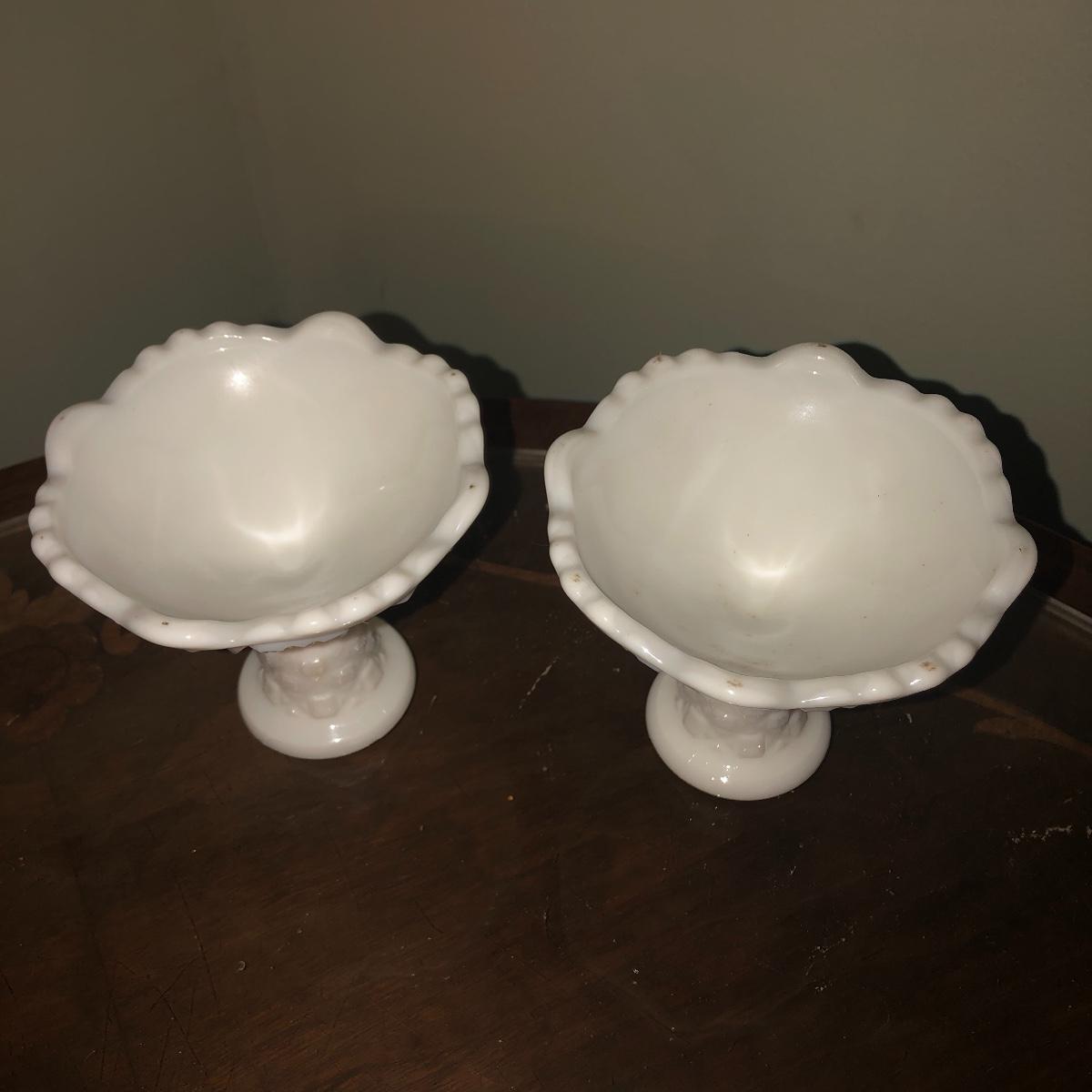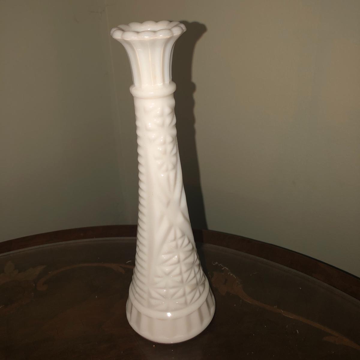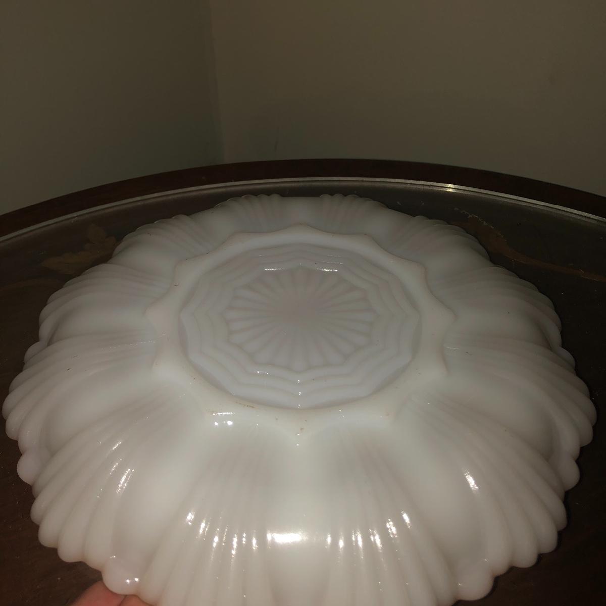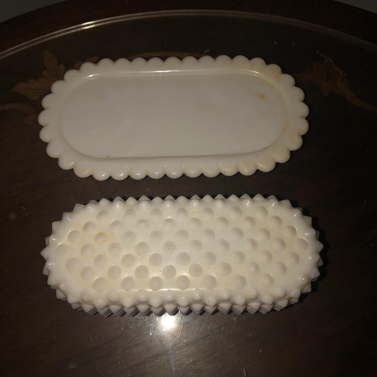 Lot of various milk glass ware. Includes a cake stand measuring approximately 11.25” x 6.5”, a deviled egg tray, candle stick holders, a butter dish, vase, a small square dish with lid, and footed bowl.