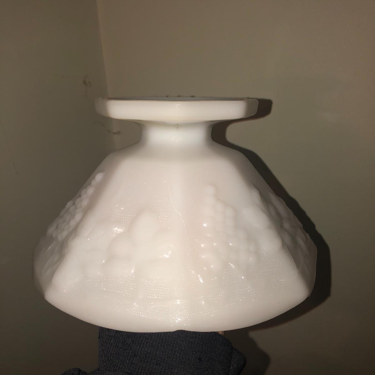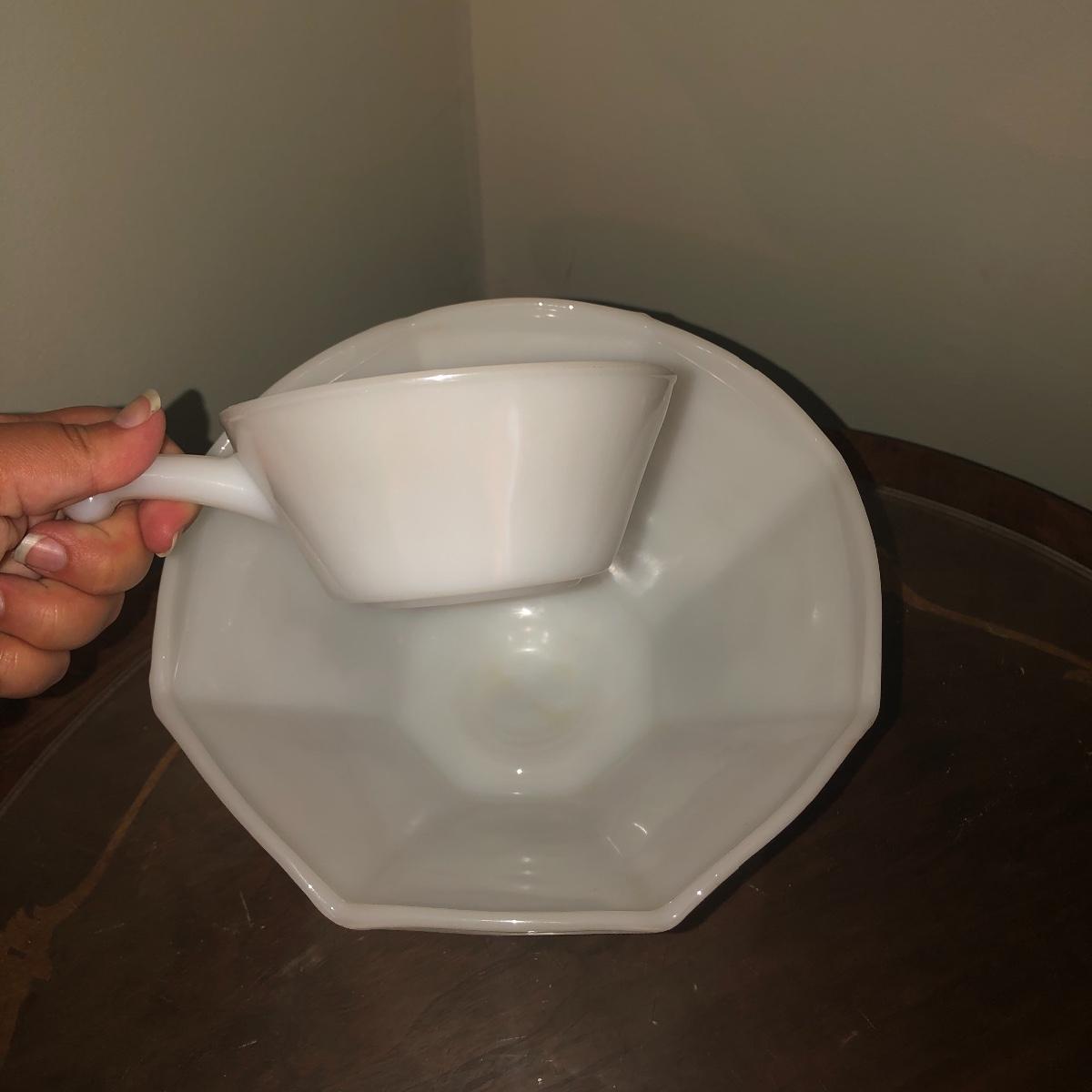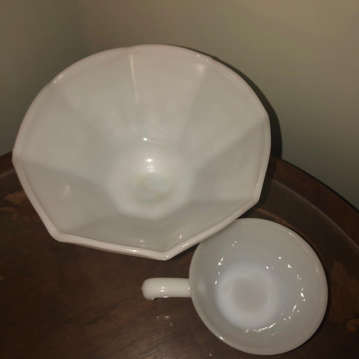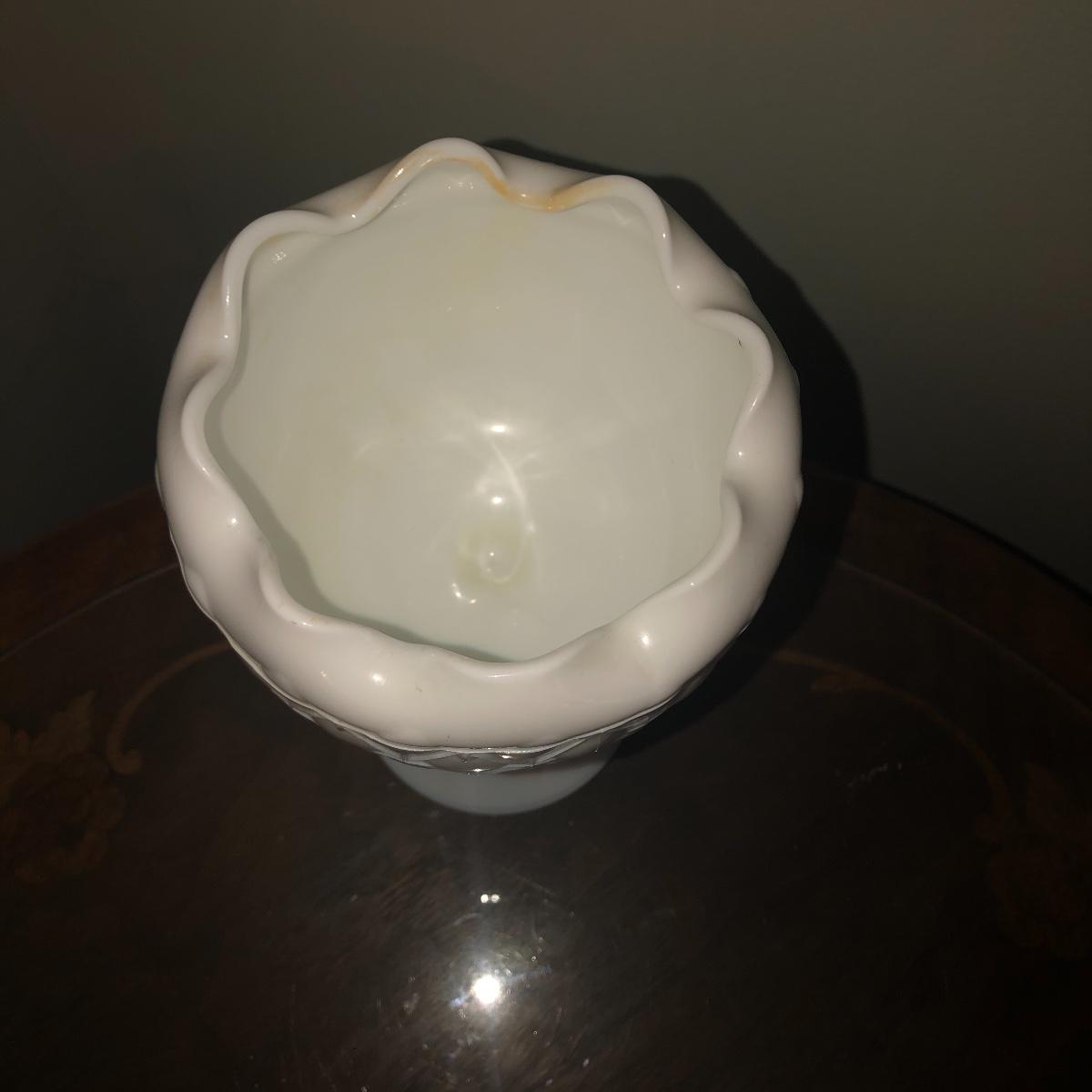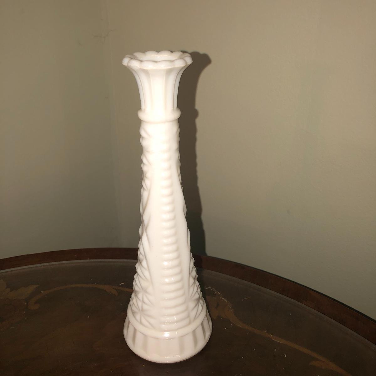 Lot of various milk glass ware. Includes a cake stand measuring approximately 11.25” x 6.5”, a deviled egg tray, candle stick holders, a butter dish, vase, a small square dish with lid, and footed bowl.