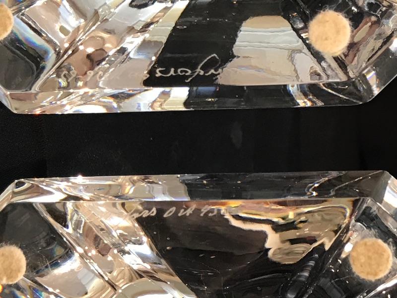 Candlesticks are signed Orrefors on the bottom, they measure 7-1/2” high and 4-1/4 in diameter. They are Regina Olle Alerius design. No chips or cracks
